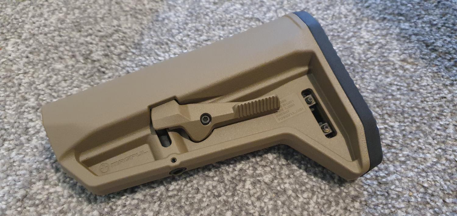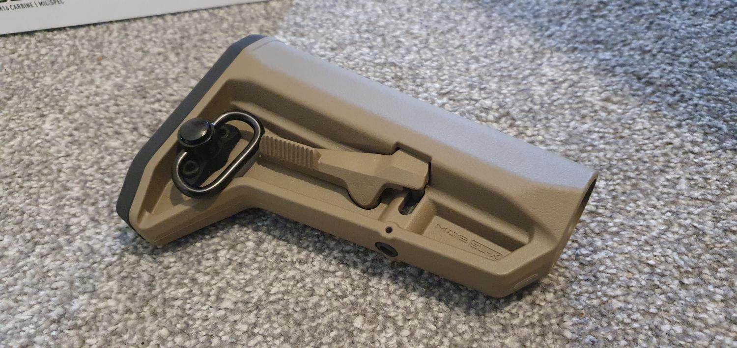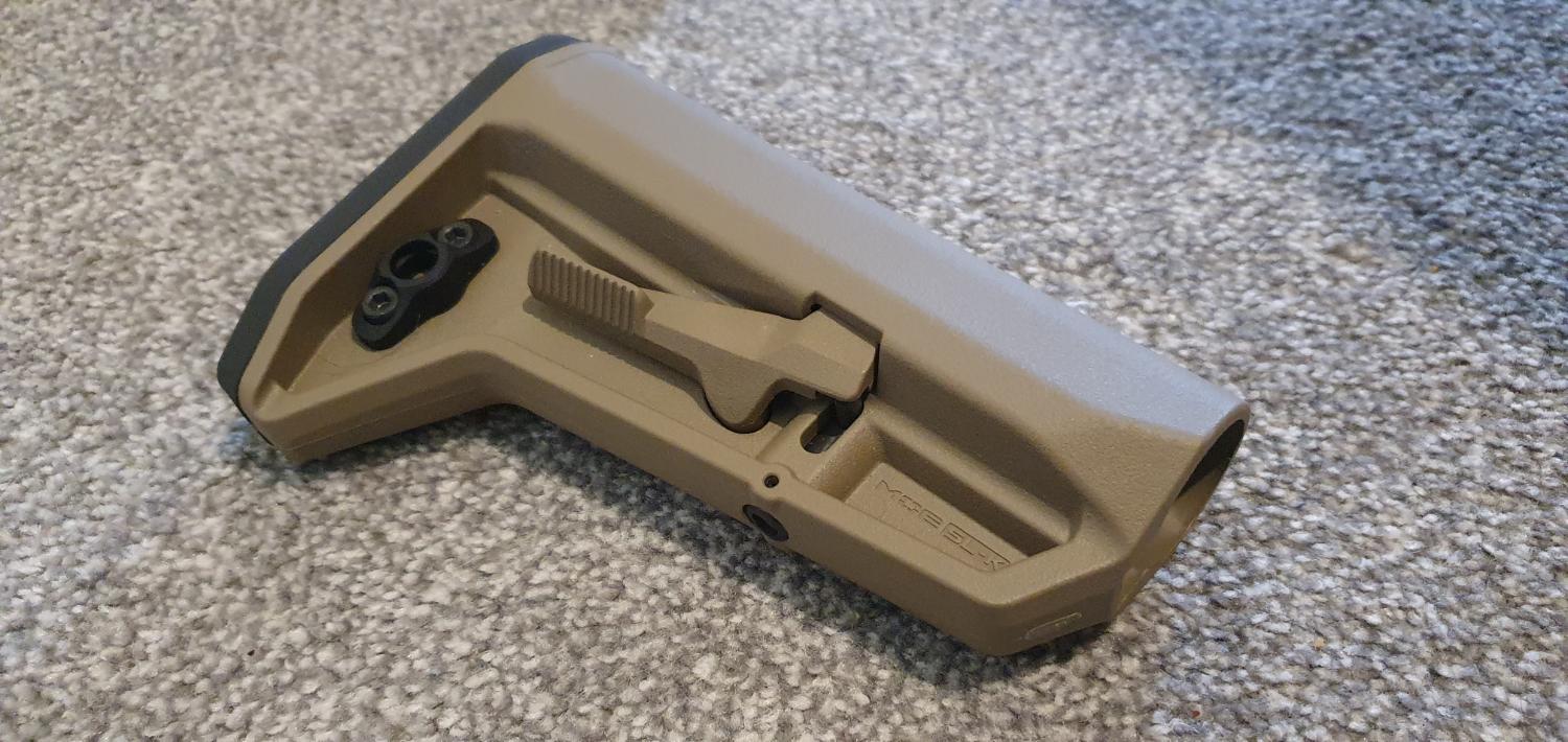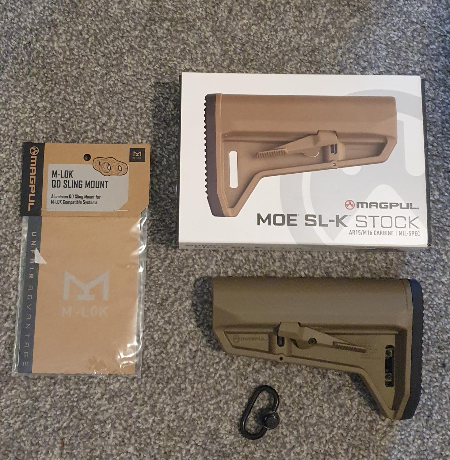 Genuine Magpul SL-K stock in flat dark earth, fitted with a genuine magpul M-LOK QD sling mount, and a Wadsn Steel QD sling swivel.