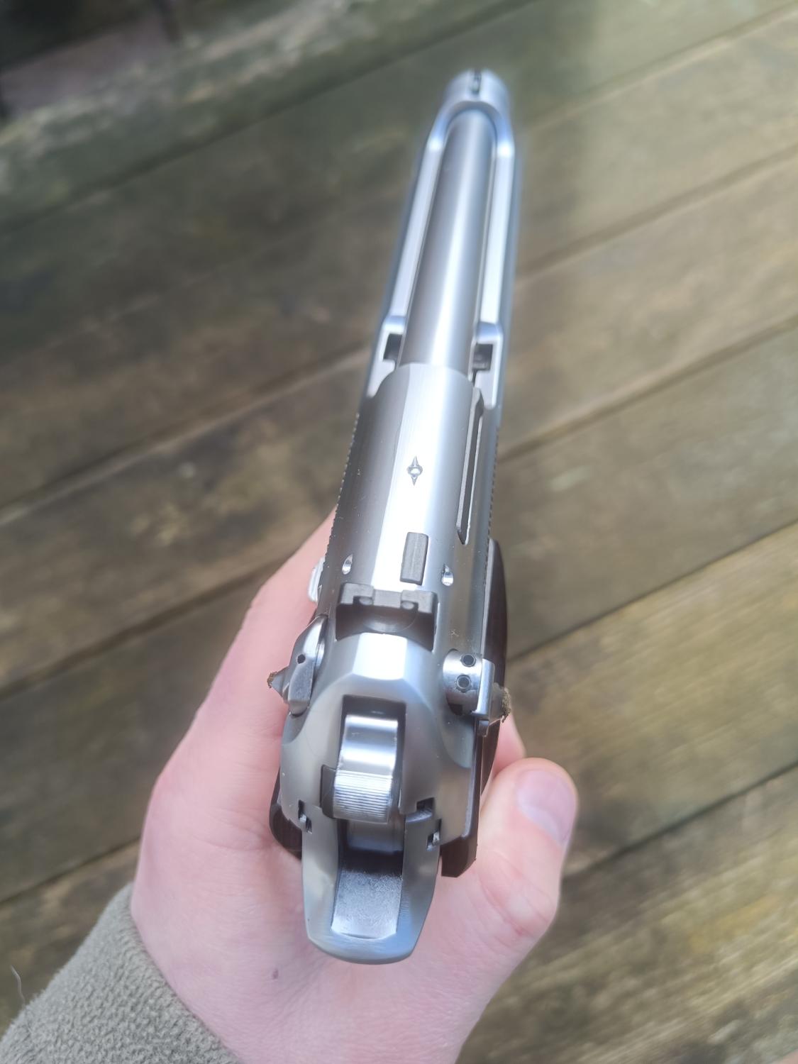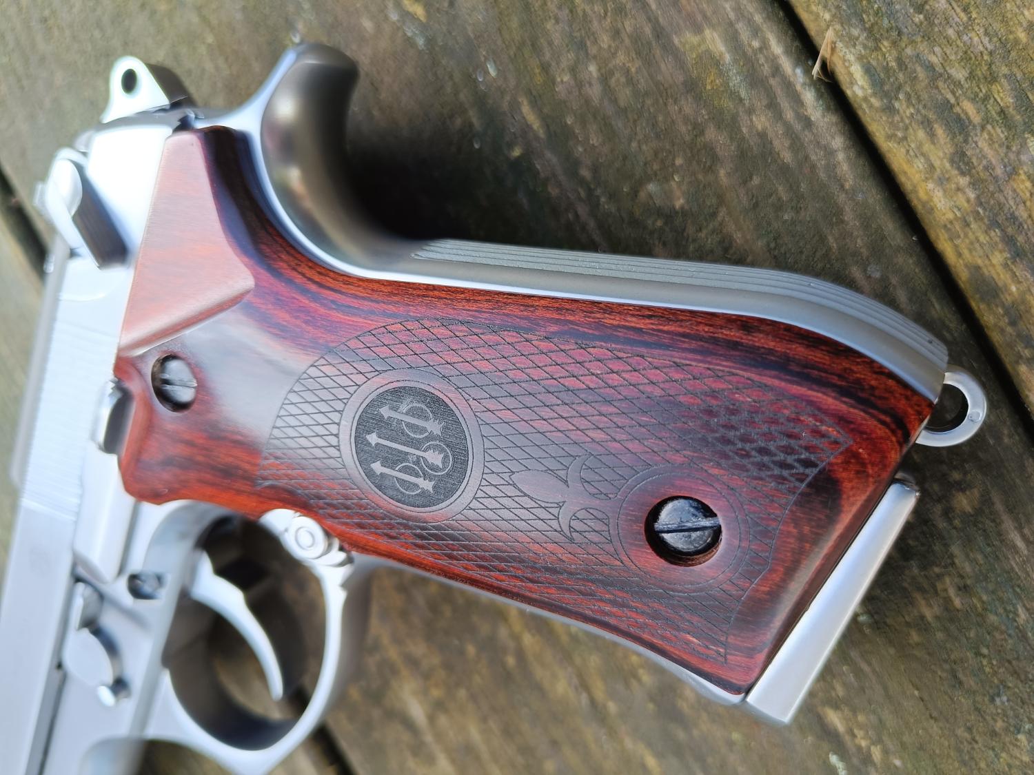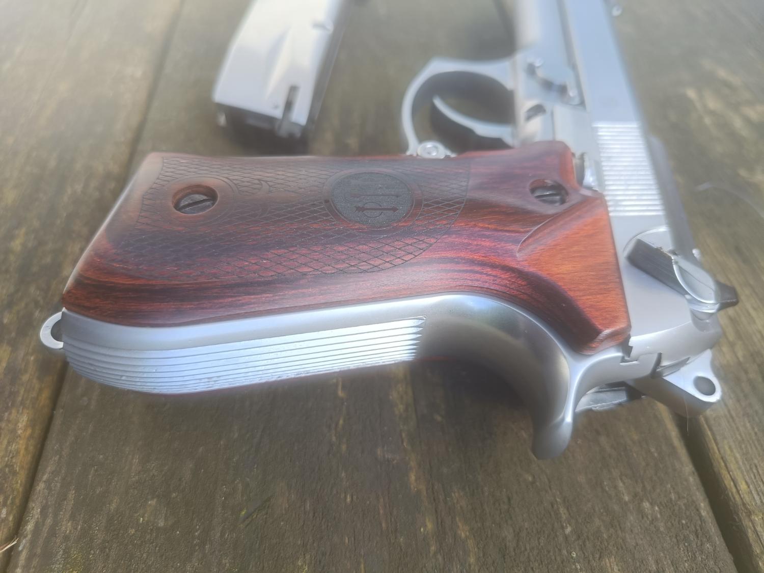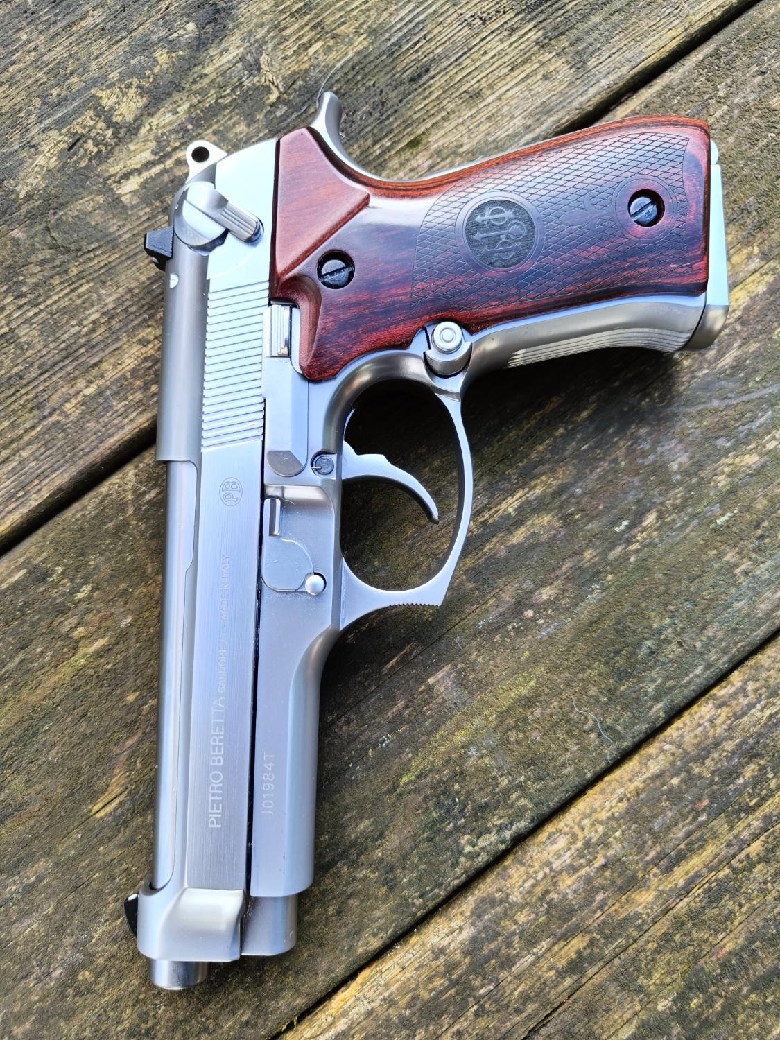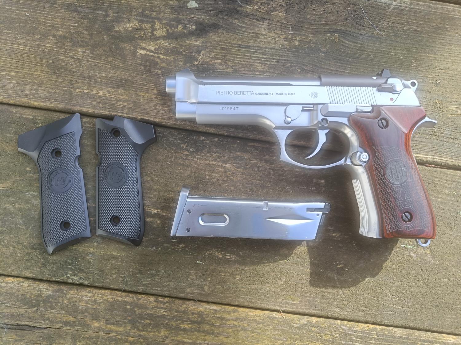 It started life as a brand new Gen2 WE M92. Being a Gen2 this has better build quality, working decocker, adjustable hop (with "VSR style bucking) and full-auto capabilities. I then had the trademarks engraved and picked up a lovely set of Altamont "vintage" real wood grips. As per the photo, the original WE grips will come with this, a long with the WE box.