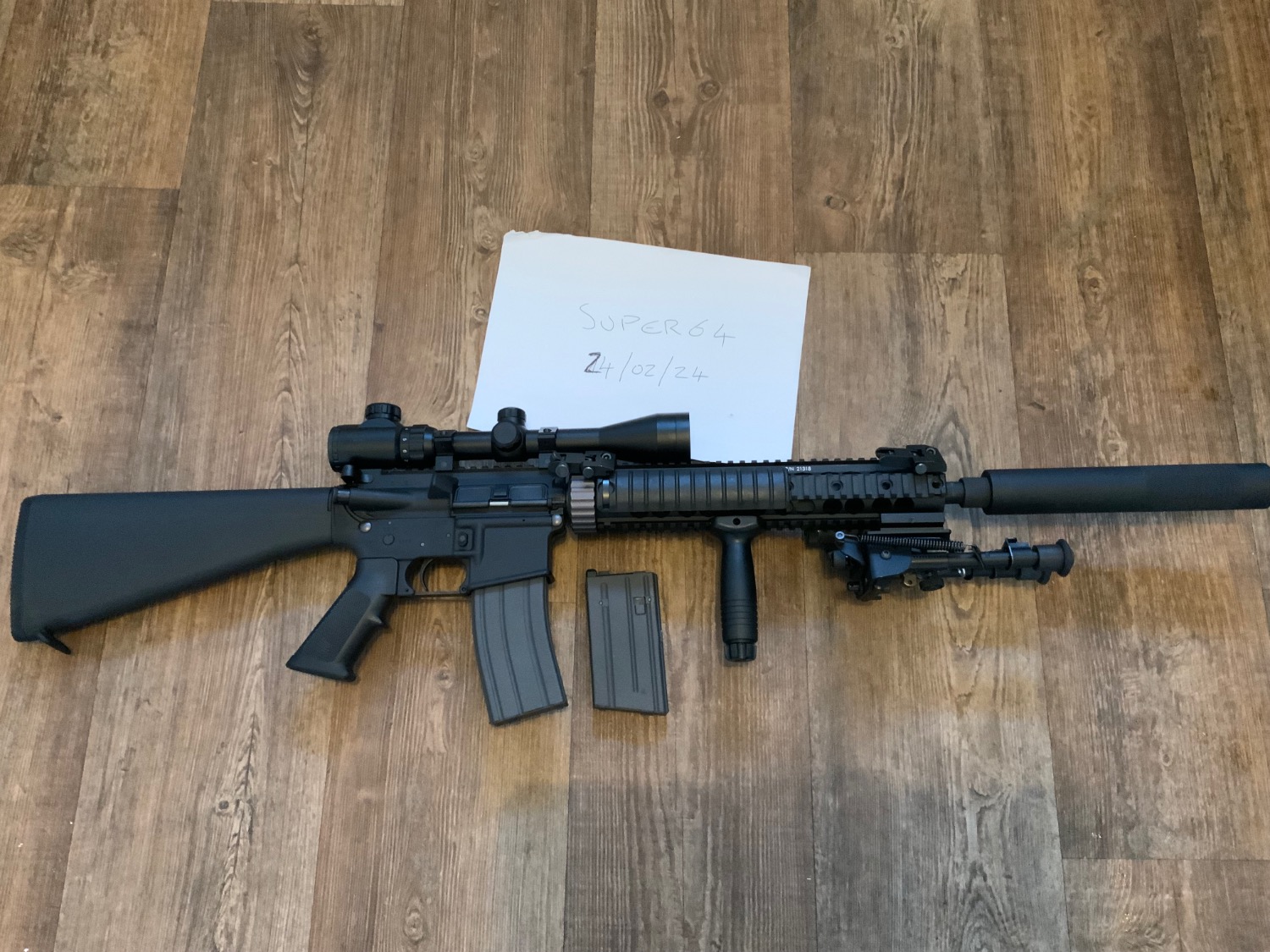 Accessories: 2 leak free magazines, Mk12 rail, muzzle brake, suppressor, replica Peq, Harris style bipod, foregrip, Nuprol scope, M16 butt stock with buffer and spring.