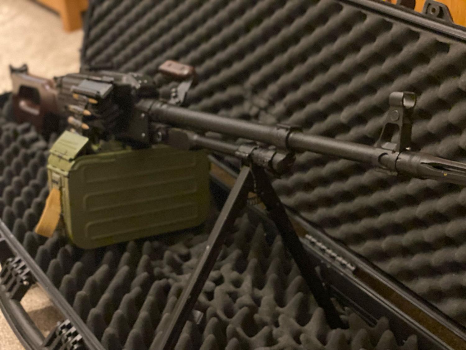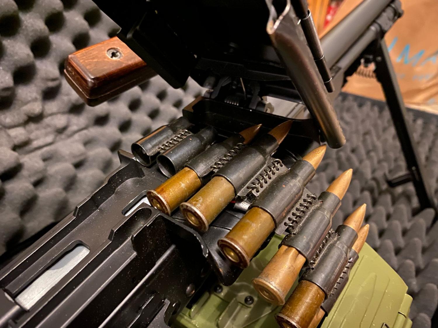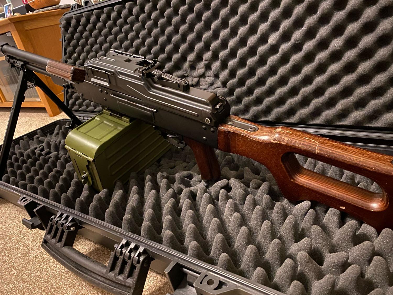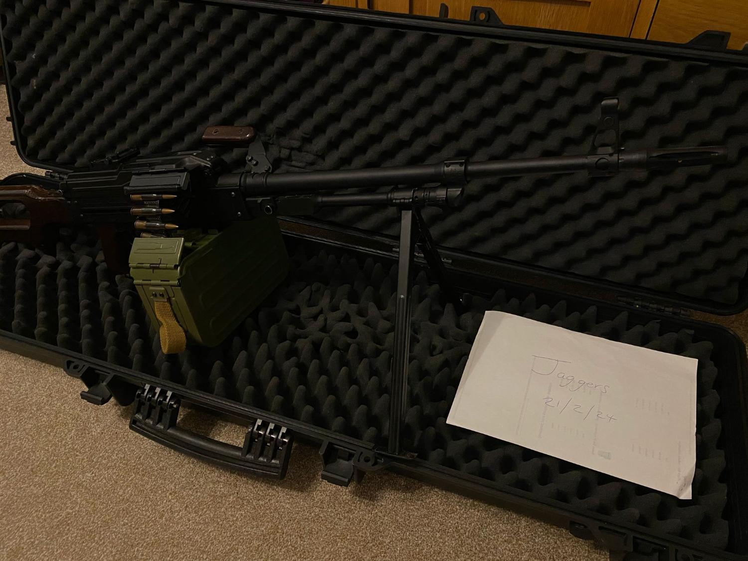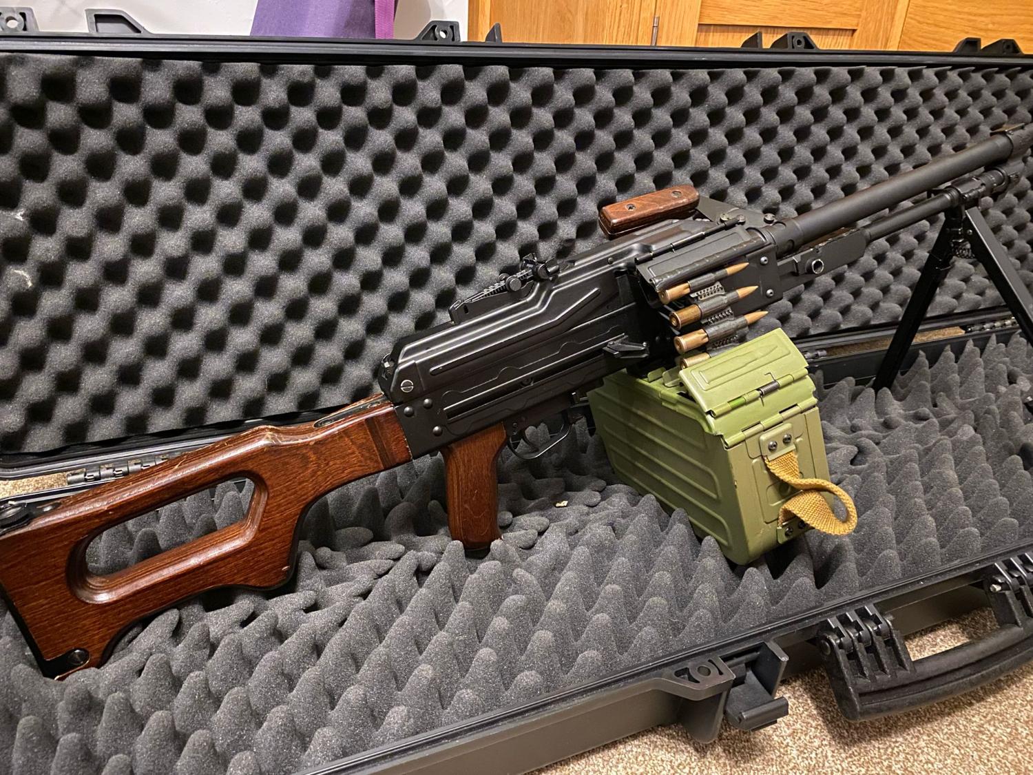 The internals have been left well alone - the gearbox is bulletproof. A CNC Bull Gear hop unit with a Laylax Prometheus 6.03MM 509MM Inner barrel was fitted. I cannot remember if I left the standard hop rubber in or left the Laylax Purple rubber in. Either way, the hop works very nicely and doesnt need swapping. Also, I have fitted a Bull Gear Magazine insert to increase the box mag capacity to 7000rds! Both bull gear parts the hop (£65~) and the magazine insert (£115-140~) are also hard to find now outside of asia. Will include the inert ammo belt with the gun, bought from cold war collectibles a few years ago and is a nice addition to the gun and hides the battery leads very well. Includes original magazine insert, so could possibly be adapted to a pkm empty box mag and original barrel/hop unit. The magazine internals were also covered by myself with some felt, to dampen the sound of BBs rattling about. Case not included but may be interested in selling. Comes with original box.