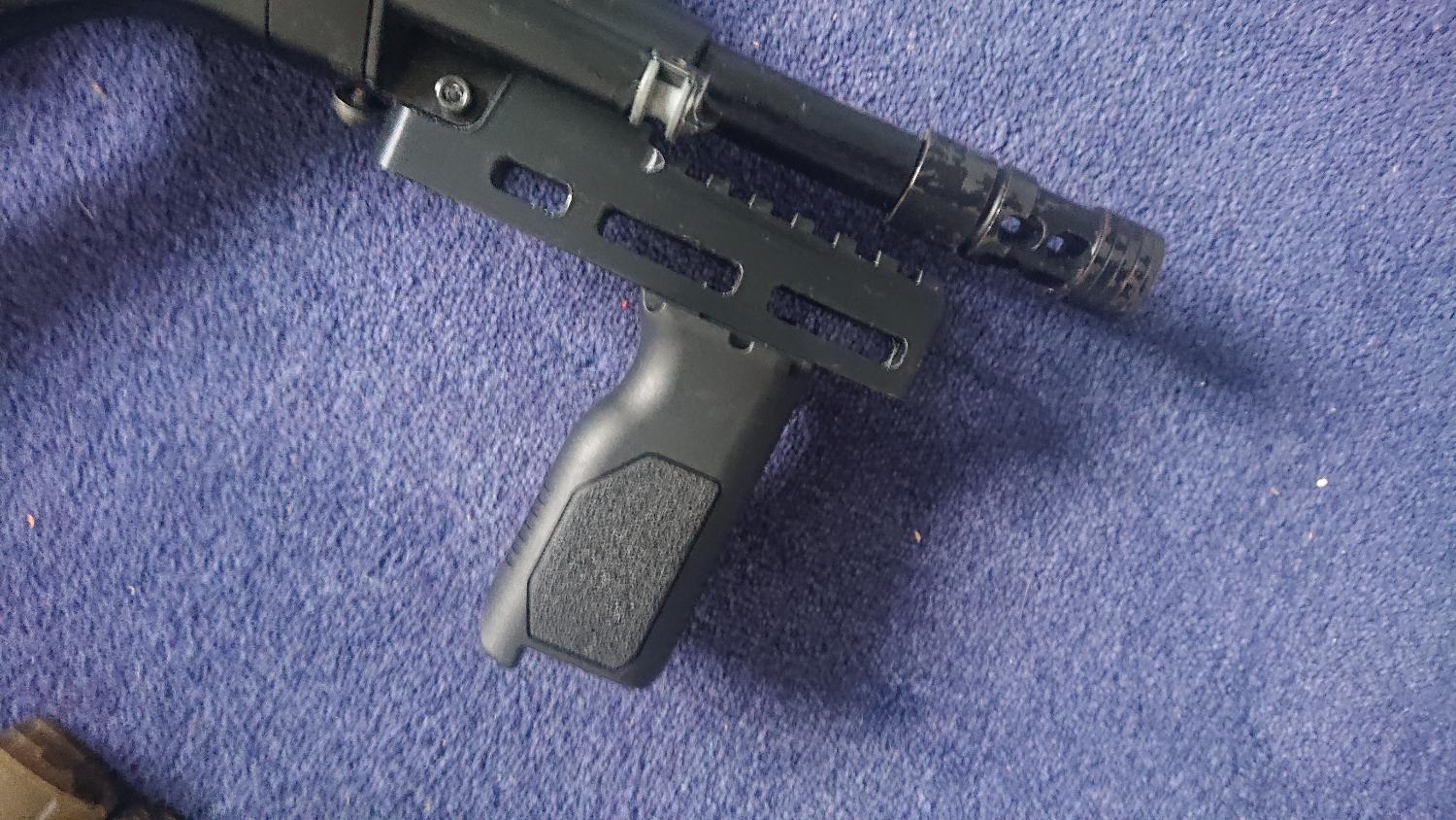 Rifle works well. Shoots around 280fps on .20s. Price includes fees and postage comes with 6 aug midcaps, a 3d printed adapter and 6 cyma 110rd straight mp5 magazines to go with it. The original foregrip was broken when I got it and has been replaced with a 3d printed mlok section and mlok foregrip