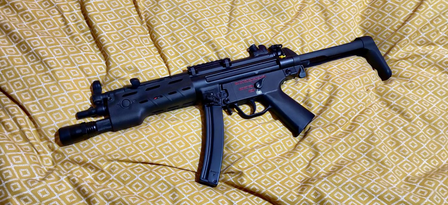 Selling an ICS MP5A5 Pro, comes with original hi cap, box, and accessories, 10x King Arms plastic mid caps, 2x Kong Power batteries, AIM sight rail, ICS torch with lens protector and torch handguard.
