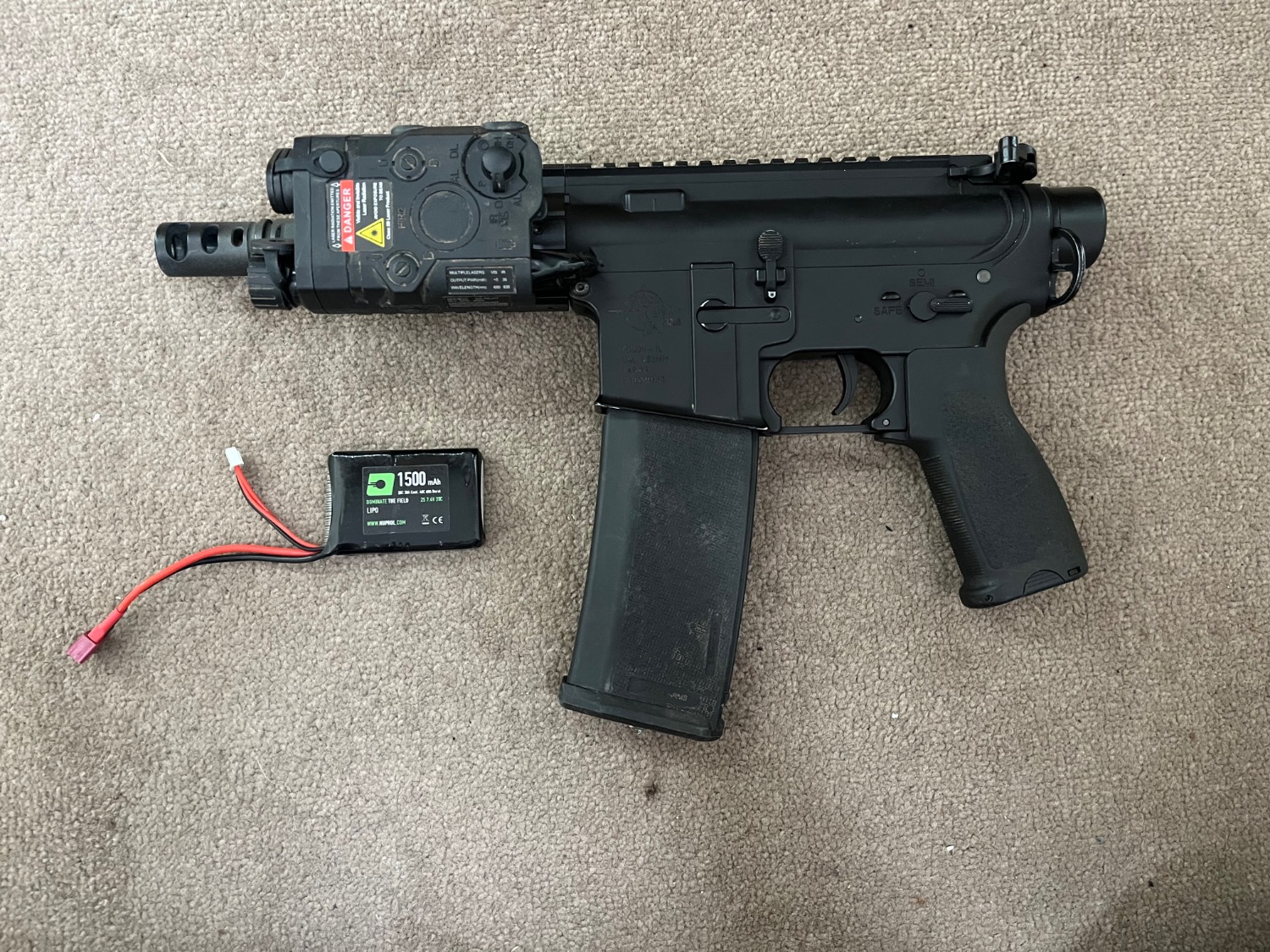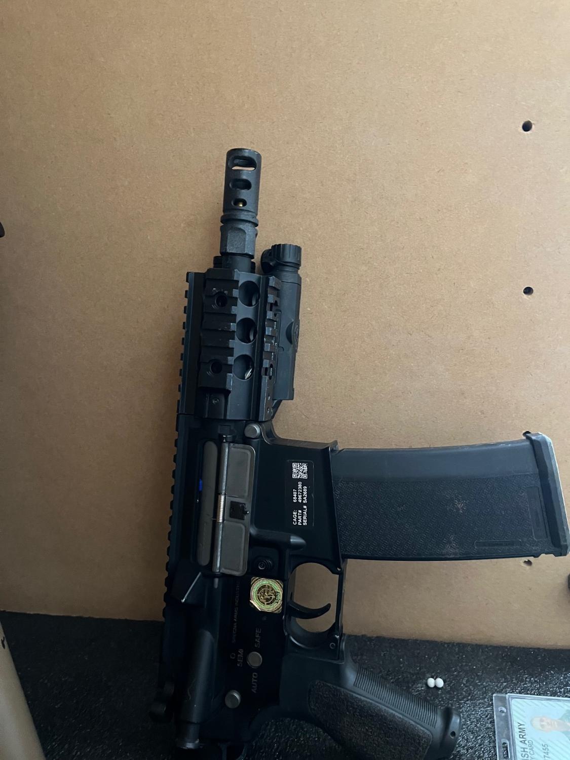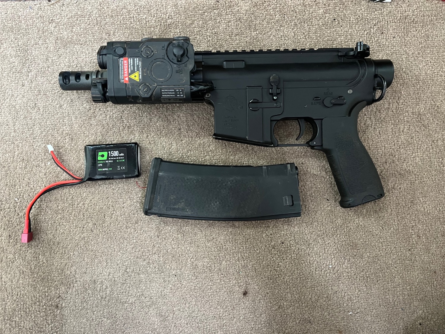 This gun is pretty much brand new, it has been skirmished twice and is working perfectly. Was originally two tone but only a tiny bit on the rail which has been sprayed and can no longer tell it’s two tone, selling as I bought it for cqb and went once, I can say it was a beast tho and your quicker then anyone on the field due to the no stock.