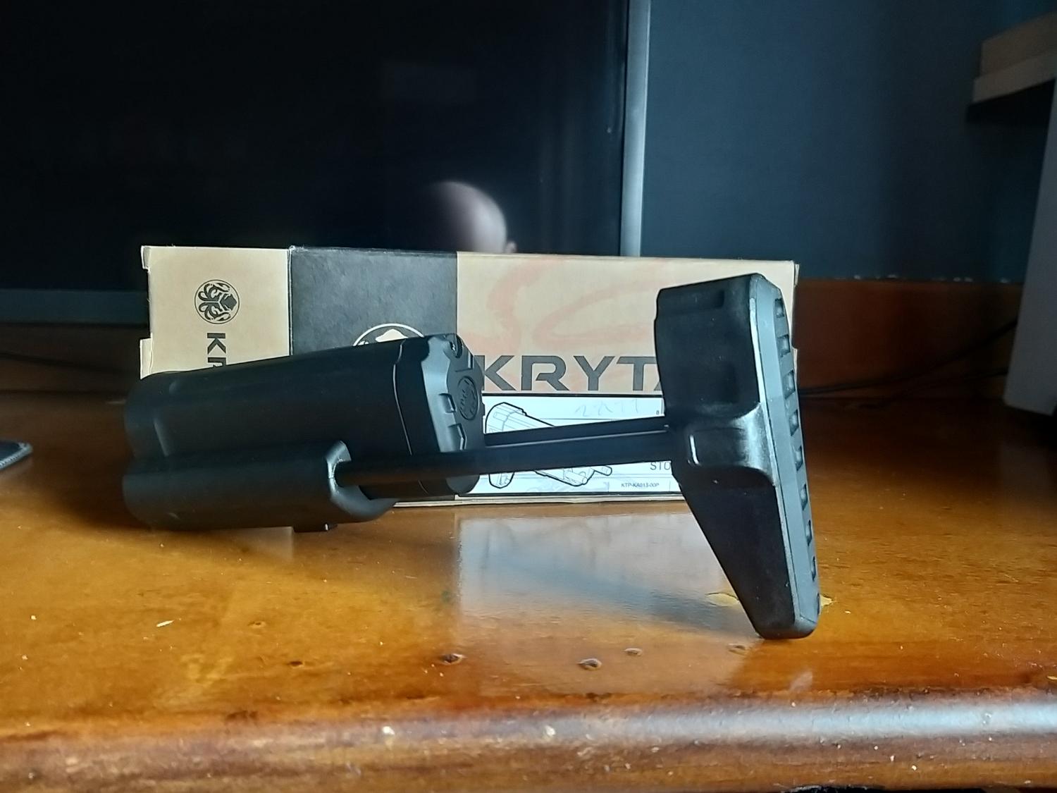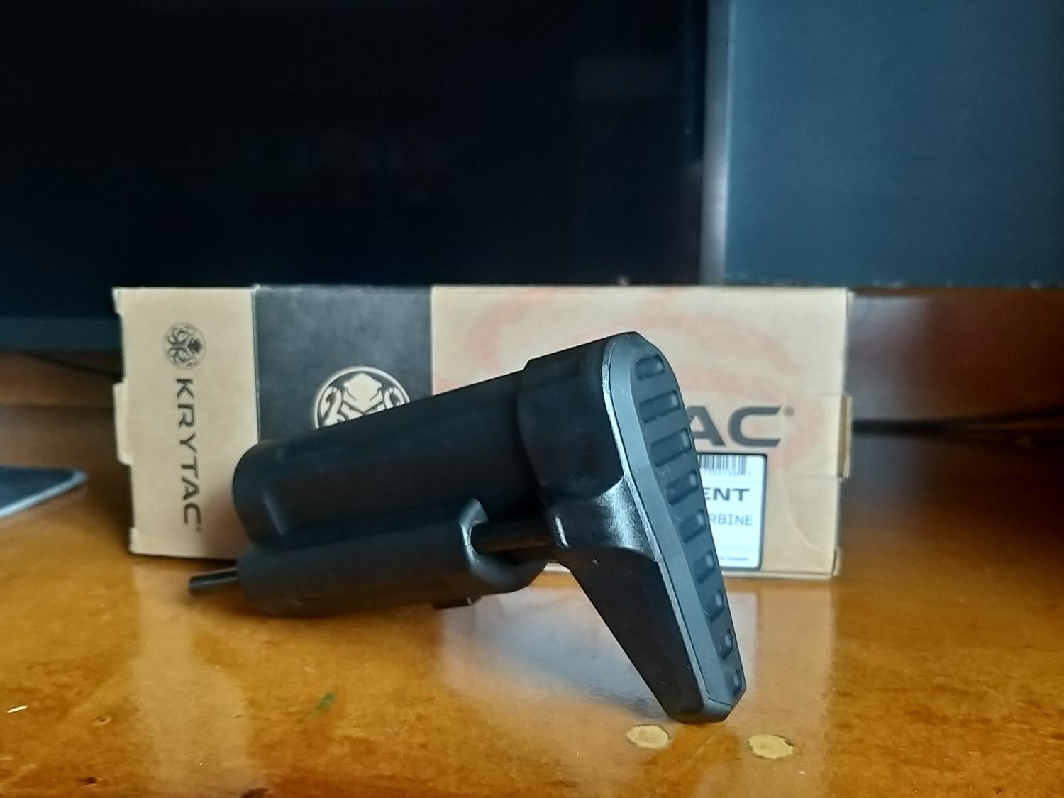 Krytac trident combat carbine stock. Comes with screws and accessories used to fix stock to rifle (seen in pic) taken out of box but never actually used or attached to a rifle.