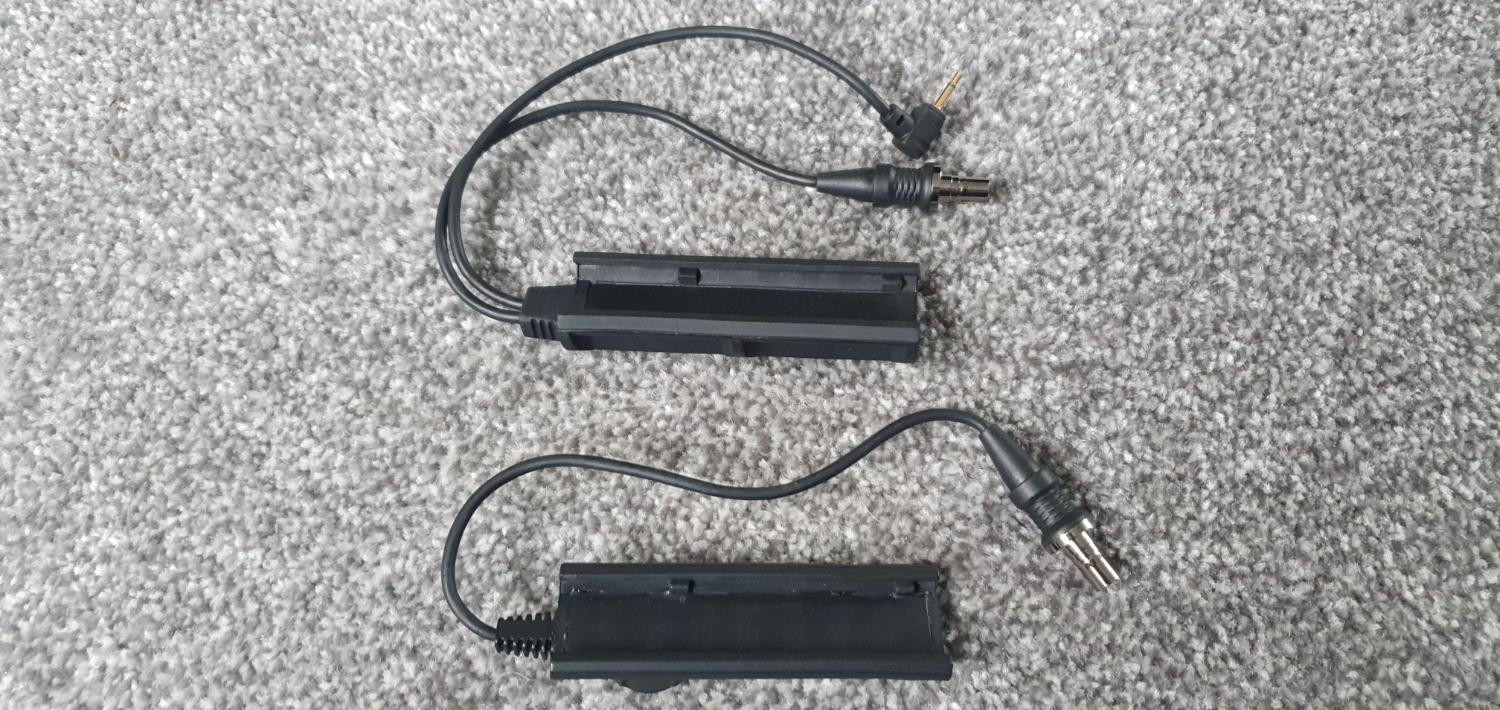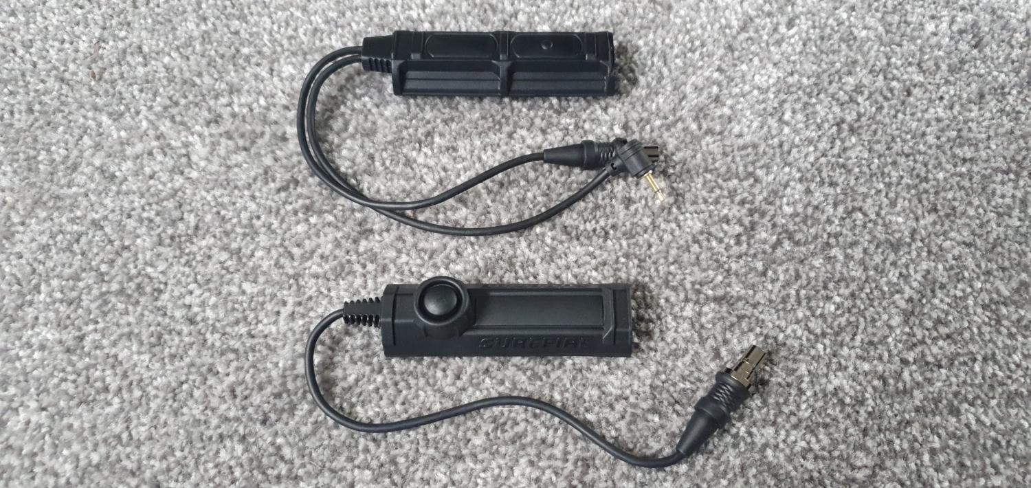 Pair of replica Surefire tailswitches, one SR07 style dual switch for PEQ and Surefire torch (has a small notch cut in the front so it can snug up to an LA5 PEQ for an extra rail slot), and one SR07 style switch for Surefire torch only, with momentary and constant on.