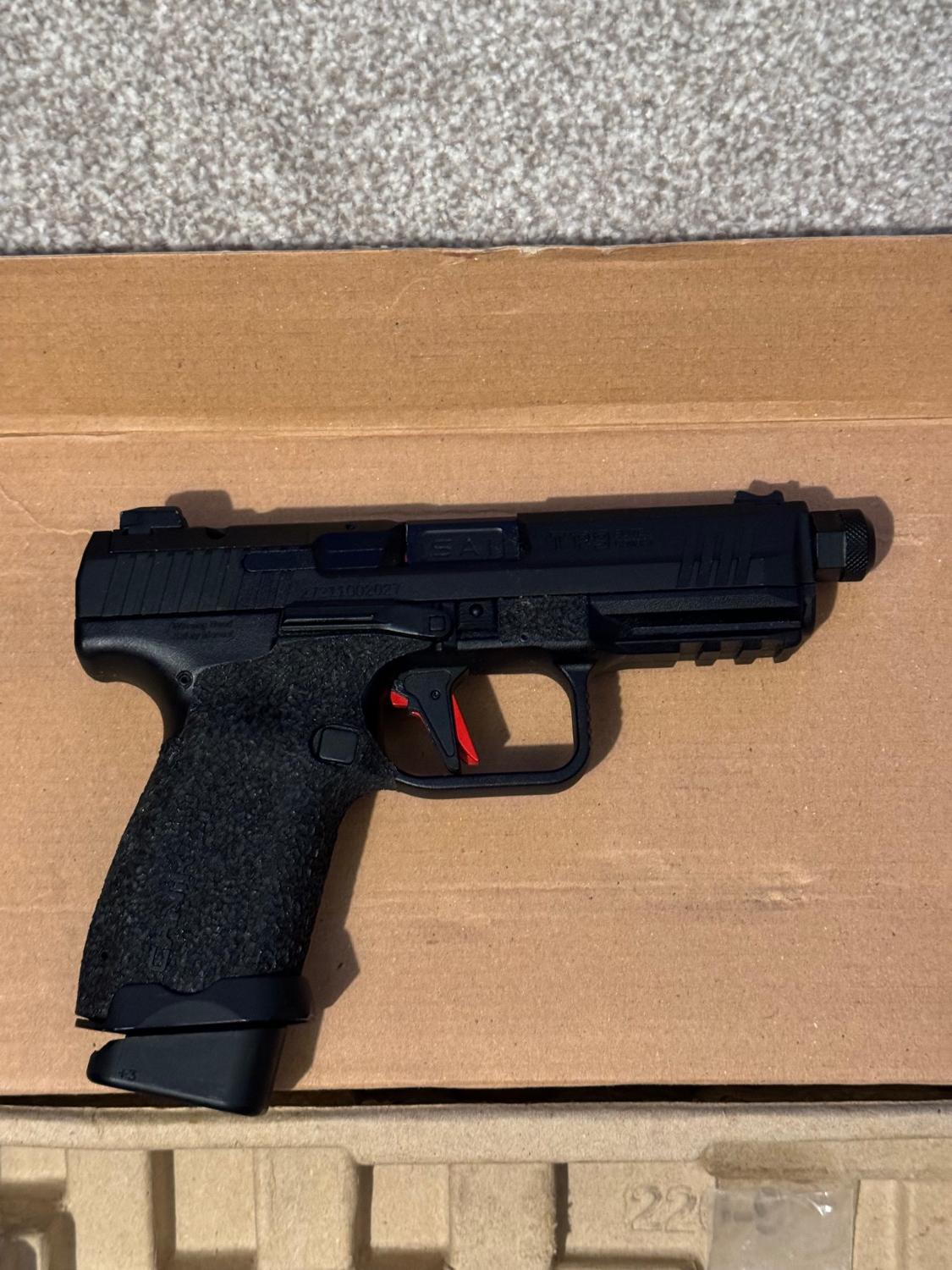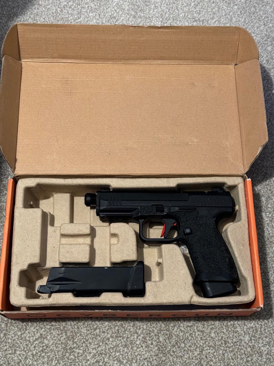 Black SAI Canik pistol. Nice gun but just not to my taste as I prefer CO2 pistols. Comes with 2 leak free mags