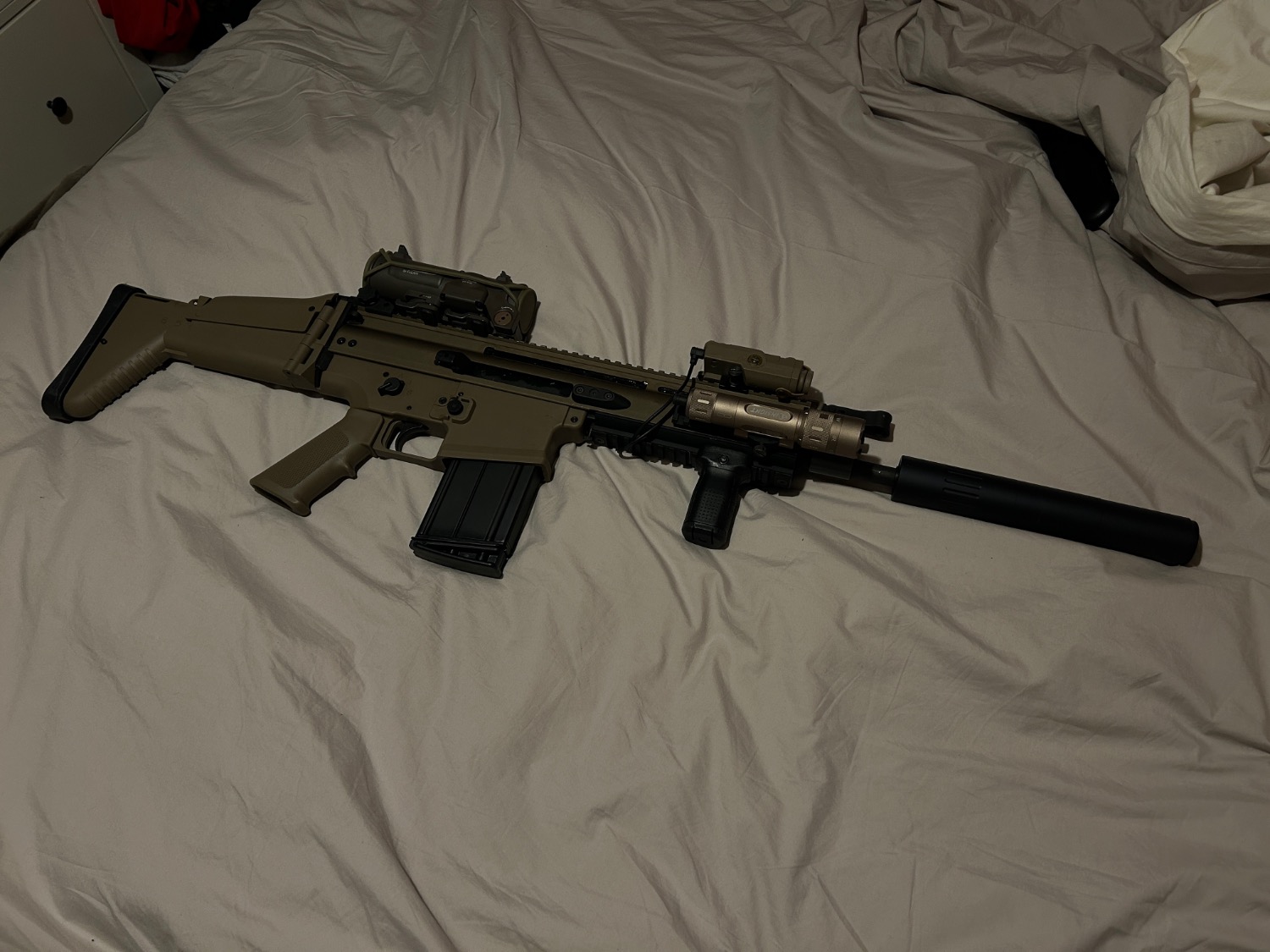 the final touch is the rs accurate QD .308 suppressor, which attaches/detaches via ratchet, onto a 3 prong muzzle device.
