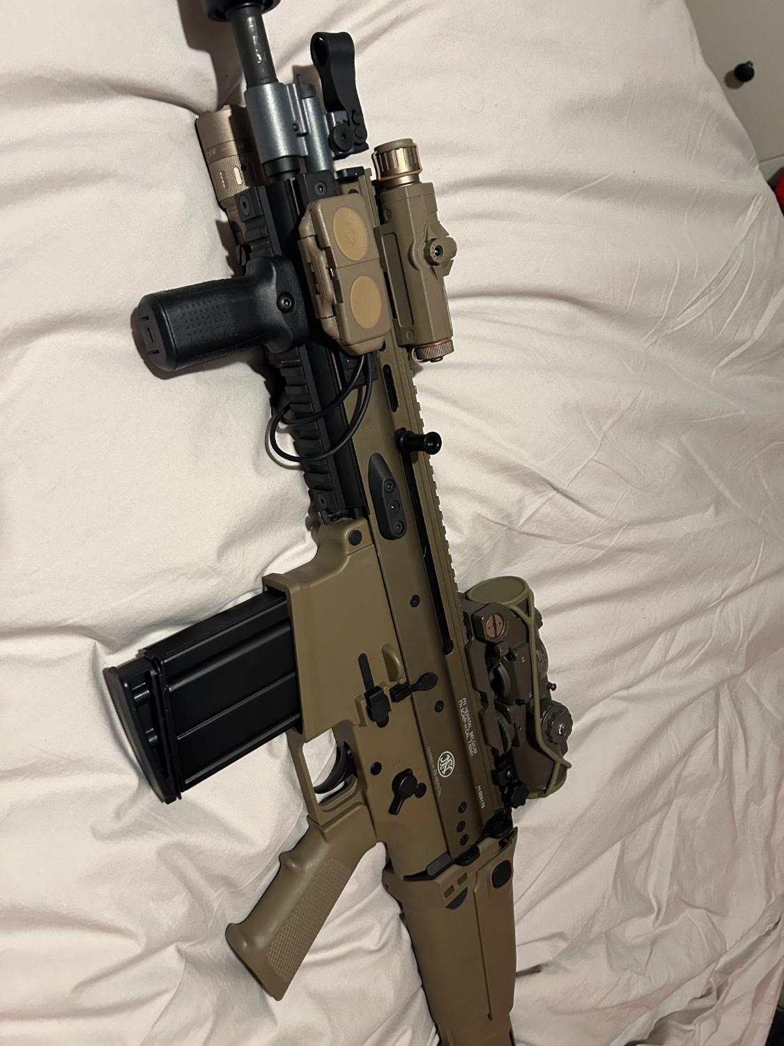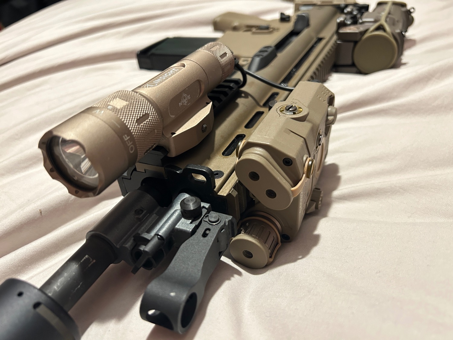 externally, an evolution gear 1-4 Elcan clone (exceptional glass quality for a repro, illuminated reticle, adjustable, etc) as well as an NE WMX200 clone, and peq-15 clone, with functioning vis, IR and white light elements, paired via an old school clip on insight 2 button pressure pad.