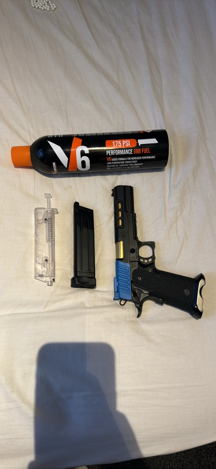 This pistol has never been used with full bottle of gas and speed loader box is included no damage to box or airsoft pistol