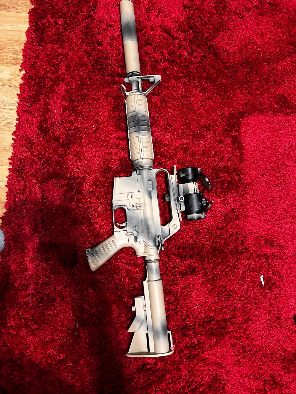 One of my favourites, recently sprayed it to match with my black hawk down aesthetic, skirmished 1 game with paint job and now looking for something different. Overall have skirmished 4 times in total so not used much. Has a very nice kick to it, very enjoyable to shoot and runs very well especially in slightly cold weather. I have lost the cap for the scope so it is not functional. Suppressor is just threaded on. Left side of the receiver has some small scratches but rest is fine. Recently serviced all mags, cleaned and greased o-rings and all seal perfectly. Installed an angry gun 150% steel nozzle spring a few days ago, a flamingo 50, and maple leaf crazy jet 310 mm. Was looking to sell or trade for a modern GBBR. As I am moving away from doing that load out and want to try something different.