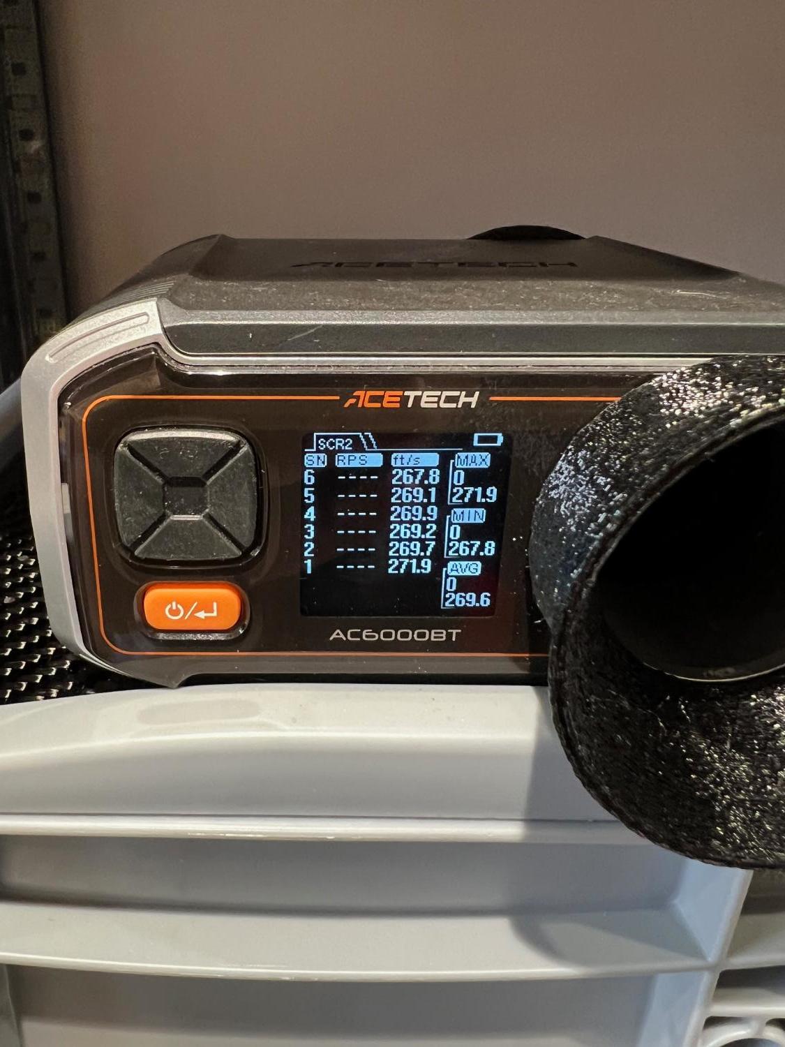 The build is designed for heavier ammo and according to my chrono, is consistently shooting 0.32g warhead BB's at ~268 FPS (1.07j) on both semi and full auto (16 RPS on a half charged 1200mAh 7.4V lipo).