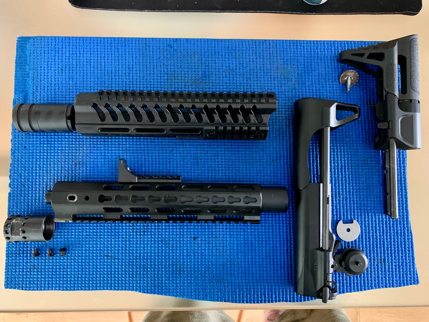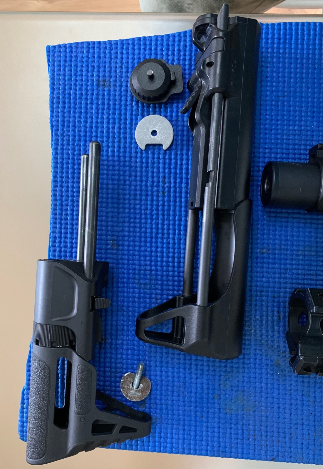 bottom left is if I remember a octarms metal 10” handrail with barrel nut and fixings, short outer barrel and suppressor, hand stop included, had a rattle can paint …SOLD