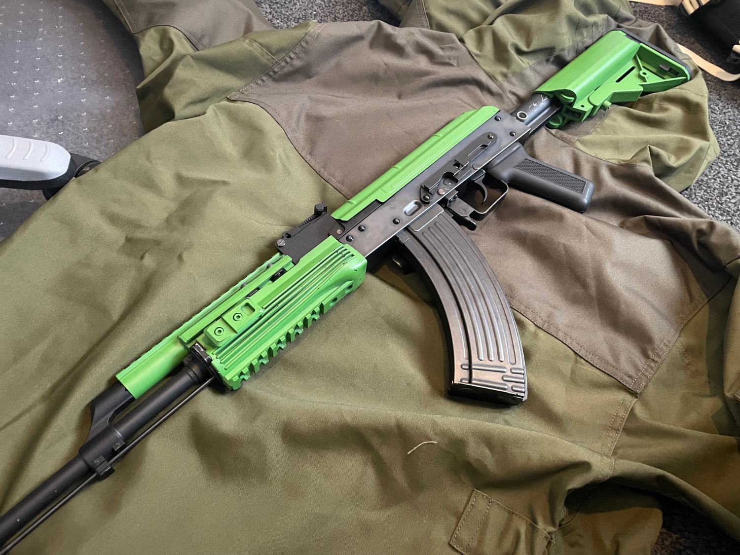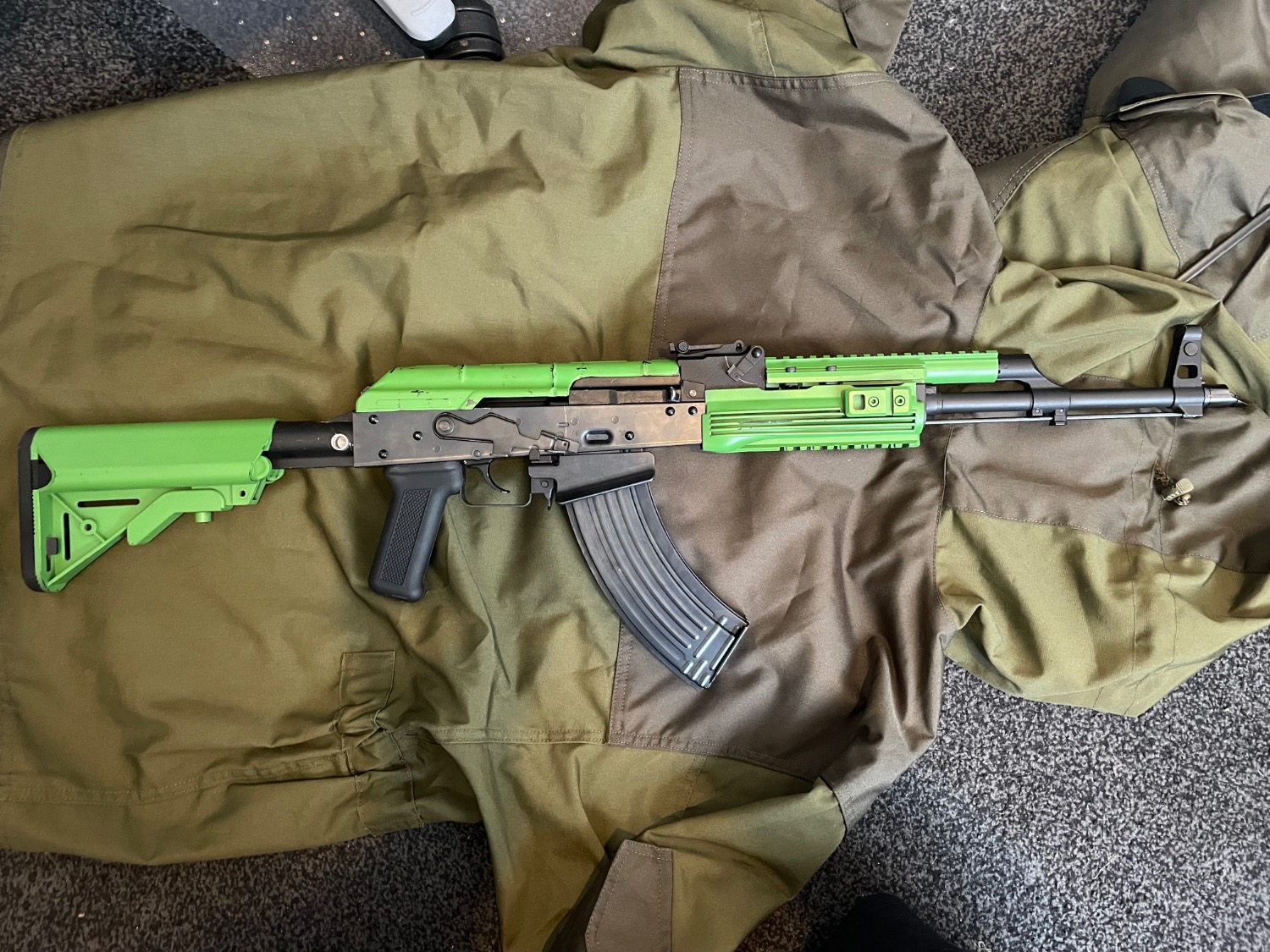 Bought from Actionhobbies as a preowned gun. apparently the previous owner was a collector but lacked an exemption hence the two tone green. Its a standard two tone retailer paintjob and easy to strip with a bit of patience and elbow grease (both things that i lack)