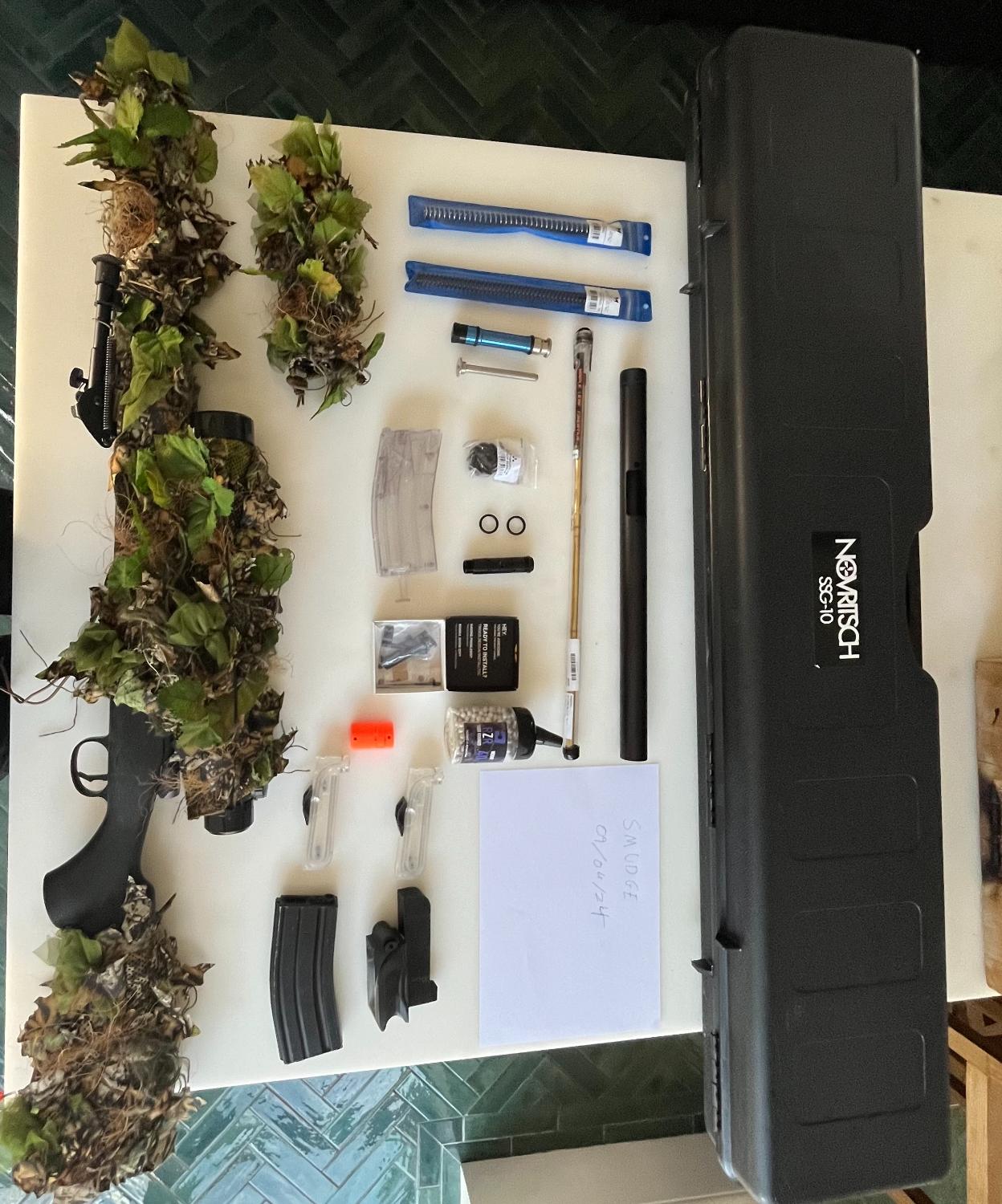 Novritsch amber gun, scope and suppressor cover (heavily crafted with AGM, Raffia, Novritsch Burlap and unique crafting leaves)