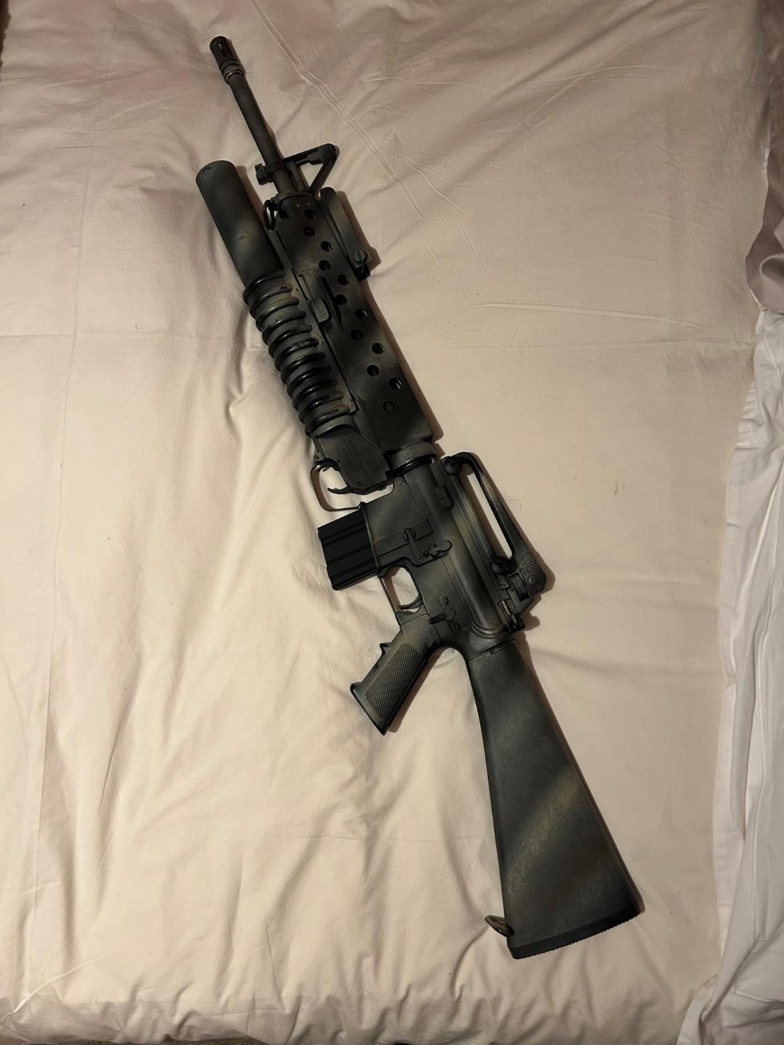 According to the original builder, the handguard section is RS, from an m16 that was de-activated.