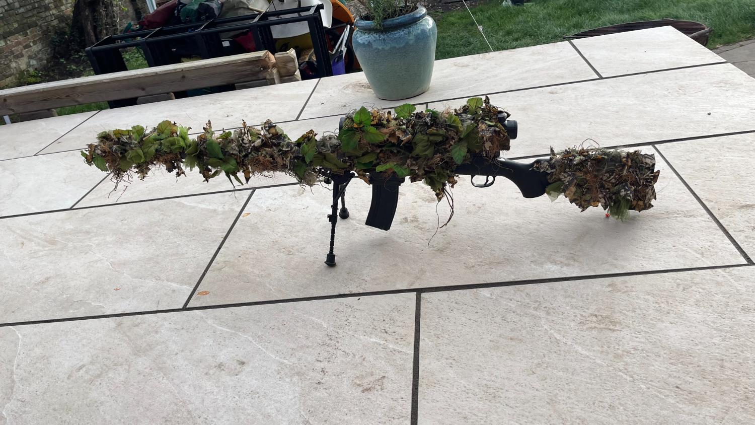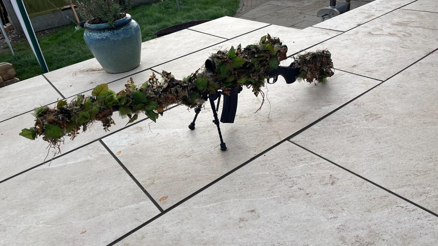 Novritsch amber gun, scope and suppressor cover (heavily crafted with AGM, Raffia, Novritsch Burlap and unique crafting leaves)