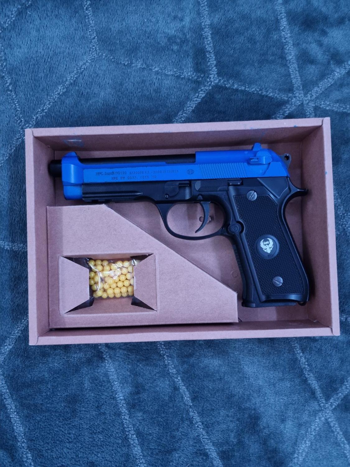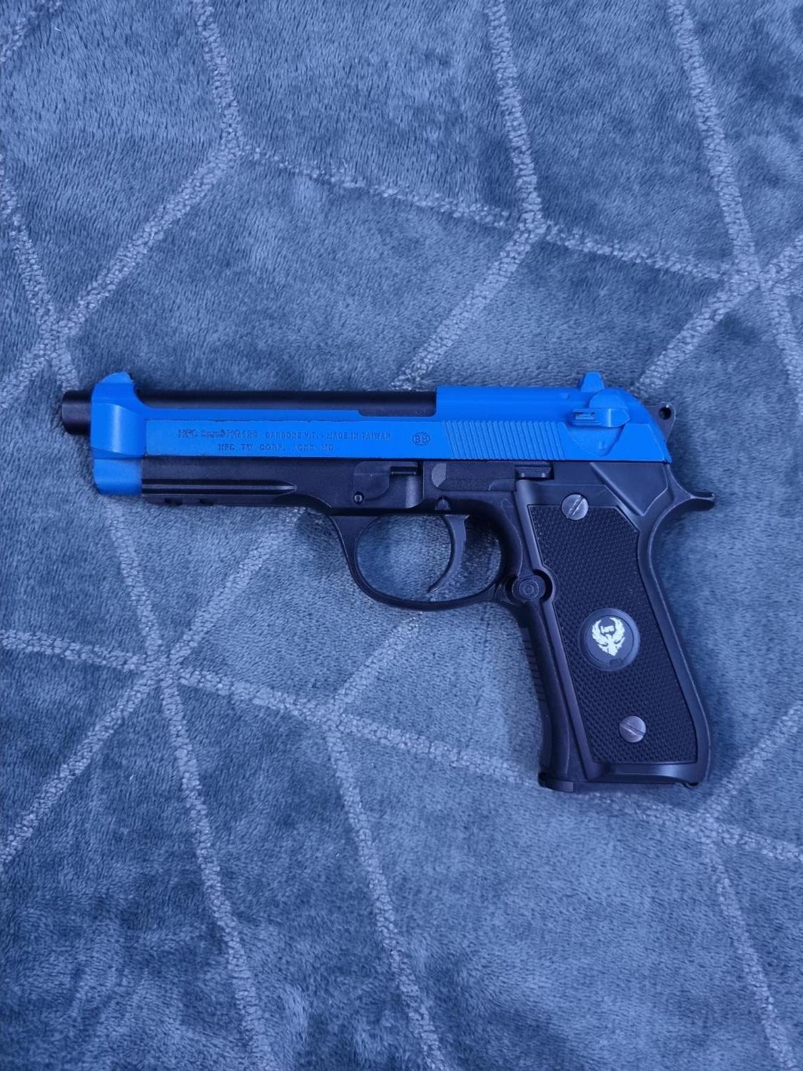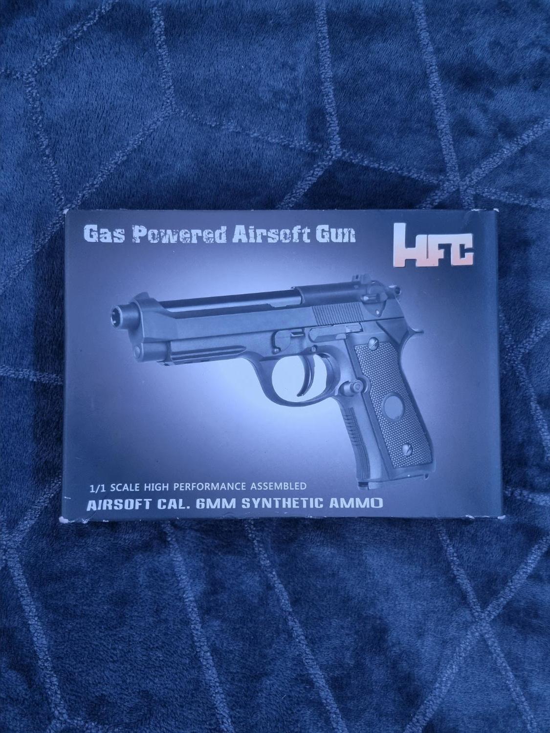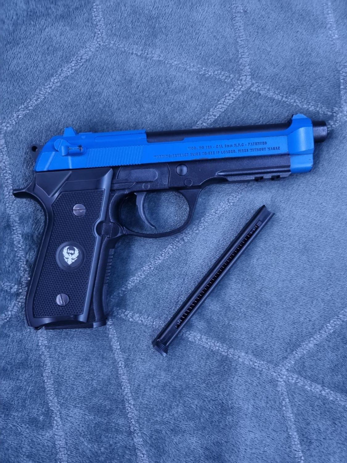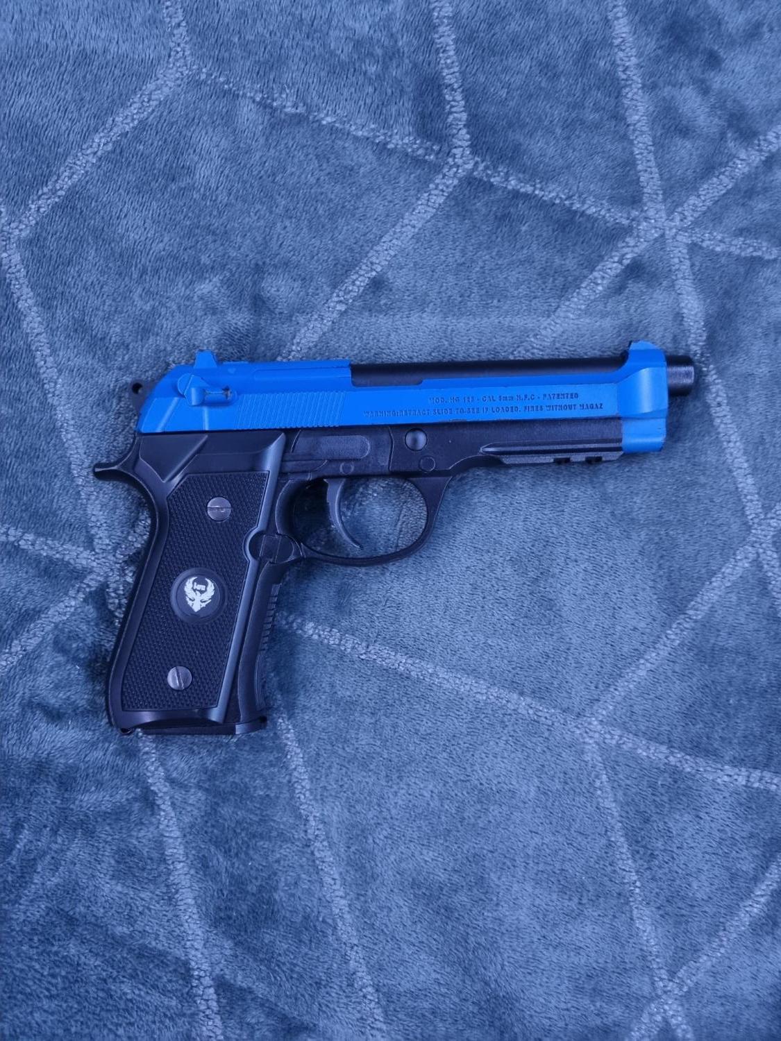 This is a great gas powered M9 that runs on green gas shooting bb pellets. It is slightly broken but can be easily fixed just haven't had the time to fix the slight issue. It is non gas blowback but still provides a safety trigger and is semi automatic. I have barely used it.
