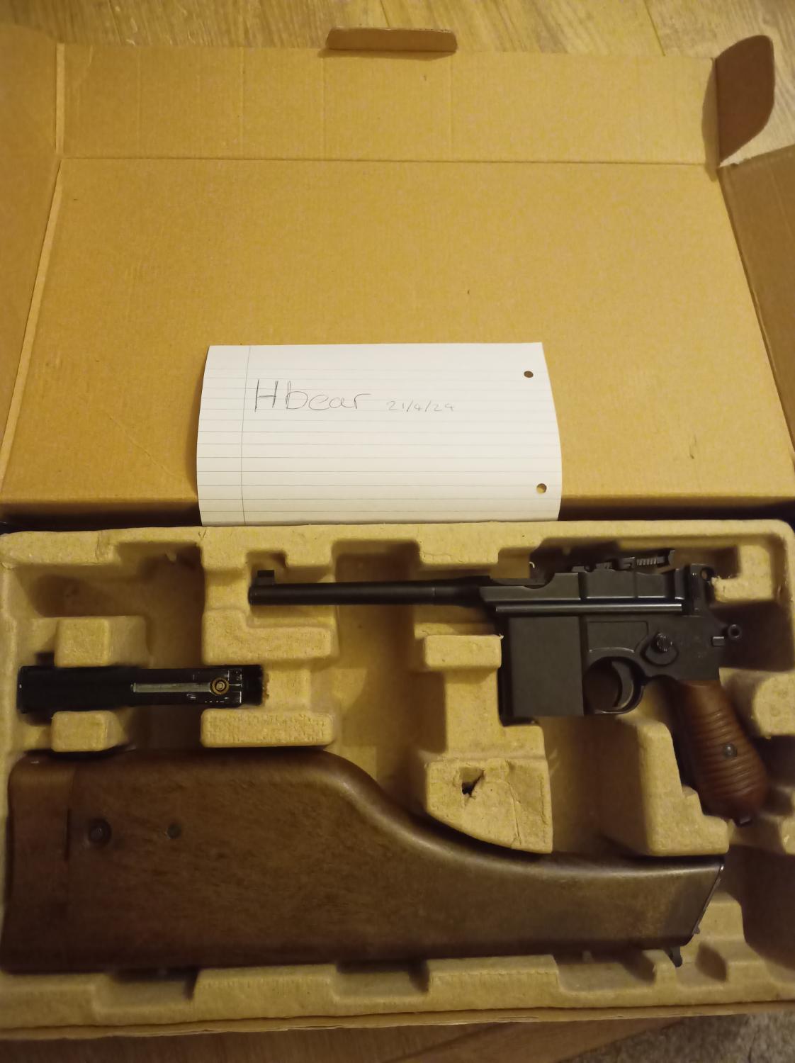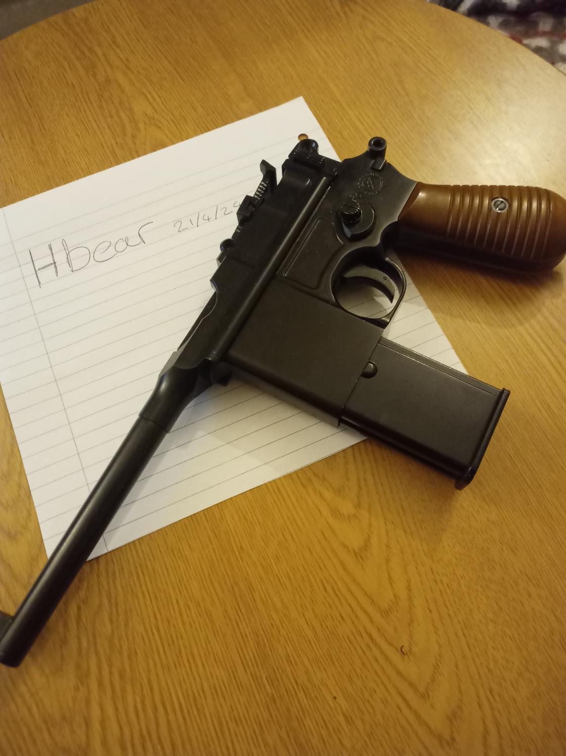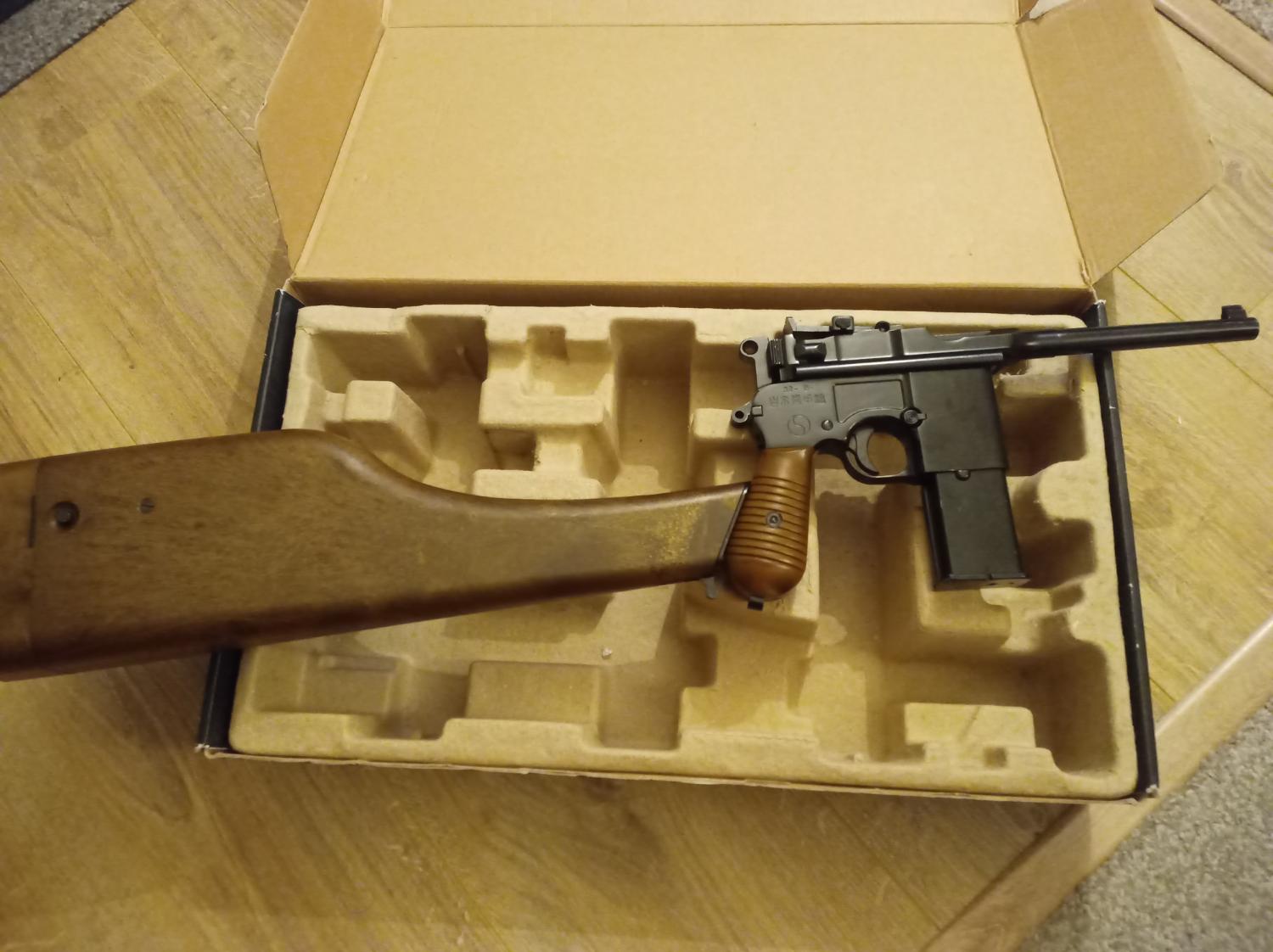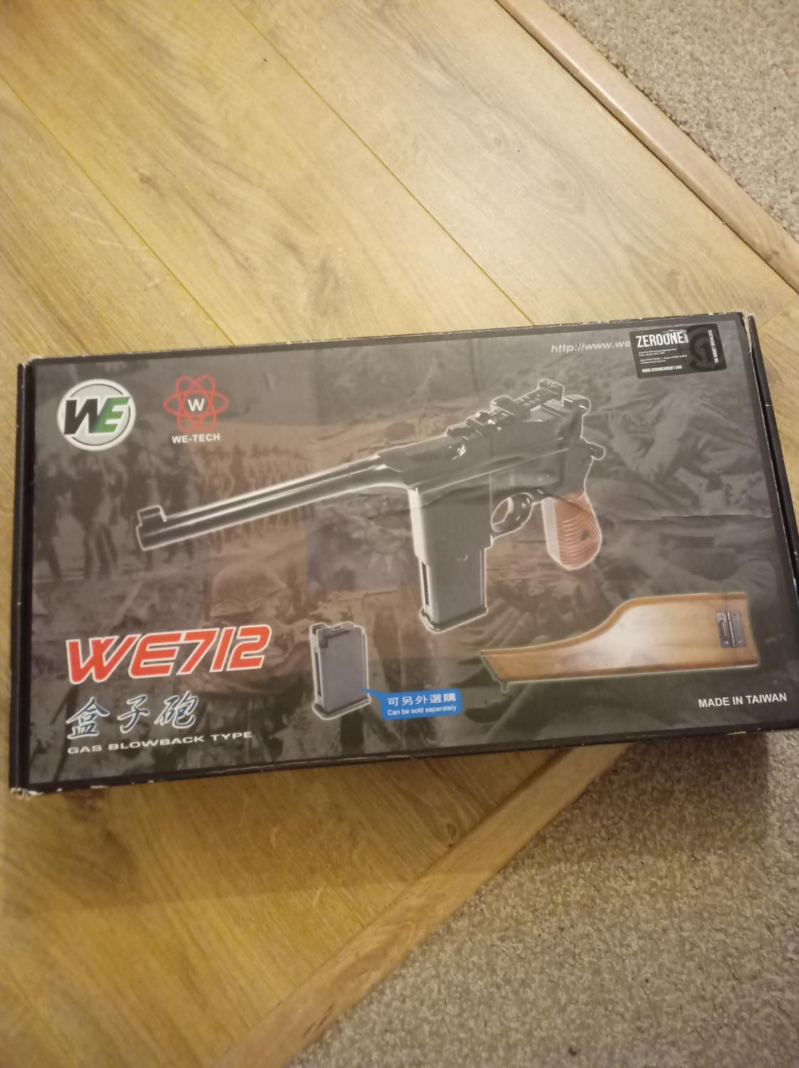 712 from WE, Chinese copy of the Mauser C96. Semi and full auto capability, very snappy recoil and rate of fire is very crisp. Has the normal wear and tear of a WE pistol, paint rubs off quickly from the parts that see the most use. The stock has a couple of small dents as it's made of polymer and a small bend on the mag baseplate but otherwise everything is great and works perfectly.
