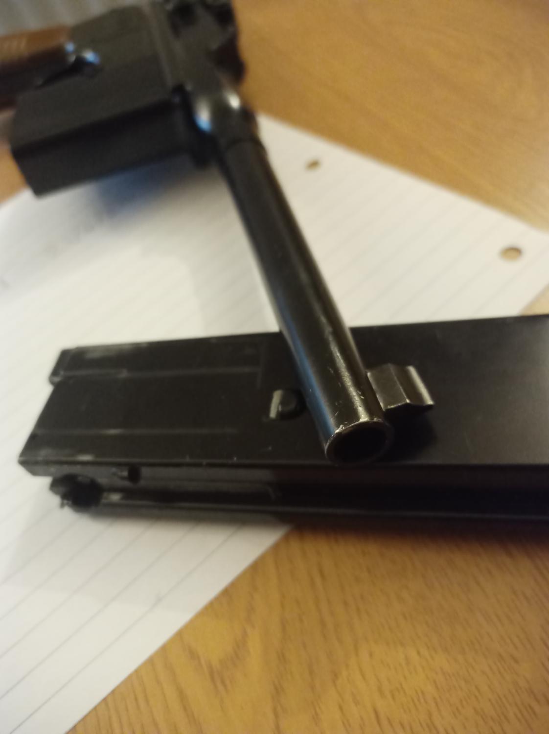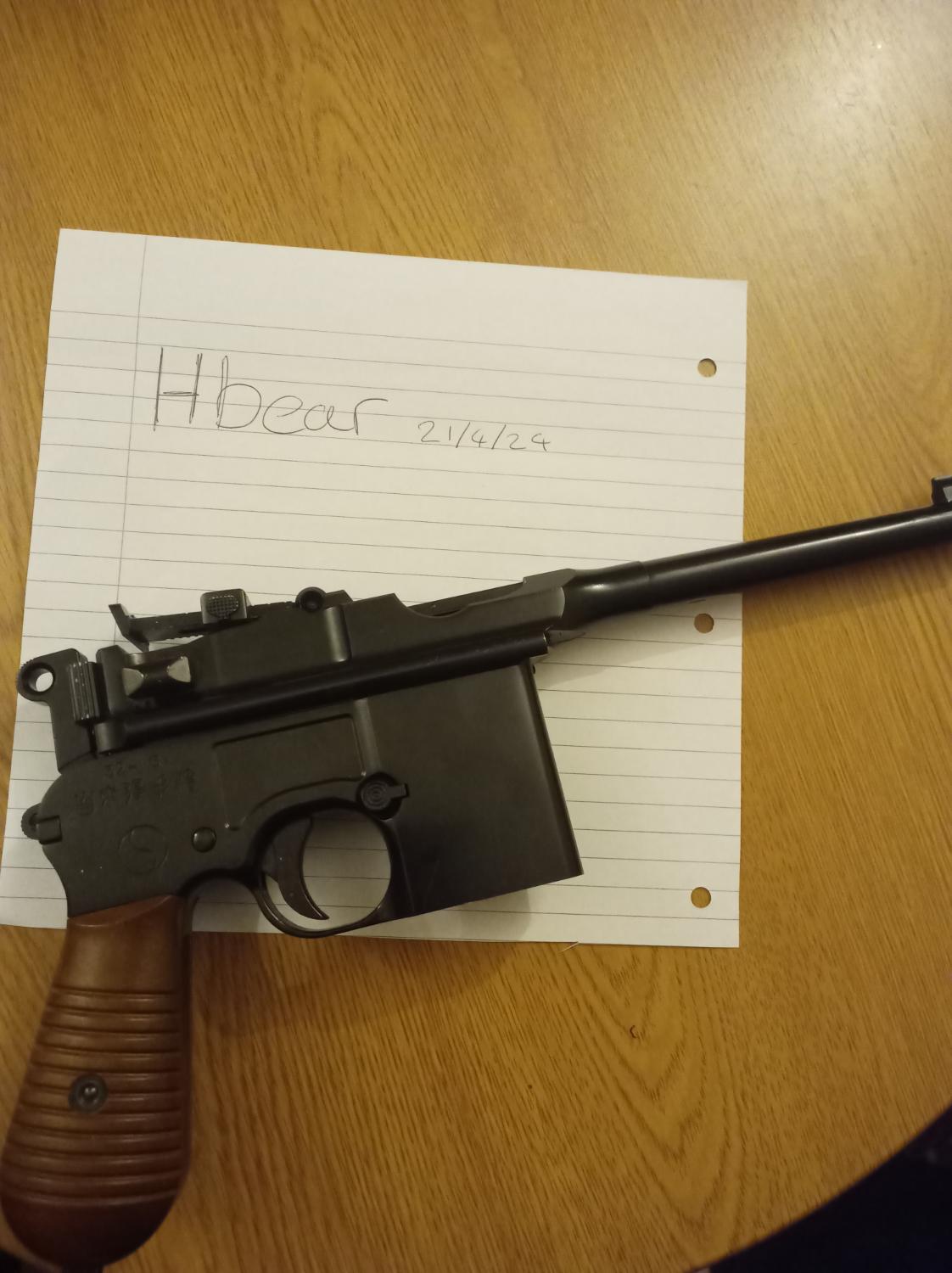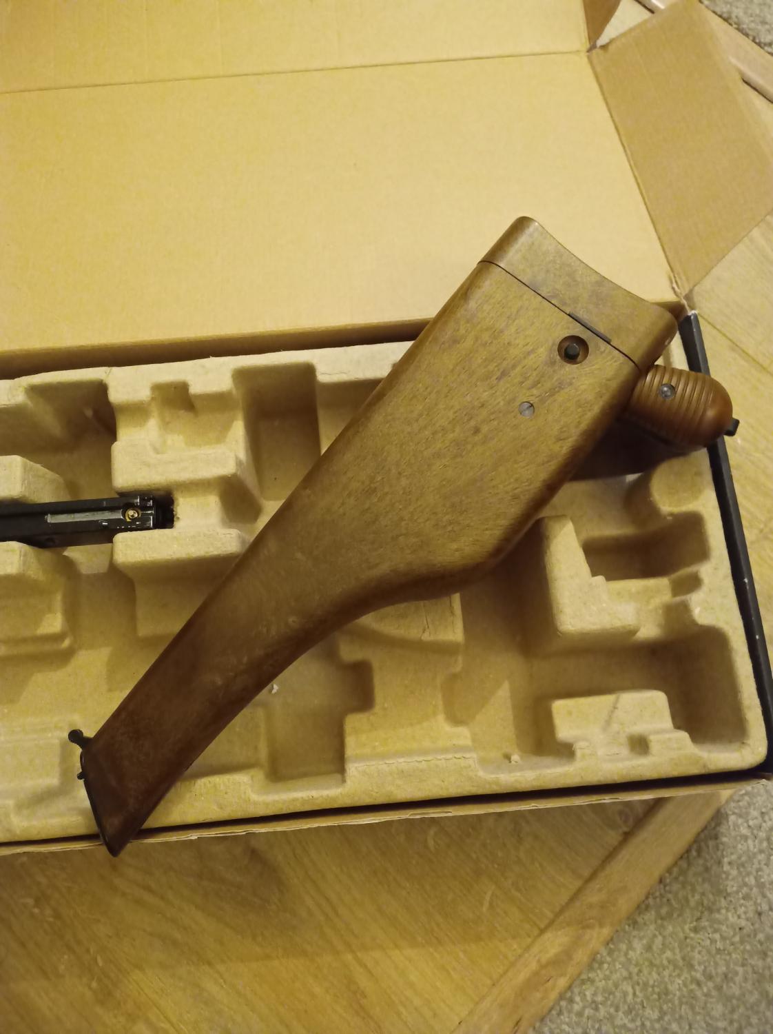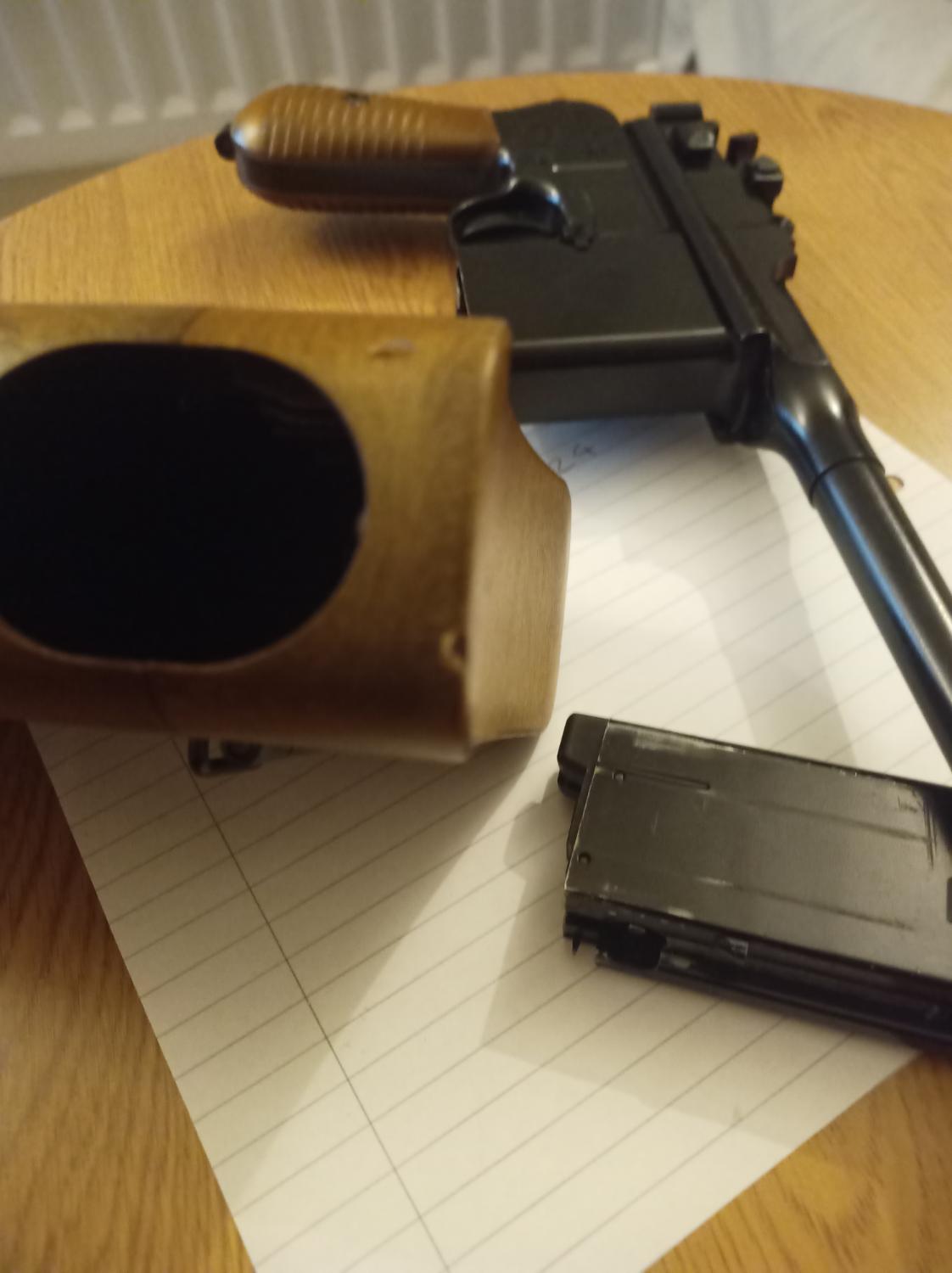 712 from WE, Chinese copy of the Mauser C96. Semi and full auto capability, very snappy recoil and rate of fire is very crisp. Has the normal wear and tear of a WE pistol, paint rubs off quickly from the parts that see the most use. The stock has a couple of small dents as it's made of polymer and a small bend on the mag baseplate but otherwise everything is great and works perfectly.