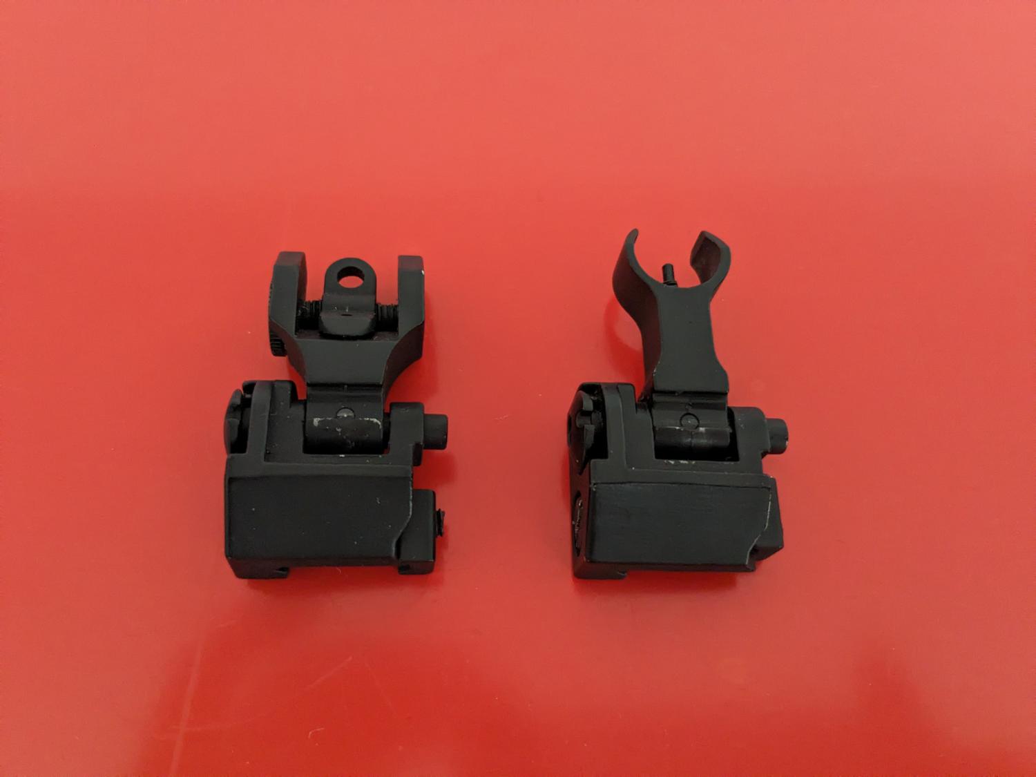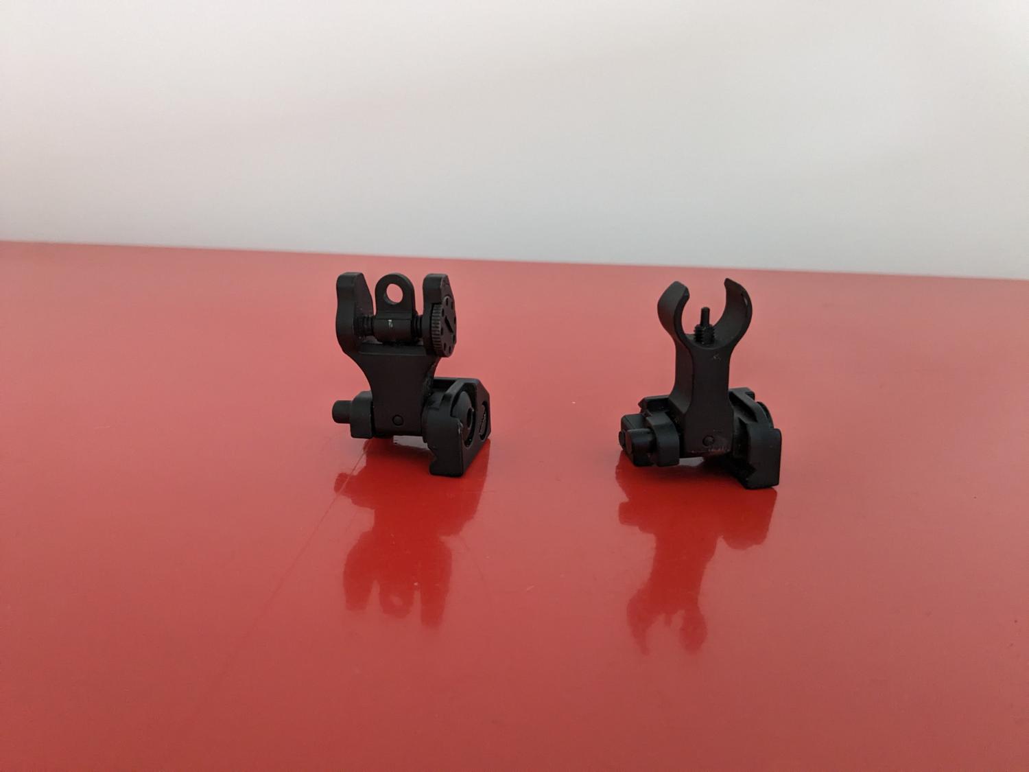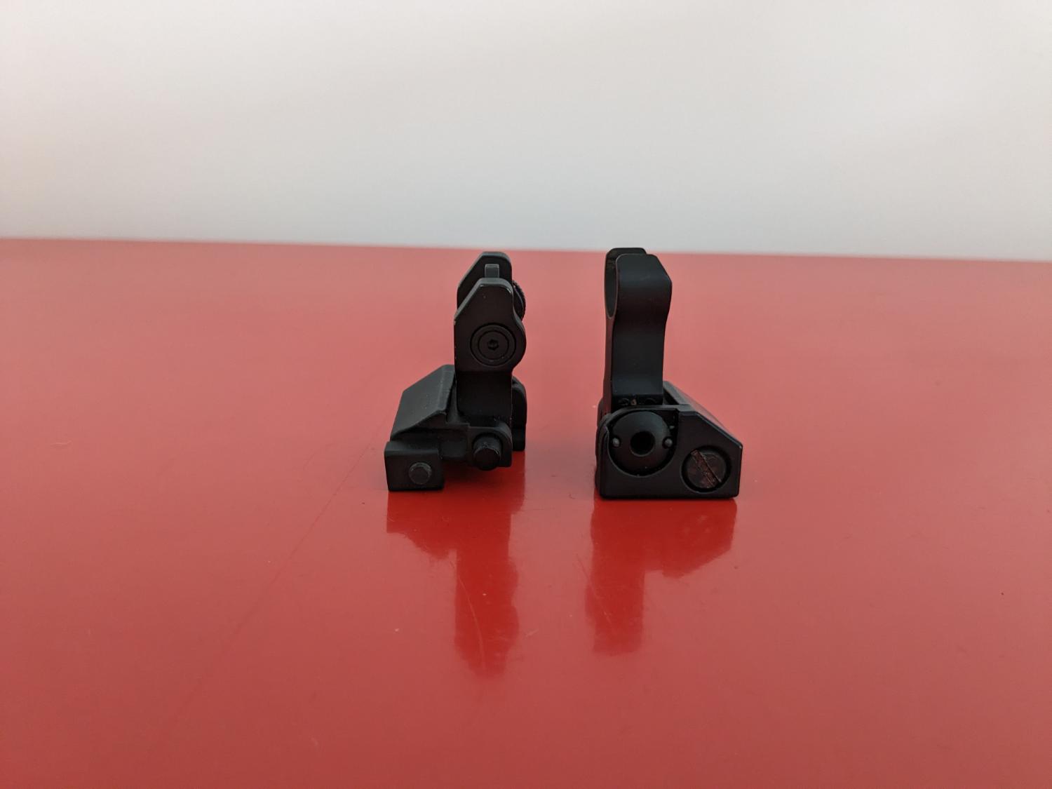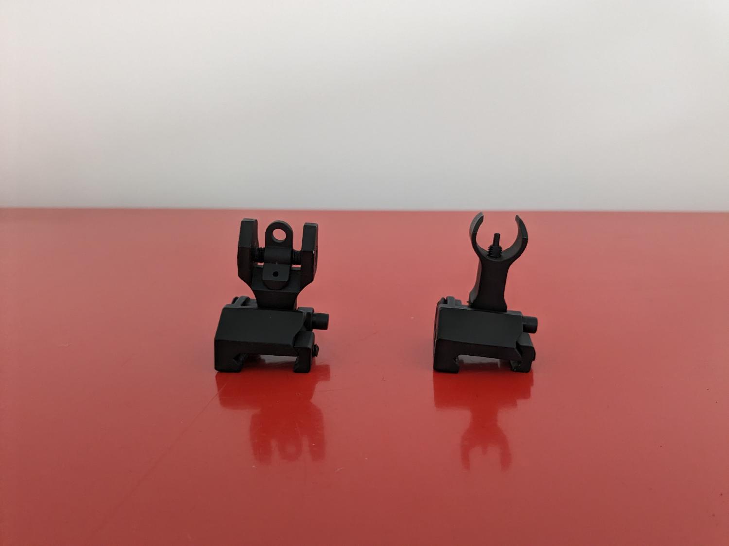 Iron sights all metal folding battle sight style. Nice heavy construction. Push bottom lock into place.