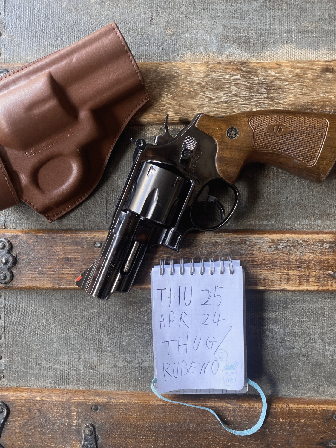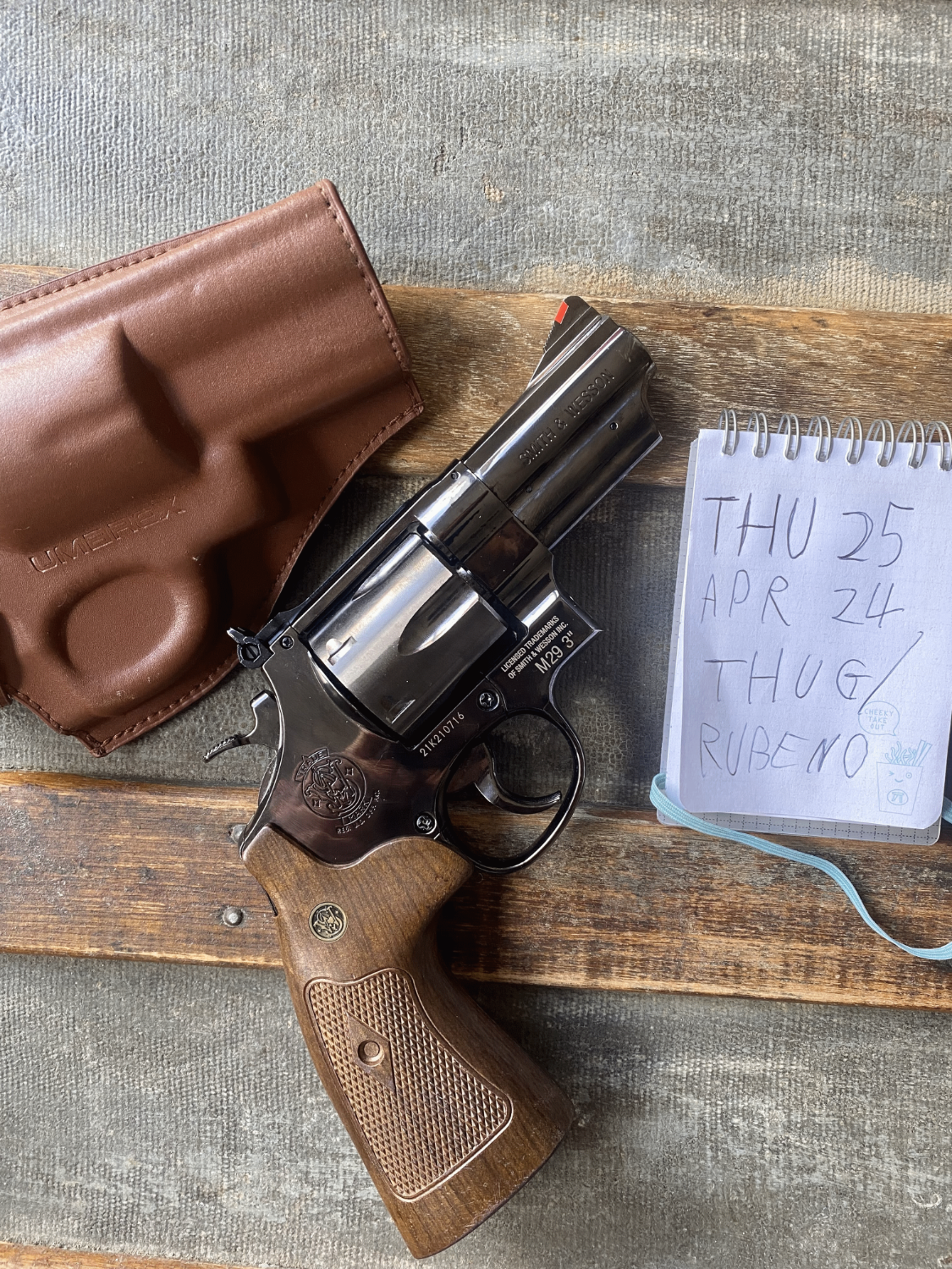 Umarex S&W M29 3 inch barrel, with the original shell set and a leather OWB holster. Finish is so damn good you can see me taking the picture in it. Reluctant sale, very sexy piece but need the money.