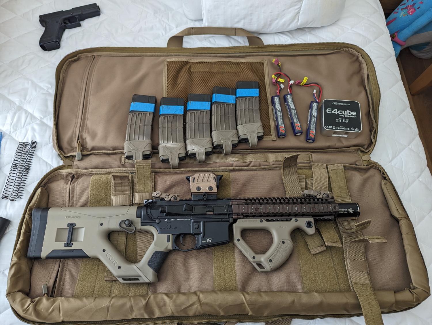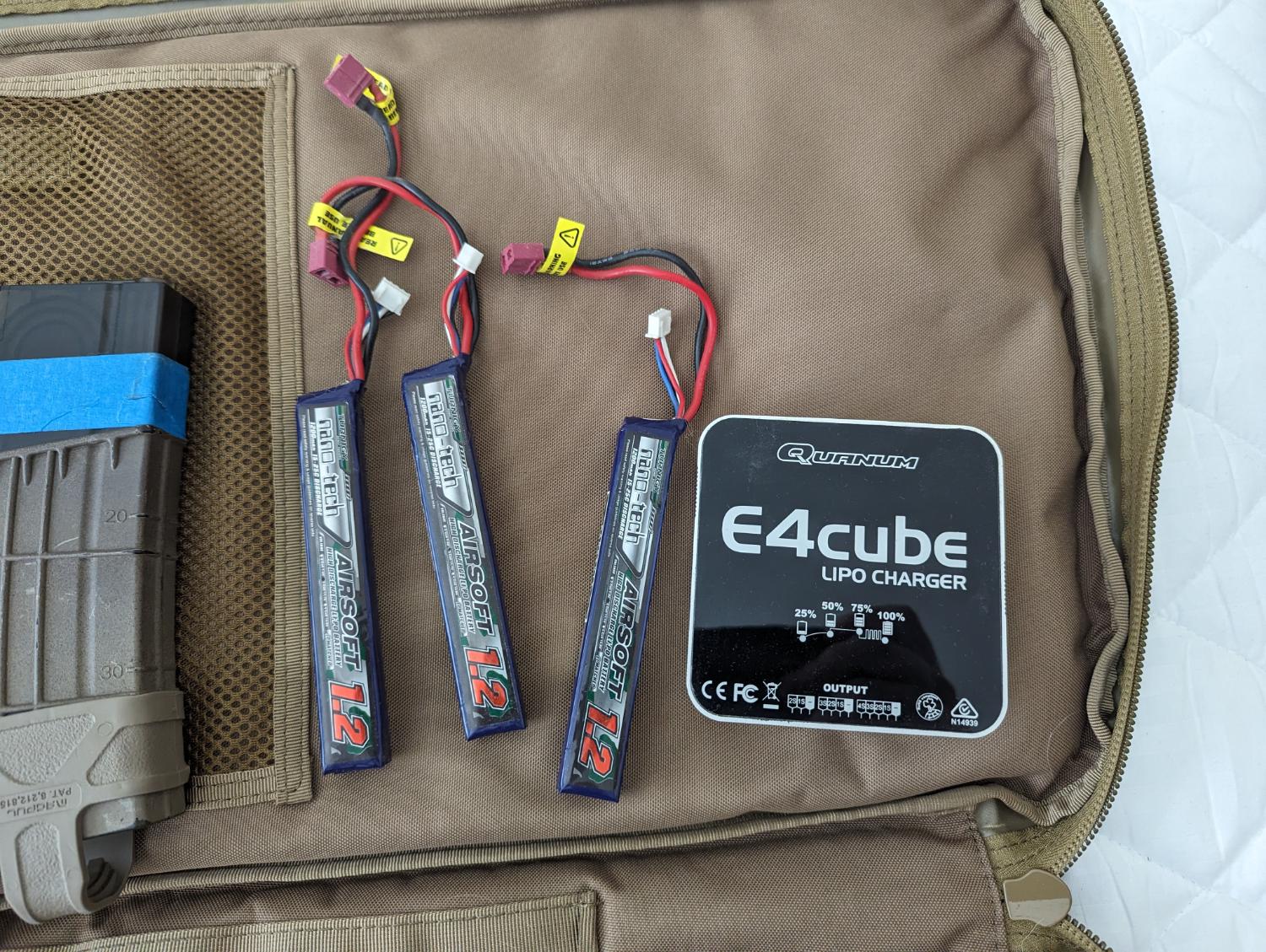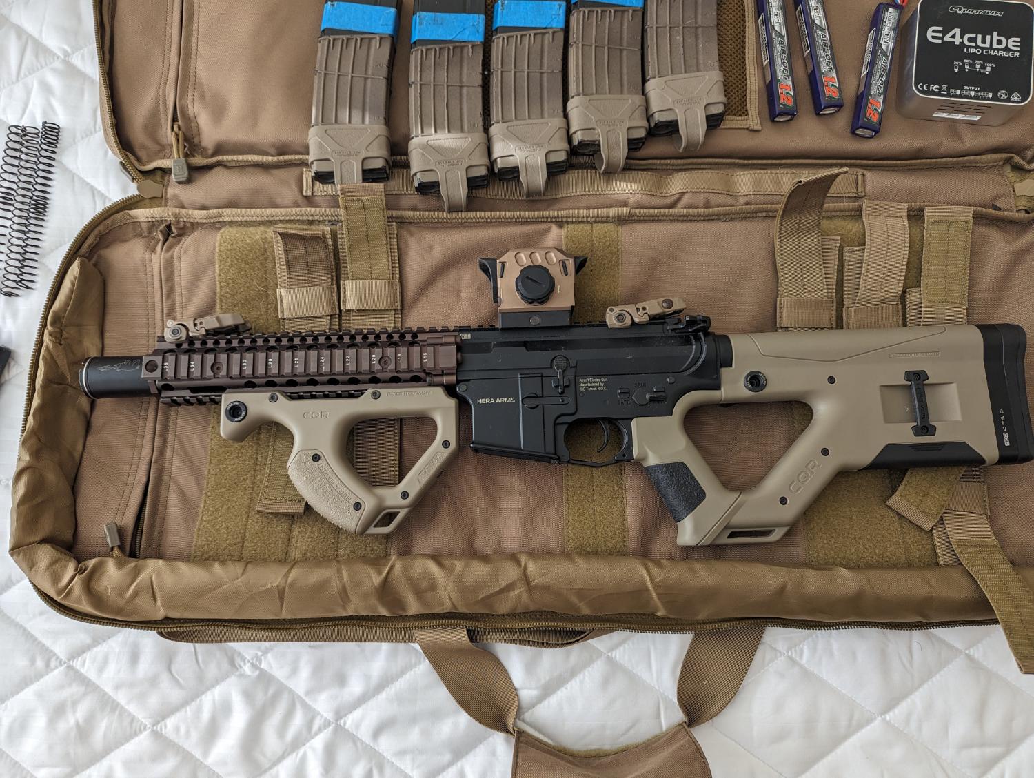 NUPROL BRONZE RAIL, SOUNDHOG CRACKER, AIM EG1 HOLO SIGHT, X3 nanotech 1200 mah, E4 cube lipo smart charger, X5 springs. X5 mid cap mags with quick pull, gunbag ripcord material