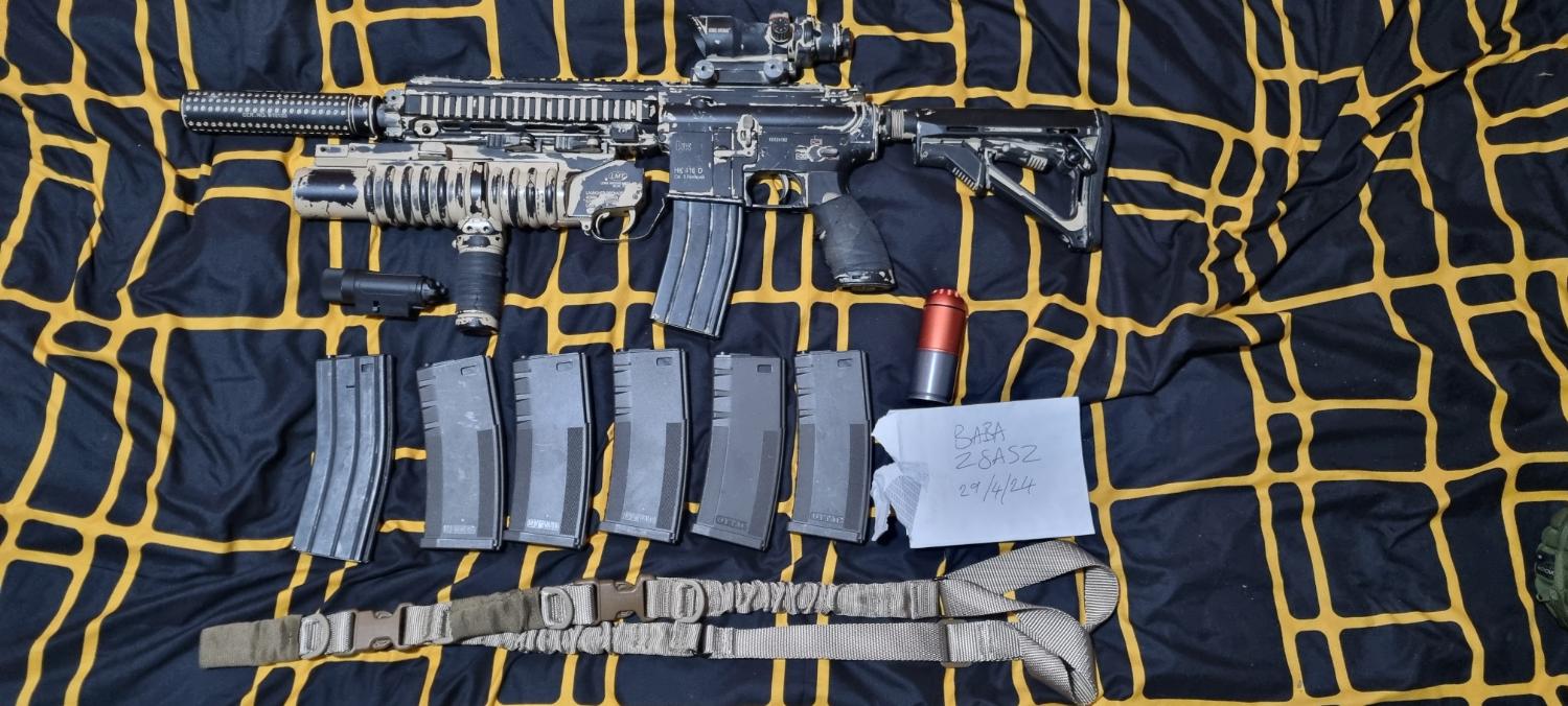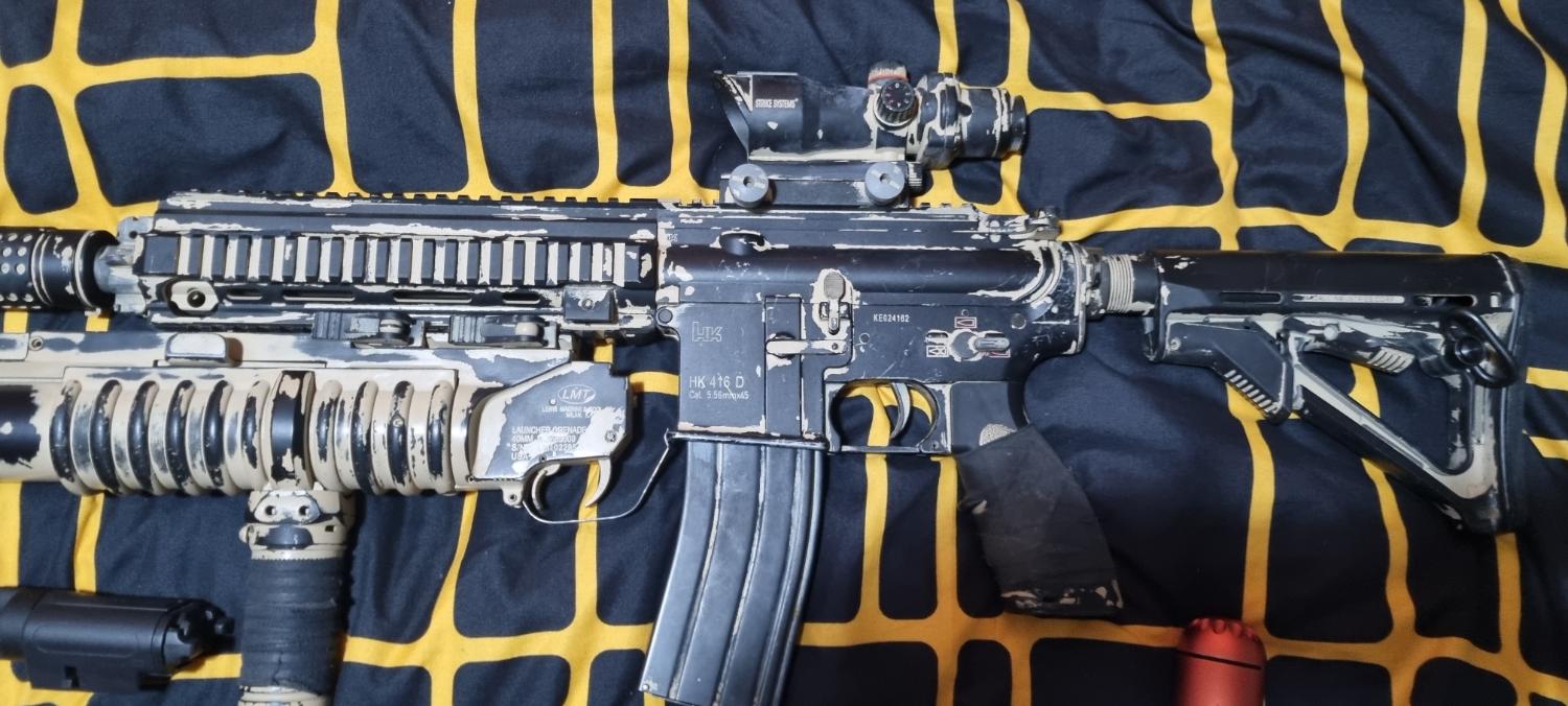 Full metal VFC HK416, full metal with all H&K trade markings, underbarrel 203 launcher compatible with standard shower shells and Reaper/Archangel CO2 projectiles. Magpul stock, suppressor, Acog, Small ris mounted torch for rifle/pistol.
