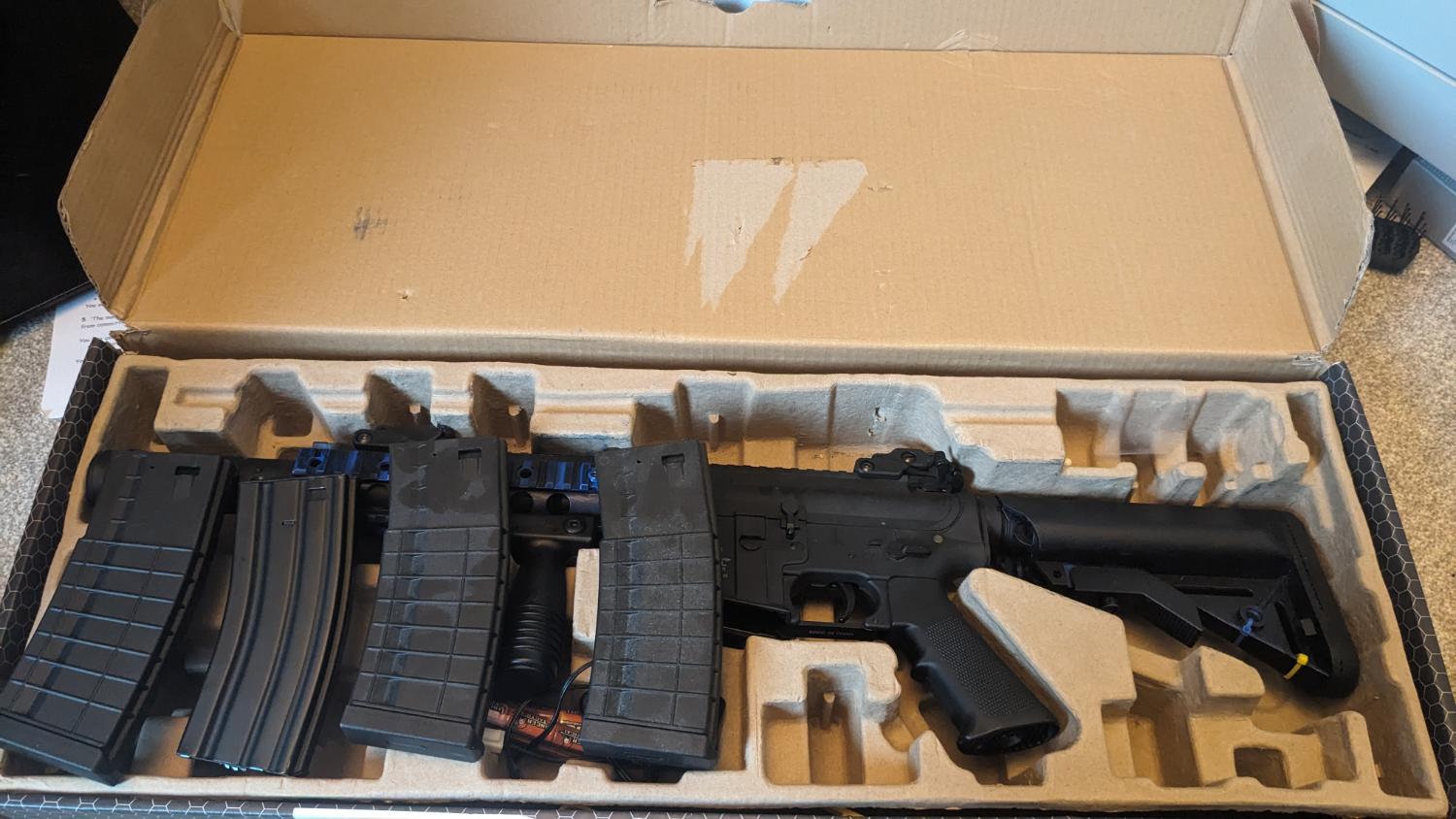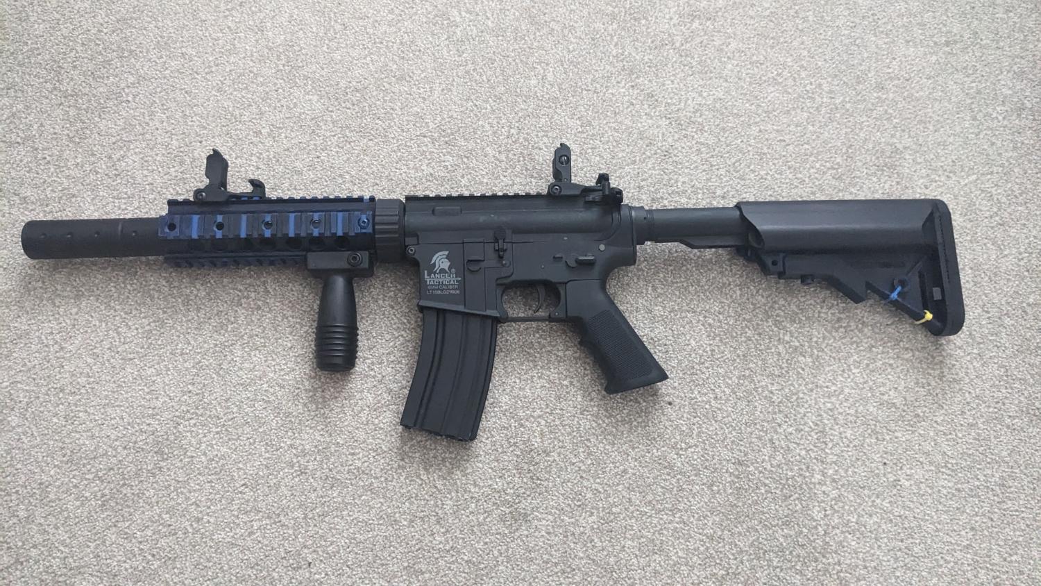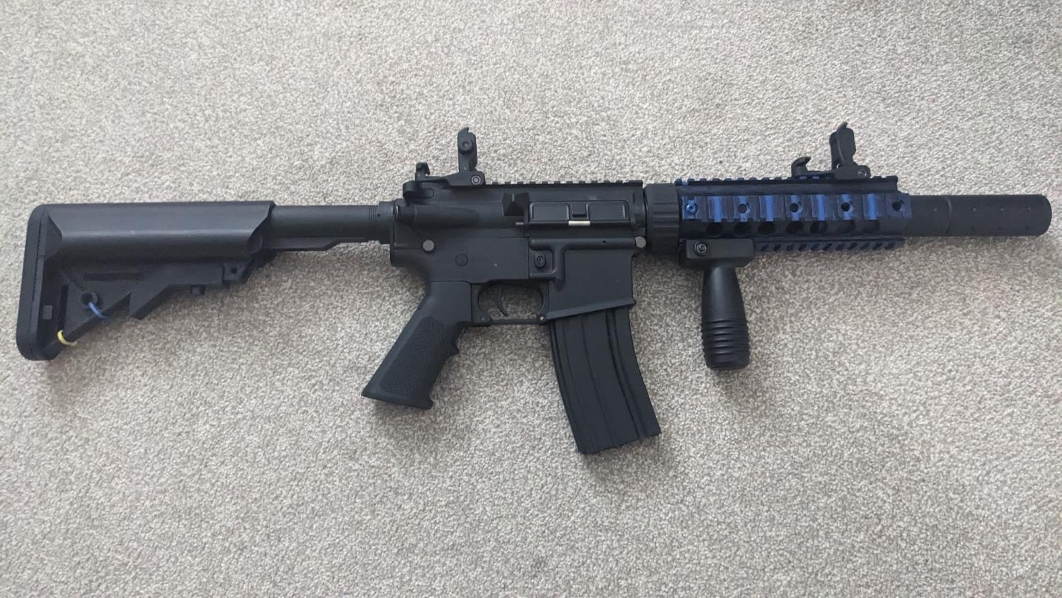 Good starter Rifle comes with 1x battery 1x charger 3x mid cap mags 1x high cap mag 1x speed loader 2 tone paint removed on stock as seen in pictures i used for a few months before i slowly stopped going to airsoft games. it works perfectly and the hop can be adjusted shoots at around 300-340 fps on the battery it comes with. Price is £150 and i am open to reasonable offers.
