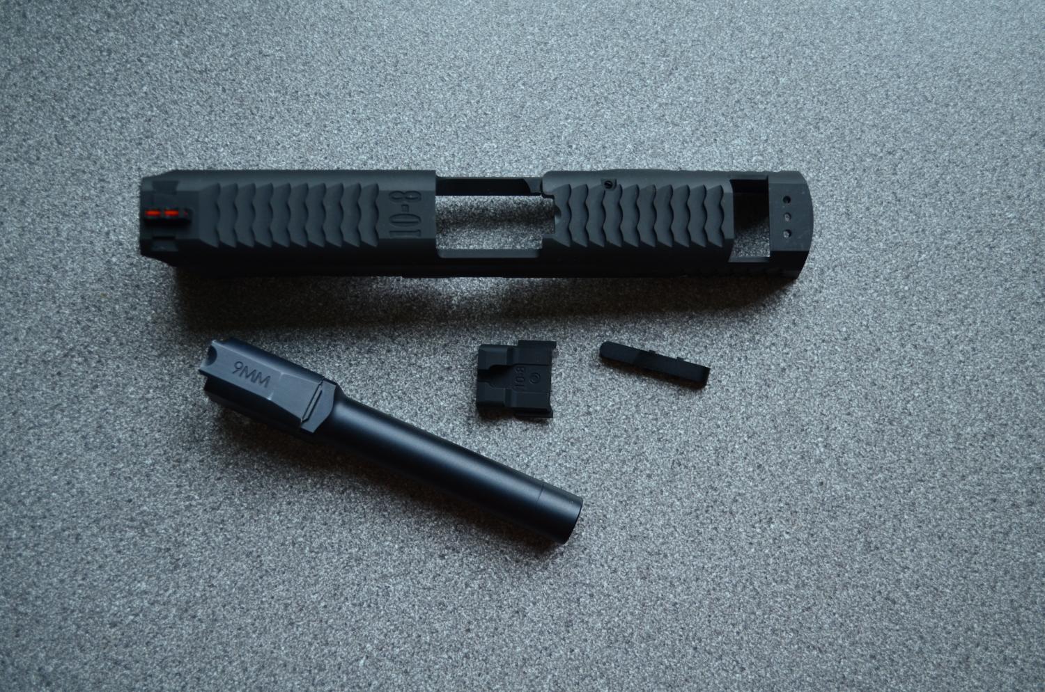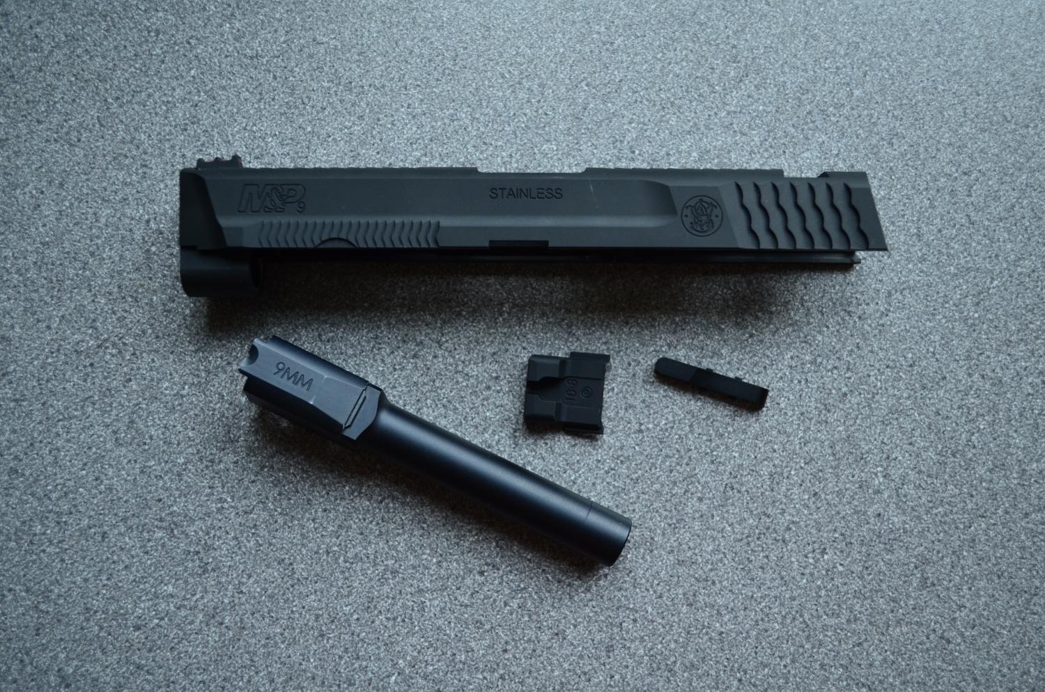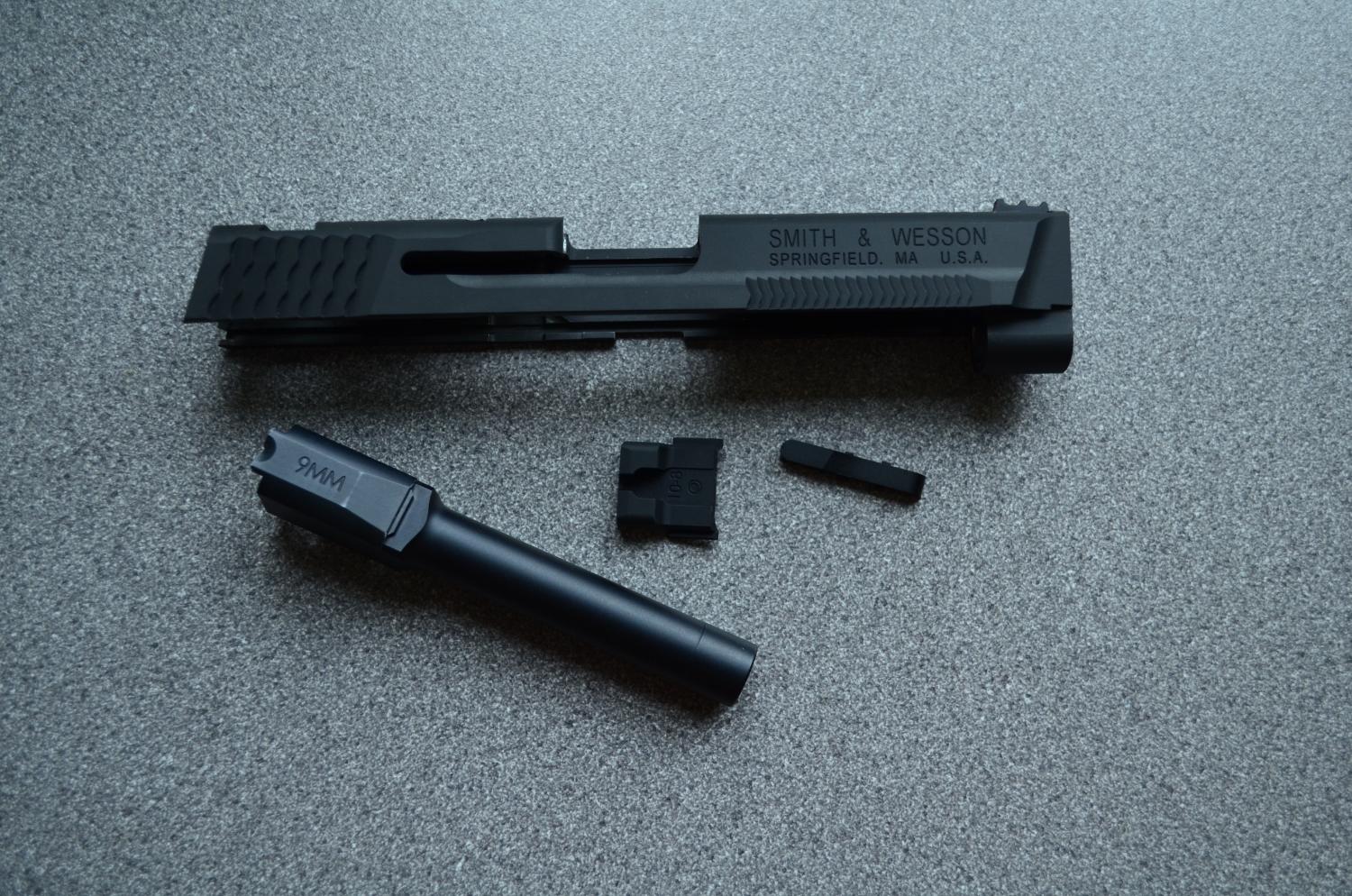 Nova 10-8 Performance slide for TM M&P9, comes with outer barrel, front and rear sights. Slide is super light, no hassle fit and performs awesome. I paid a premium for it as it's sold out everywhere but in Japan and Impluse 101 sourced it for me. I couldn't help putting it on my gun briefly for two to three mags worth of use, so little sign of use and some wear on the barrel hood which is unavoidable on the TM M&P's. Here is a review :