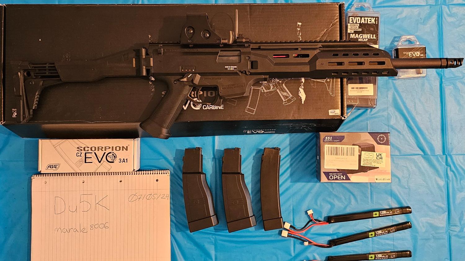 Evo scoprion 3 A1 Carbine 2018 Revision, Amazon Holo Sight, Lens Protector, 1 Mid cap & 2 High Cap magazines & 3 sets of batteries with a few extras such as magwell hicap and spring guide - £350