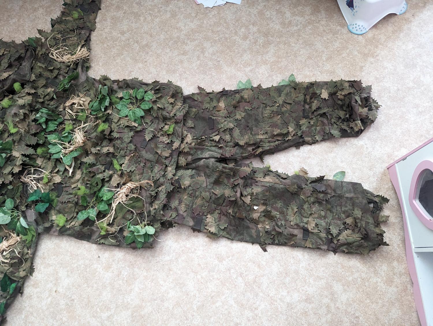 Partly crafted suit with balaclava. crafted mesh goggles with chest rig and pistol holster attached covered with jack pyke tape the suit has elastic straps for natural foliage to be attached to. Been skirmished about 5 times. Reason for selling is I don't go anymore.