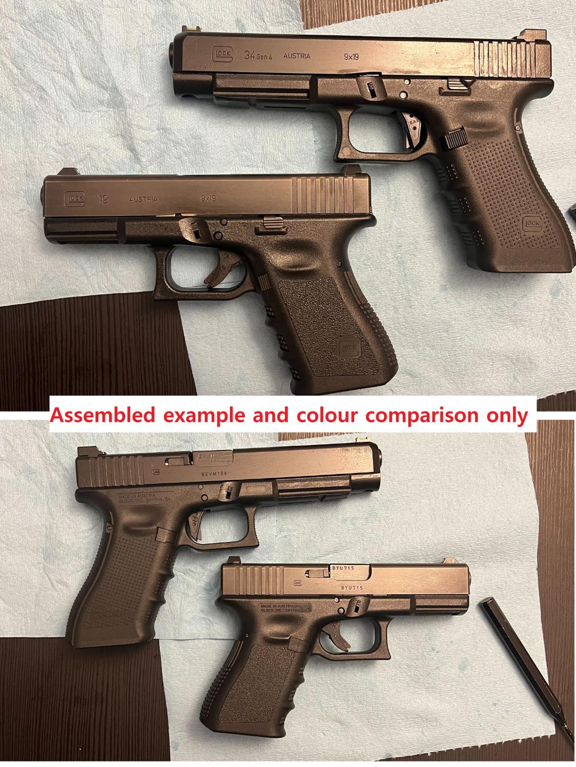 The original finish has been carded off as I wanted to mimic the now discontinued shiny tenifer finish on older Glocks and smoothed out the matte-black guarder finish with a brass brush and polish. It's more of a shiny gunmetal grey vs. the original matte black now, I've attached some assembled examples and comparisons with a brand-new Guarder steel slide G34 so you can get a sense of the difference in colour to the Guarder finish from the factory.