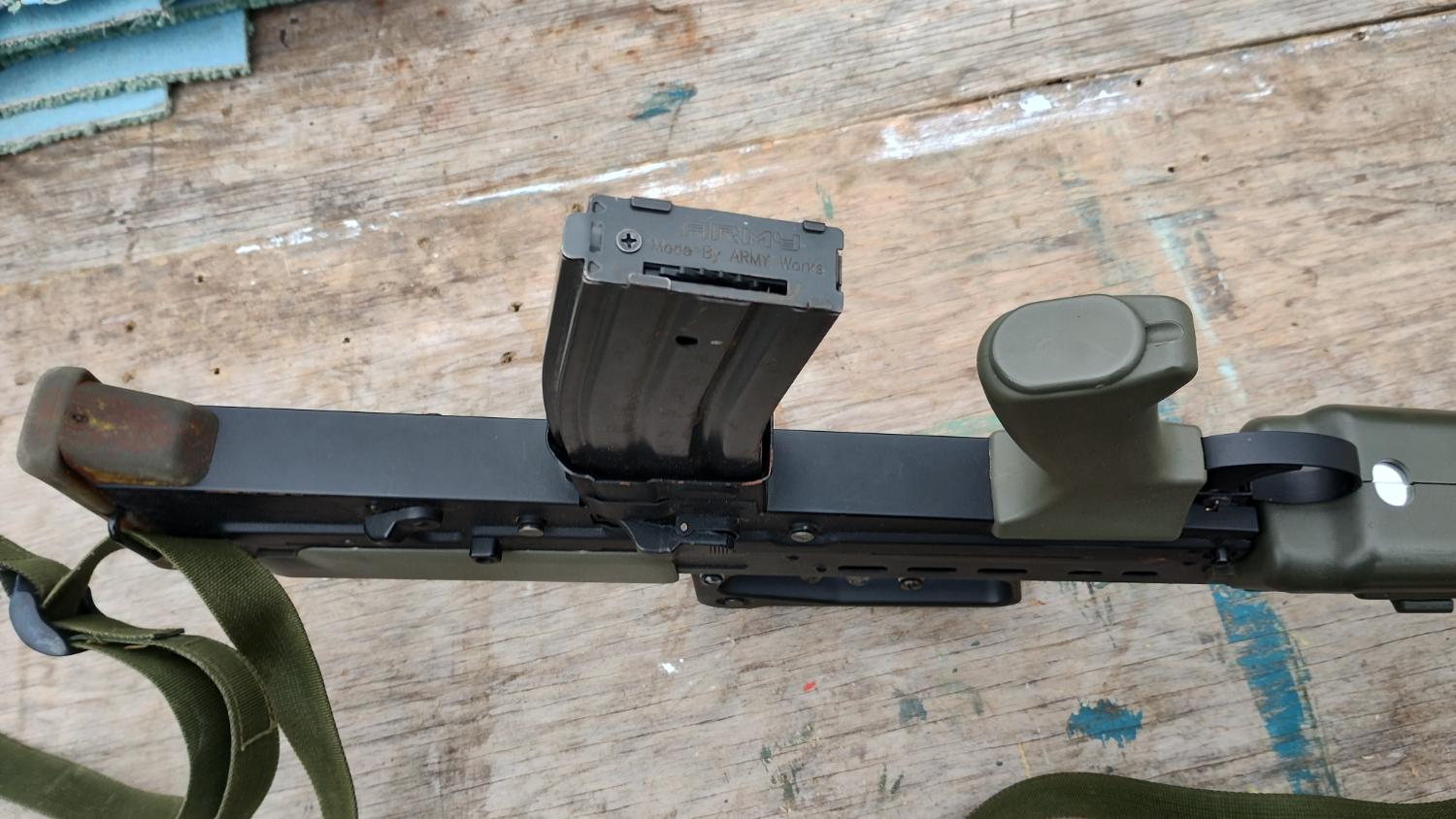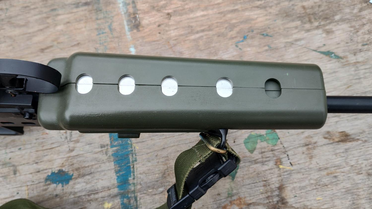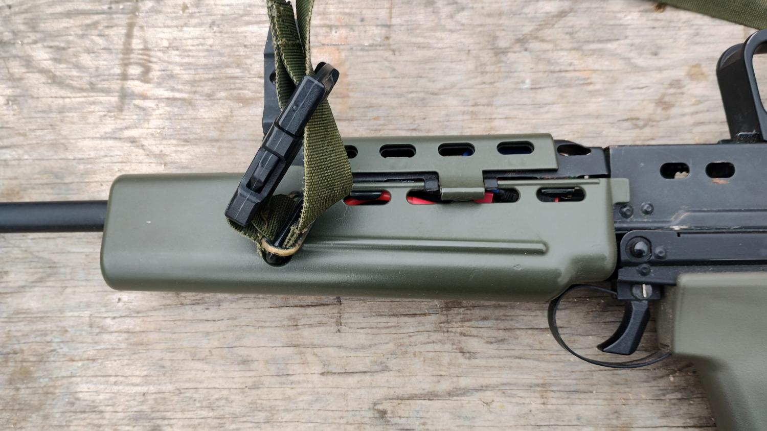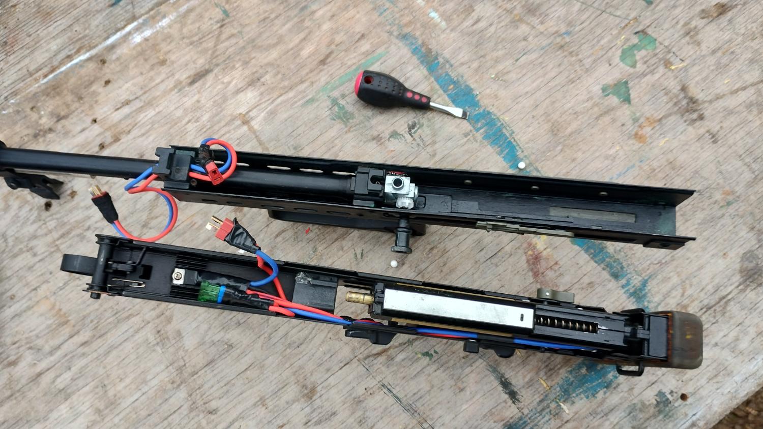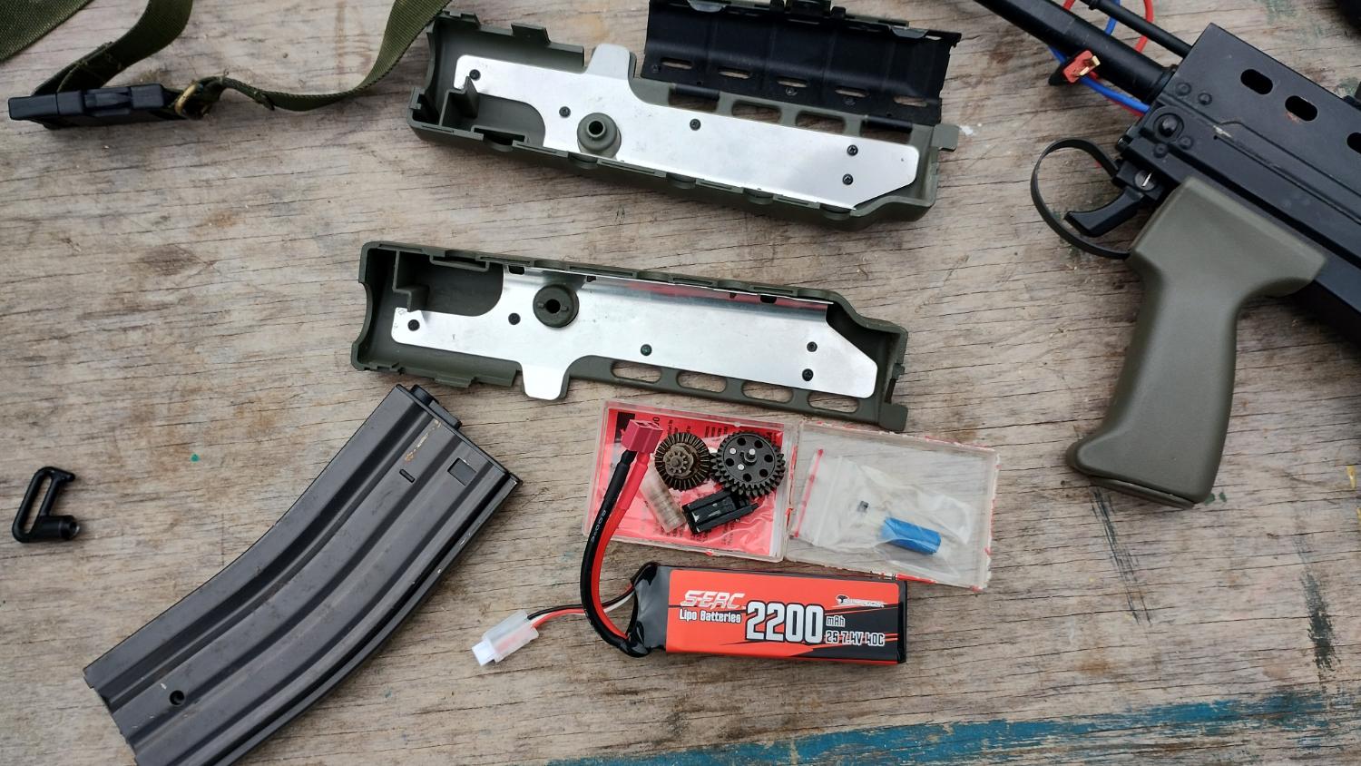 has mosfet trigger, upgraded hop up (systema iirc), upgraded gears (originals inc.), blow back disabled since new (comes with the bit to re-enable if wanted)