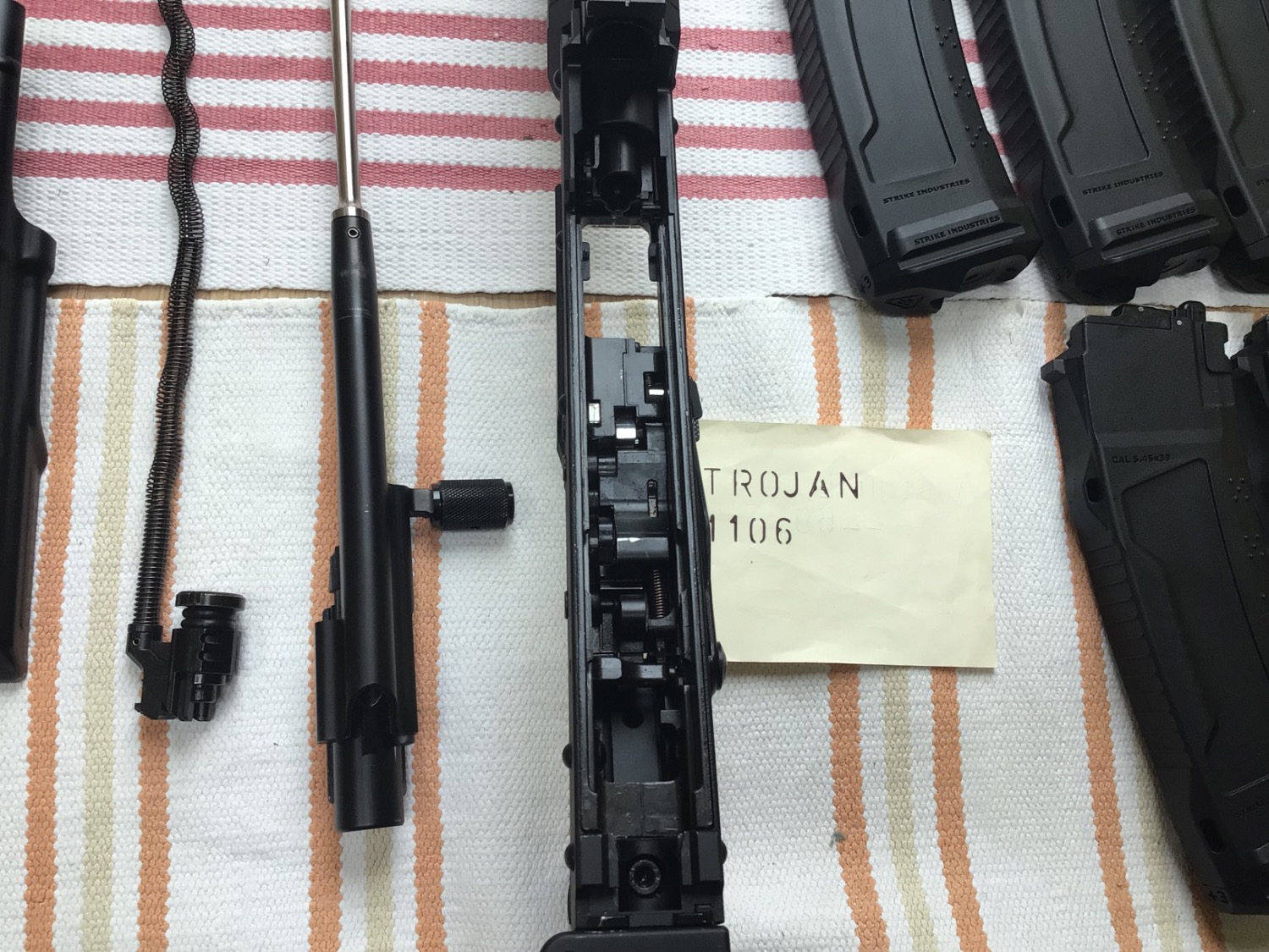 Tokyo Marui AKM gbbr fitted with SLR rail system, SLR folding stock, SLR flashhider, Magpul clone pistol grip & rail covers, foregrip, Angry Gun hard kick piston, extended magwell & red dot sight. 9 gas tight Strike Industries mags for the AKM (the three with elastic bands don’t always stop on empty).