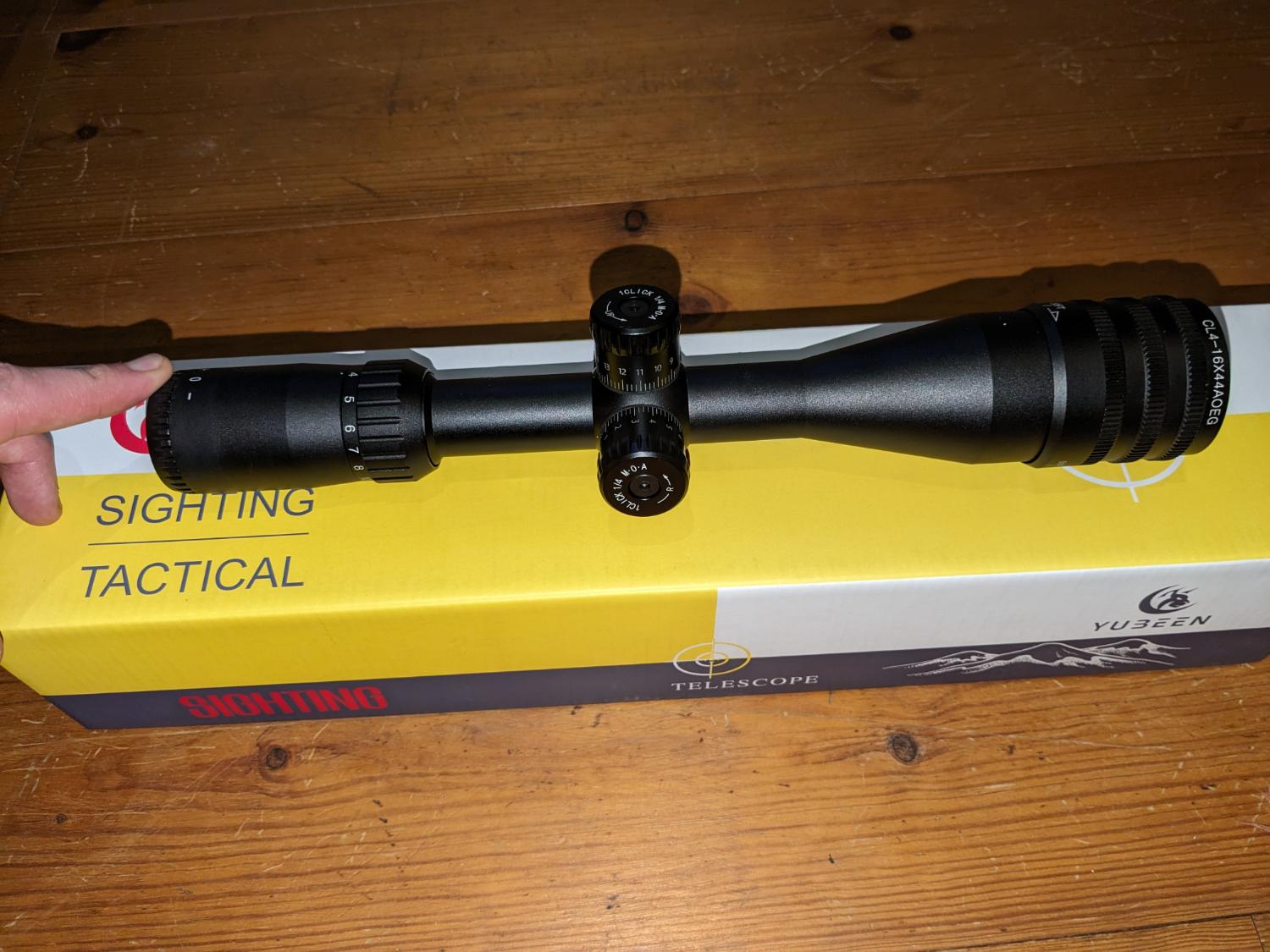 Literally as new 4-16x44 AOIR Rifle Scope with sunshade and flip up covers, the one I've assembled for the photos is my other identical scope, so the one you are buying hasn't even been taken out of the box.
