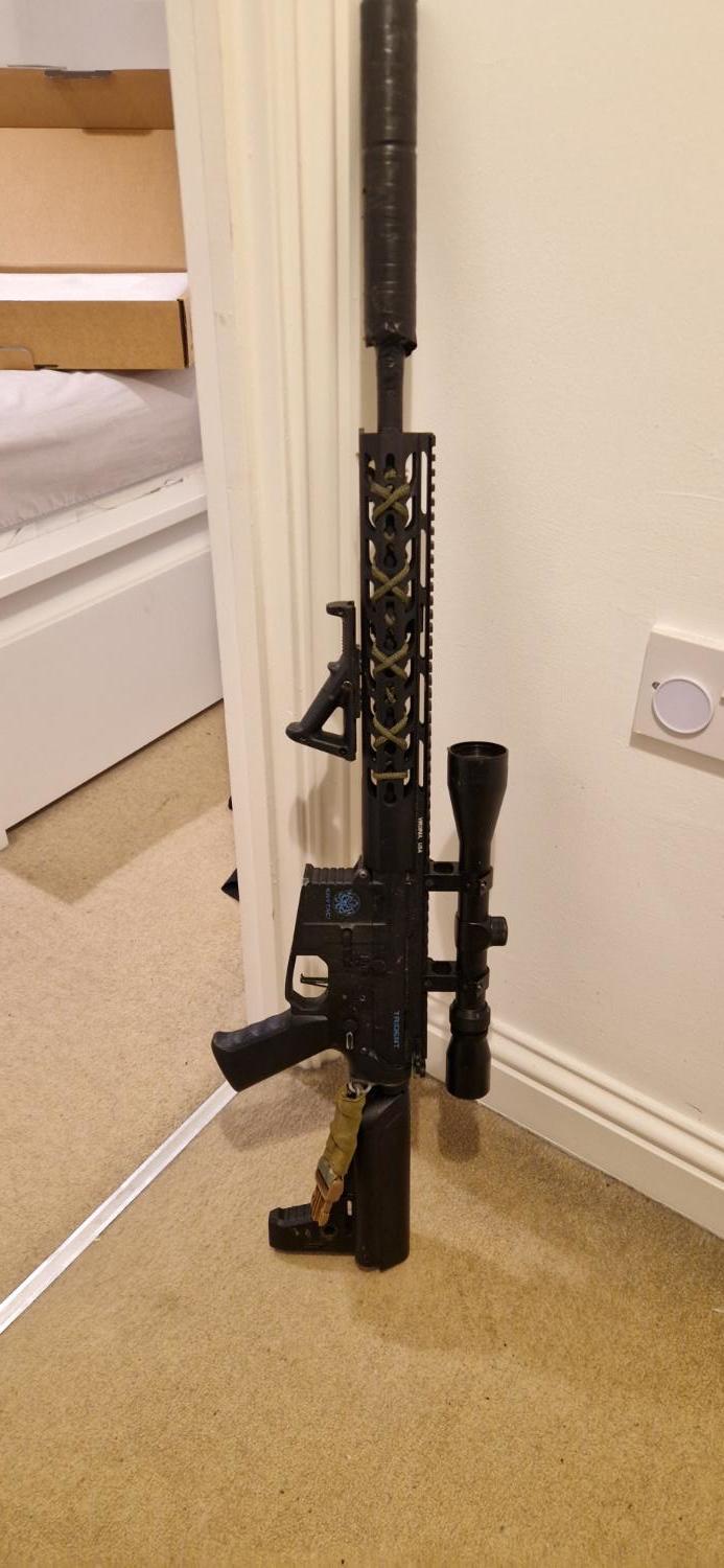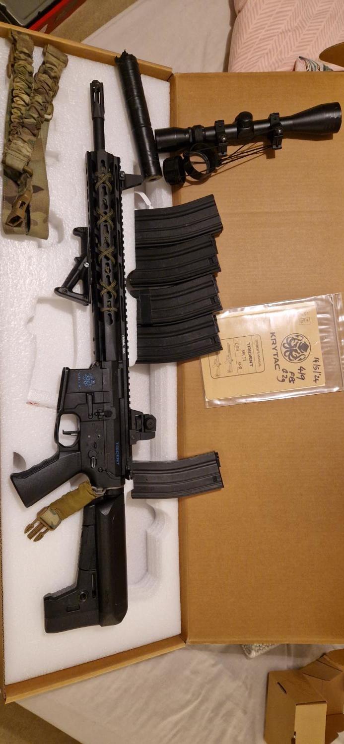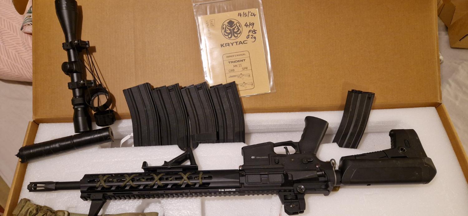 Leaving the hobby so need to sell my pride and joy. She is a krytac spr mk2, modified to be single shot only, deans converted, dmr spring. At time of posting she runs 420 fps with 0.2g and no hop. Runs nicely on a 7.4v lipo. Shoots like a laser and has totted up a LOT of hits! Selling with the 3-9x40 scope, angled foregrip and suppressor (which is tan but wrapped in black tape) and sling. Original high cap included and 4 medium cap mags. Has been out on many skirmish days and shows evidence of this through some wear around the selector, mag well and other high contact areas. There is a hole drilled in the receiver so that single shot lockup can be released without stripping down in the event of this happening (only happened twice for me). Selector plate is cut so it will only fire single shot even on auto position as per legal requirements. Can post for about £10. Offer what you think is reasonable!