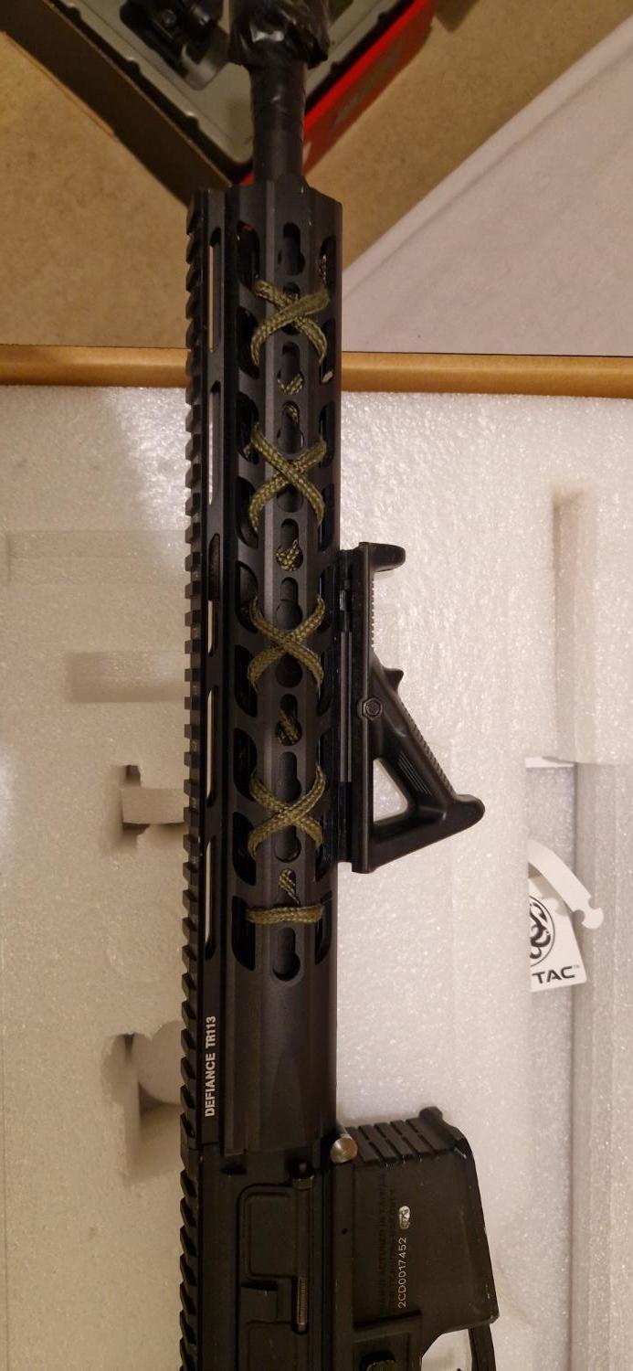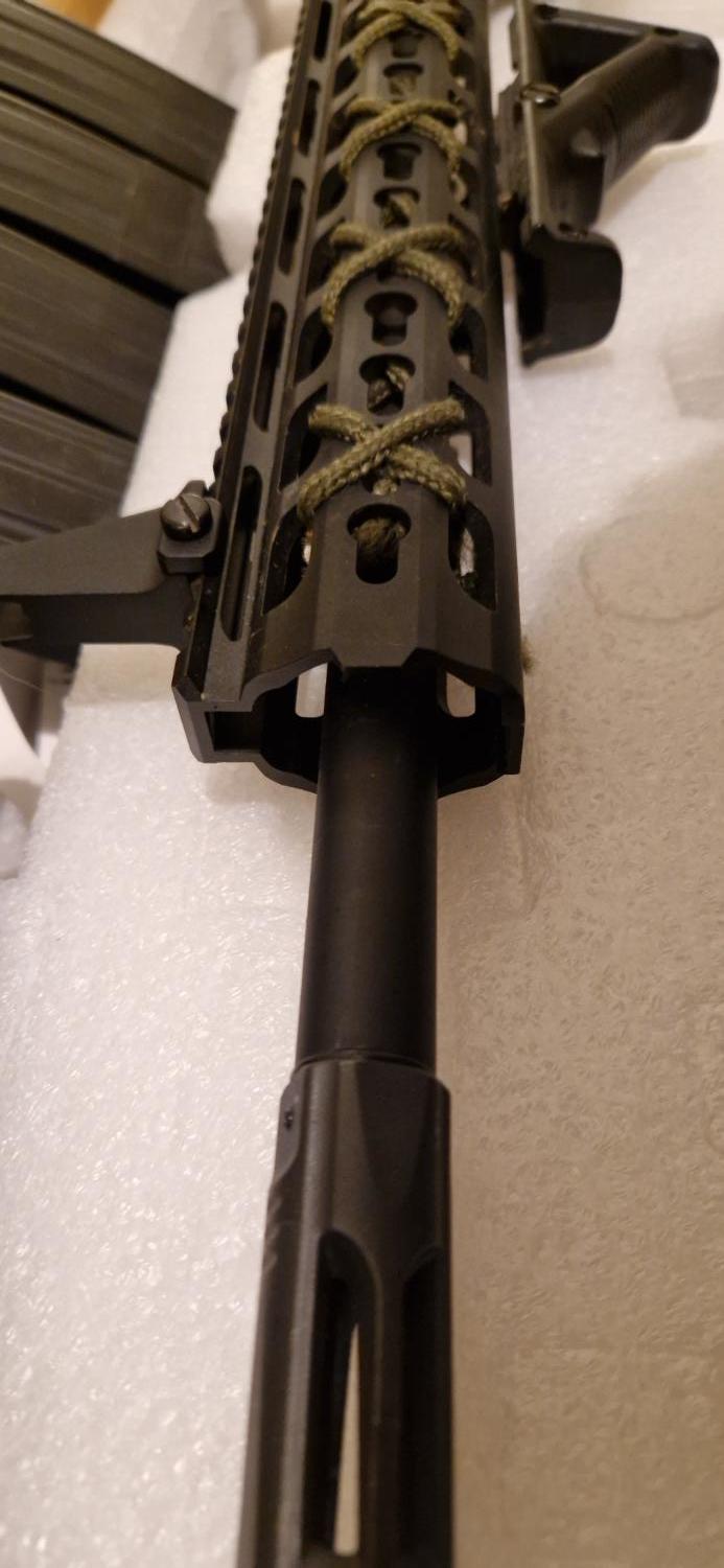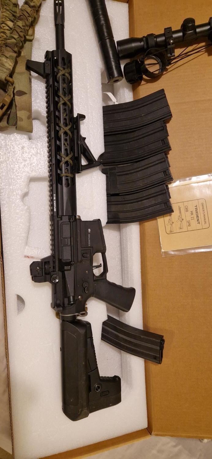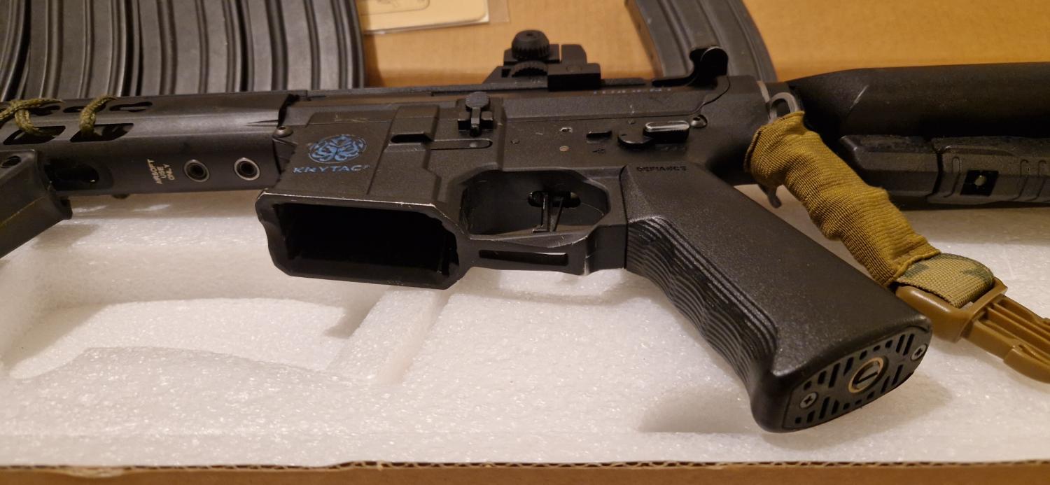 Leaving the hobby so need to sell my pride and joy. She is a krytac spr mk2, modified to be single shot only, deans converted, dmr spring. At time of posting she runs 420 fps with 0.2g and no hop. Runs nicely on a 7.4v lipo. Shoots like a laser and has totted up a LOT of hits! Selling with the 3-9x40 scope, angled foregrip and suppressor (which is tan but wrapped in black tape) and sling. Original high cap included and 4 medium cap mags. Has been out on many skirmish days and shows evidence of this through some wear around the selector, mag well and other high contact areas. There is a hole drilled in the receiver so that single shot lockup can be released without stripping down in the event of this happening (only happened twice for me). Selector plate is cut so it will only fire single shot even on auto position as per legal requirements. Can post for about £10. Offer what you think is reasonable!