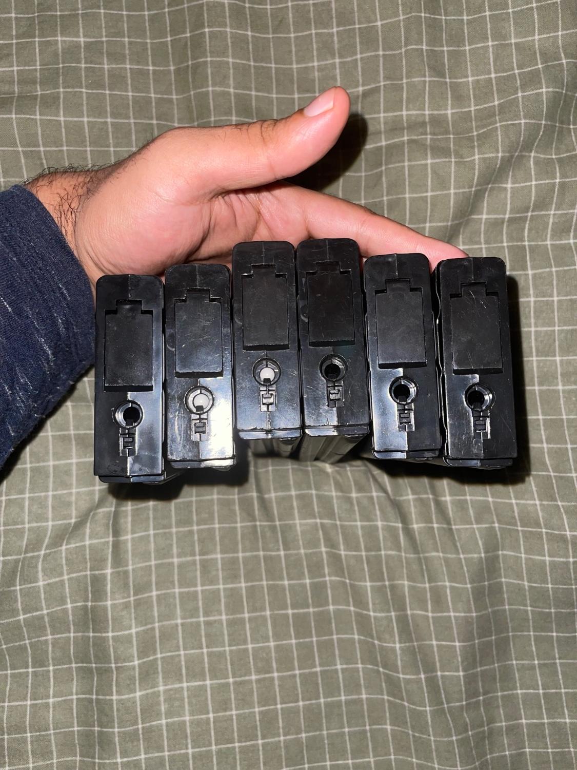 The magazine at the far left on the first 4 photos and isolated in the 6th photo has a more polymer finish whereas the rest have a metal finish.