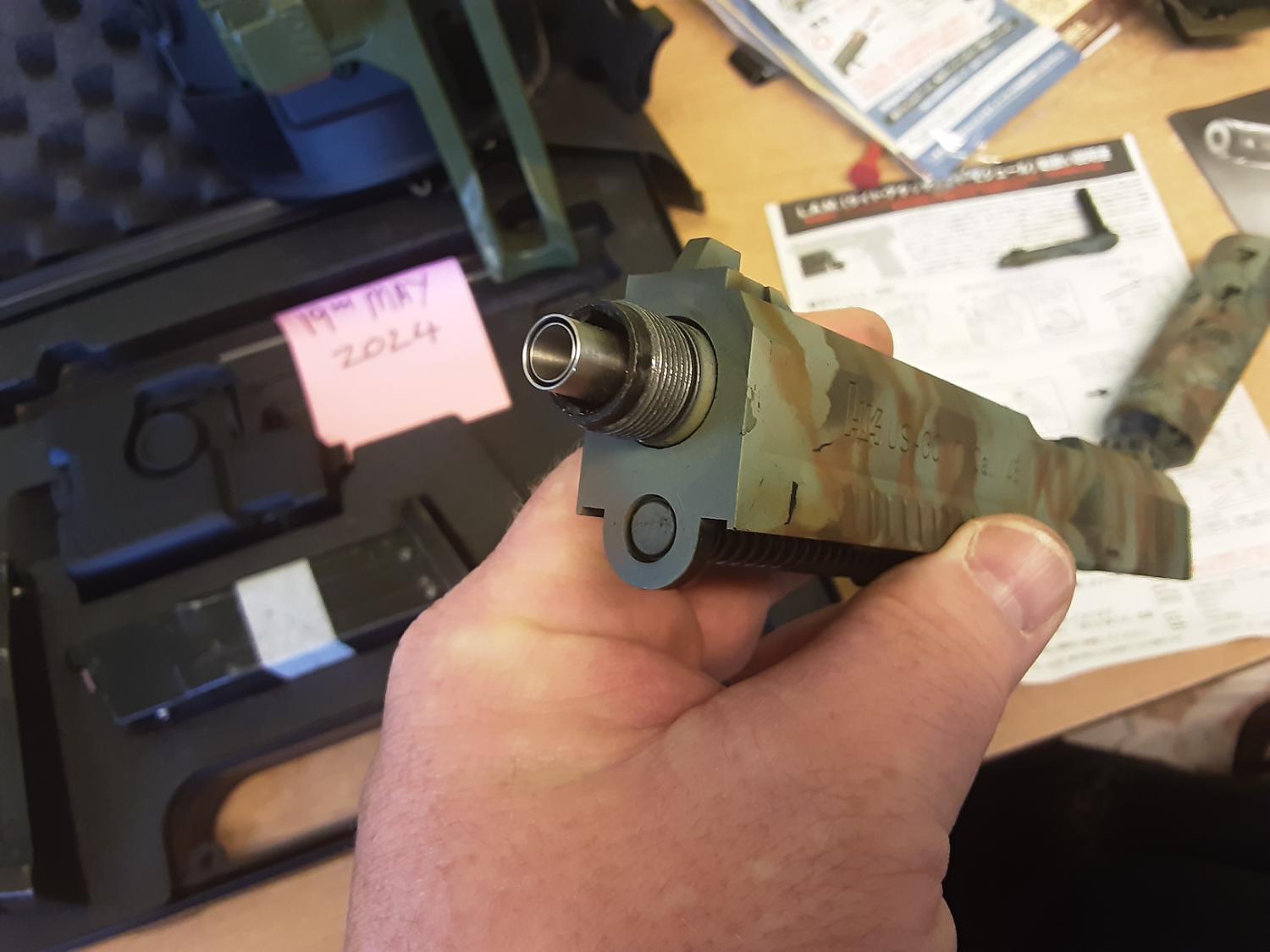 The pistol has TDC with autobot bucking and H plate, the gun is 150mm maple leaf, silent trigger, short HEX suppressor by sniper mechanic and a 20mm rail.