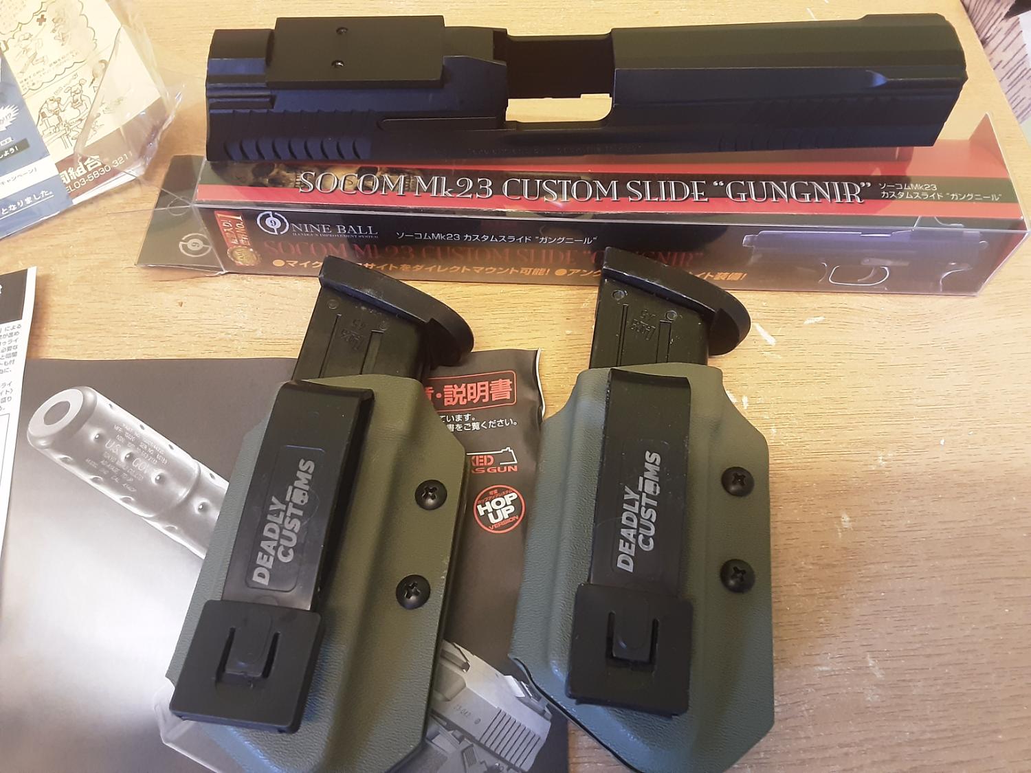 You get a leg drop with a DTD holster, two deadly customs mag holsters, SOCOM MK23 custom slide (Gungnir), the LAN unit and box with guides.
