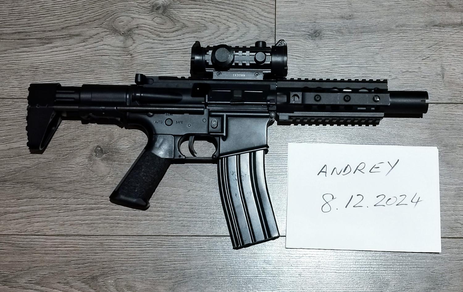 Has a stippled pistol grip, red dot, sound amplifier.