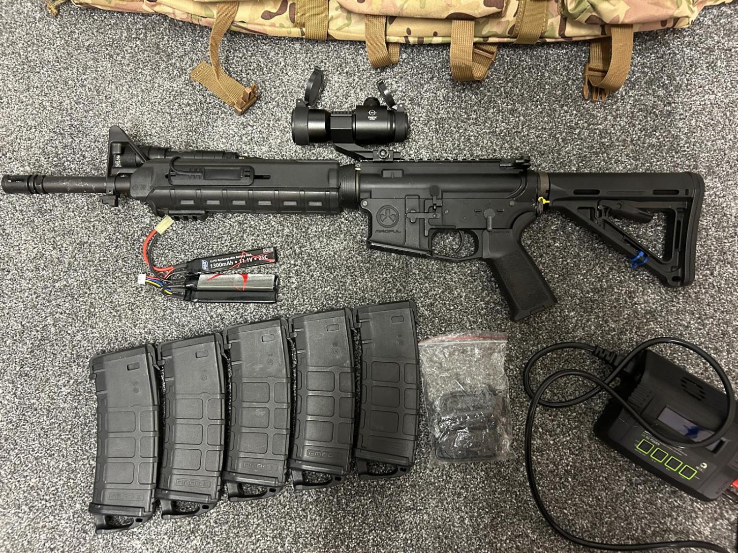Bag, Torch, Pressure pad, red dot, mags (charger and battery if collected)