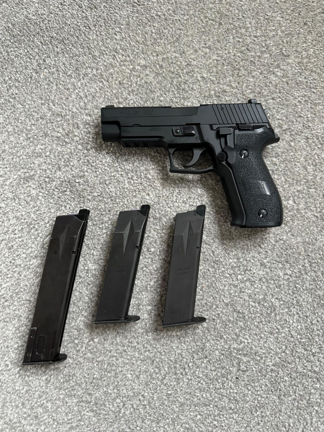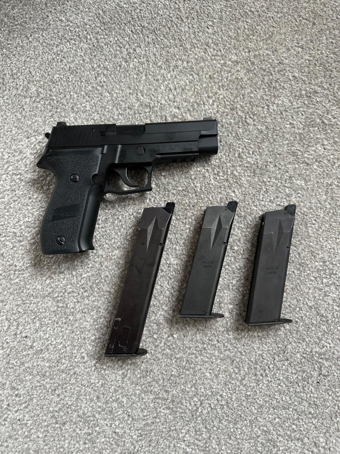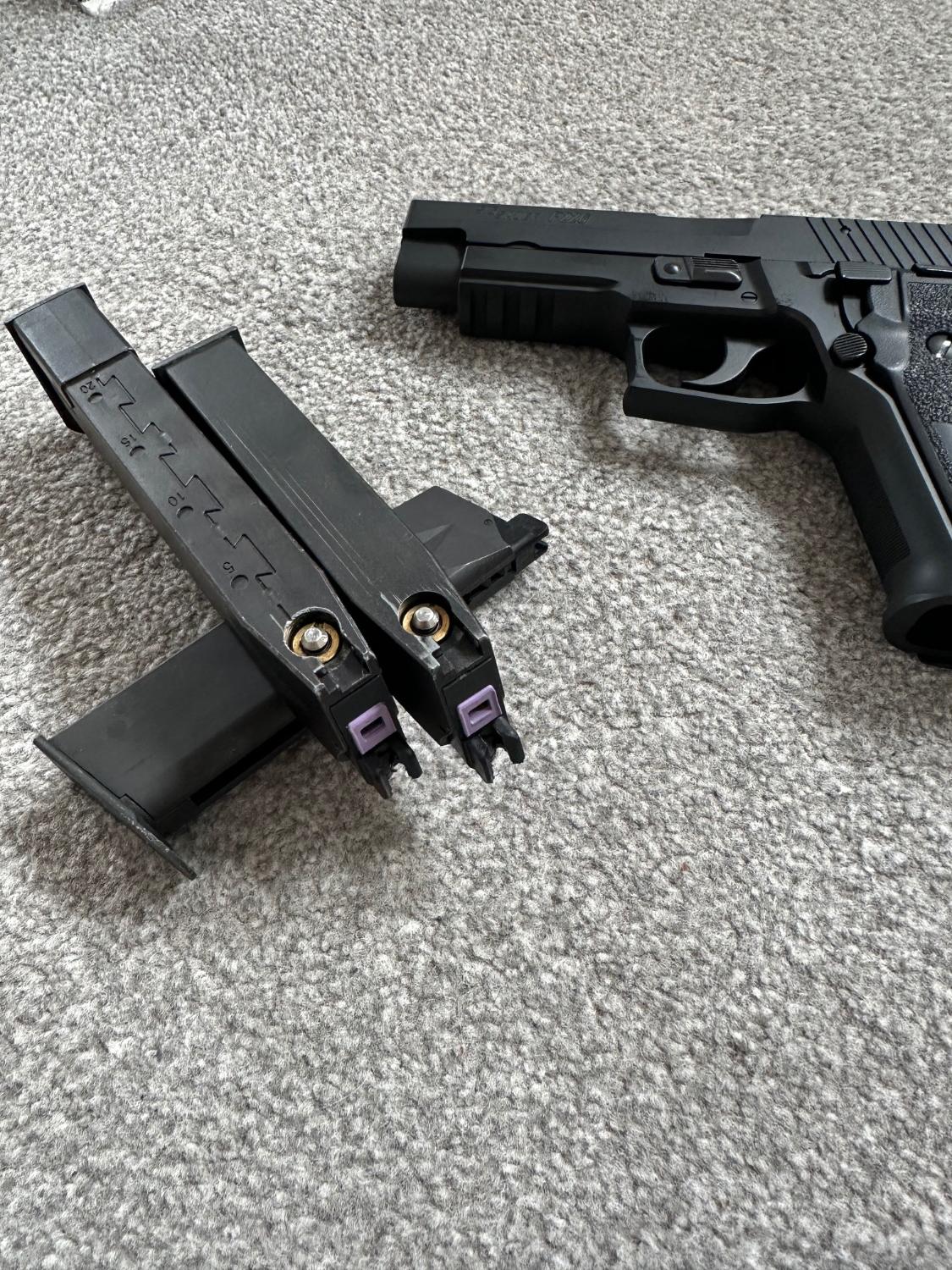 Tokyo Marui sig p226 with 2 standard magazines and one extended magazine, two mags have Laylax purple routers