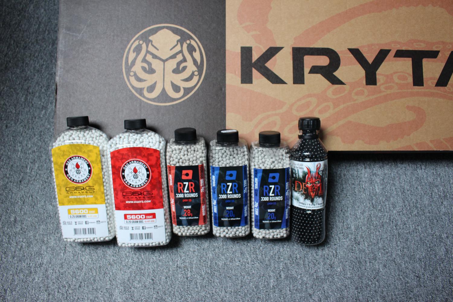 - G&G 5600 0.2g bb's, G&G 5600 0.25g bb's, 2x RZR 3300 0.2g bb's & 1x RZR 3300 0.28g bb's and Devils 3000 black 09.2g bb's