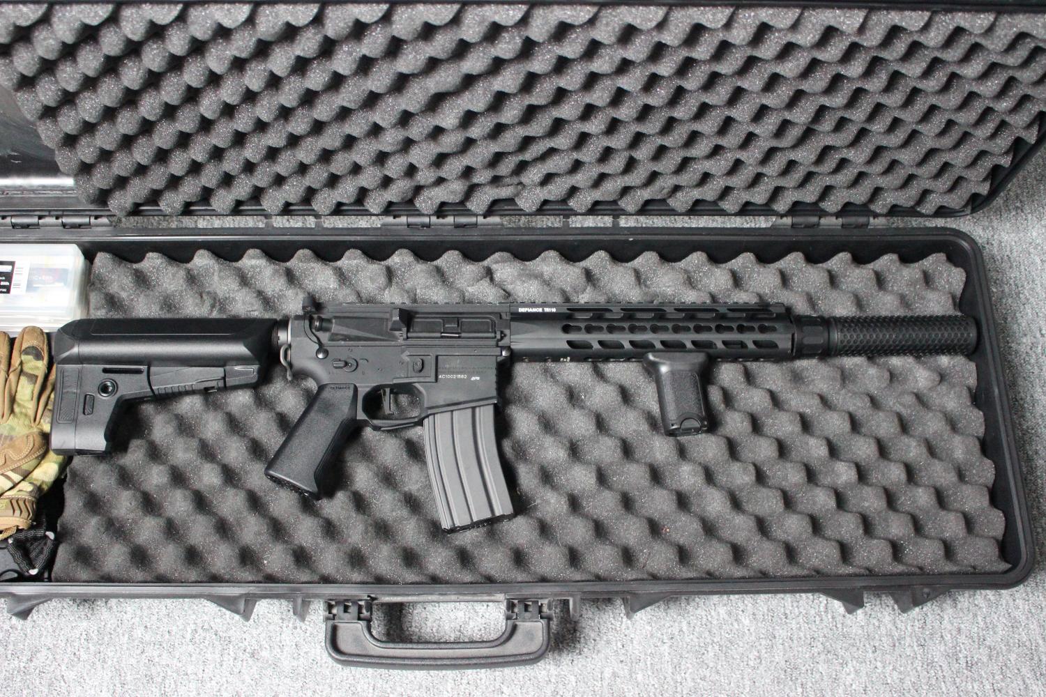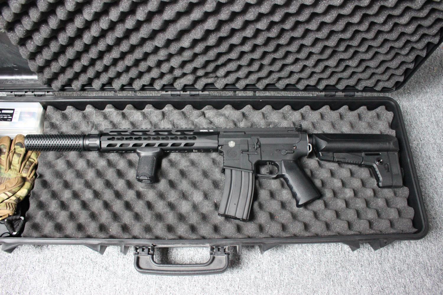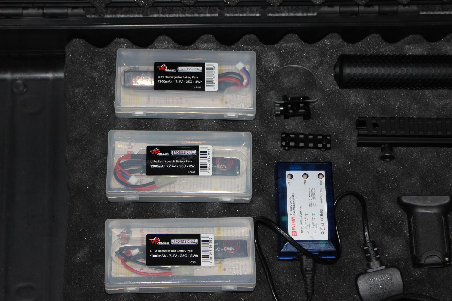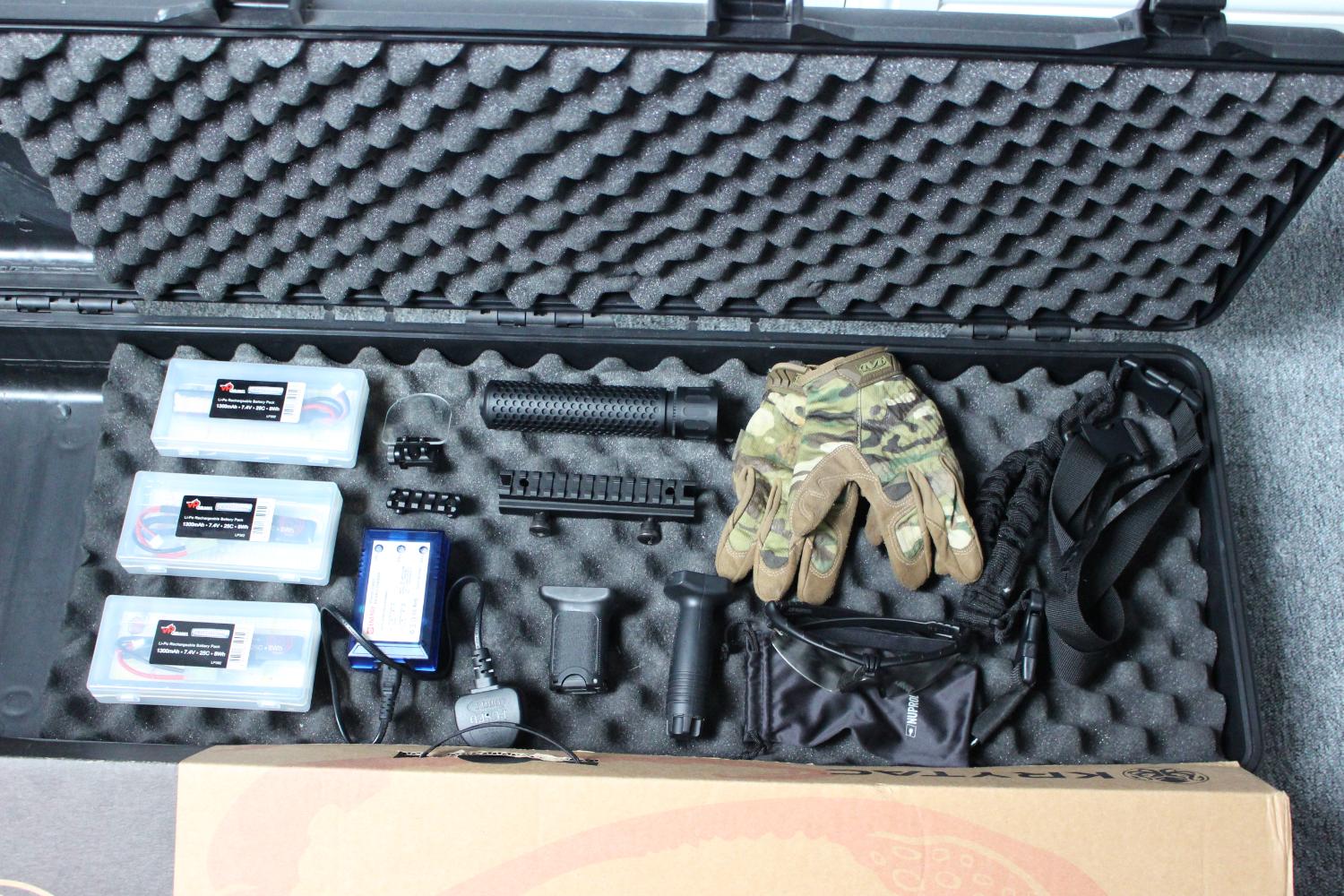 Suppressor, 3 batteries and charger, scope riser mount, sling, various bb's, scope flip protector, mechanix multicam, 2x grips gloves