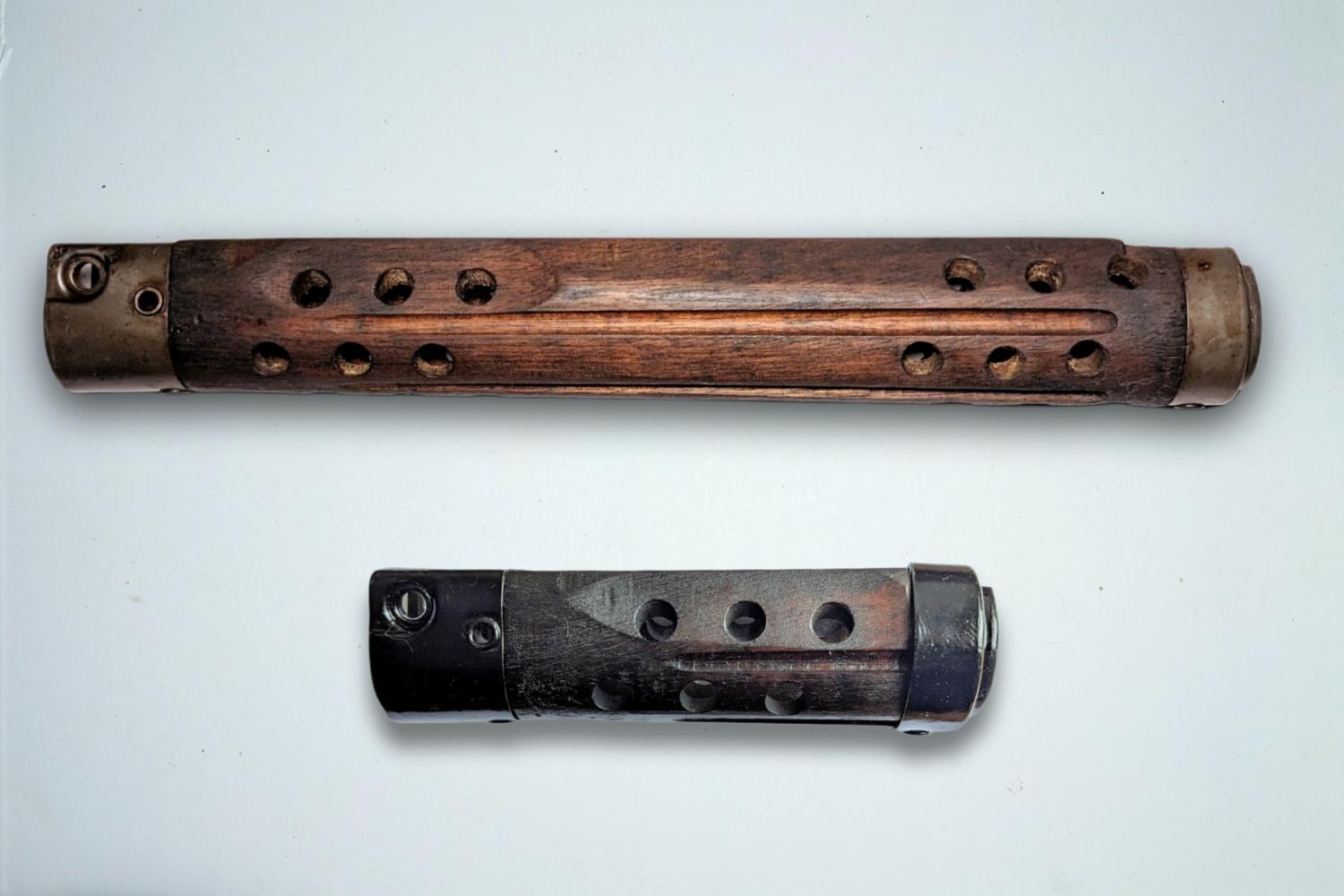 This handguard is unissued. Only has small storage and handling marks on the metal ware. The surface of the wood is coated with a thin layer of Tru-oil for preservation.