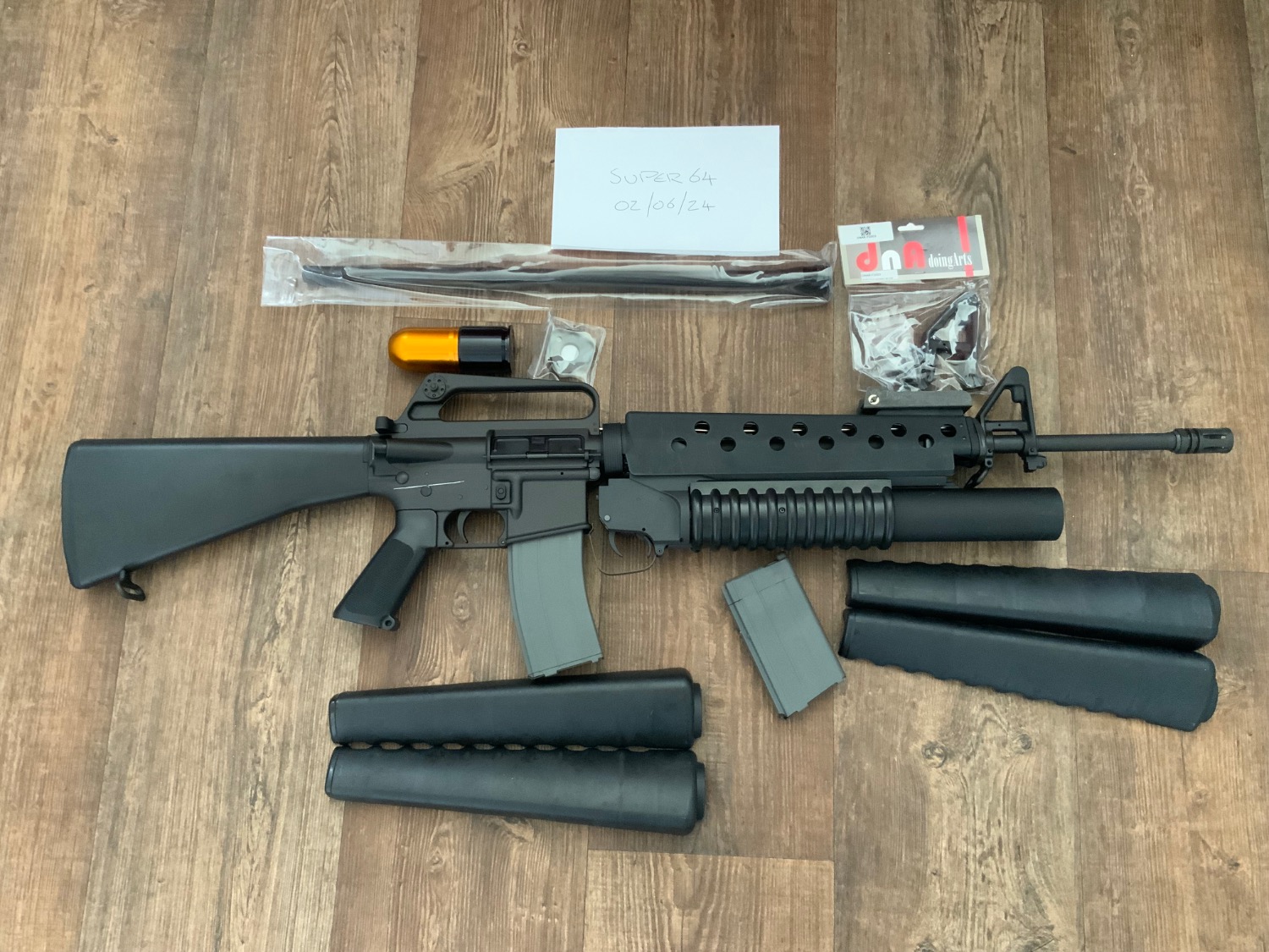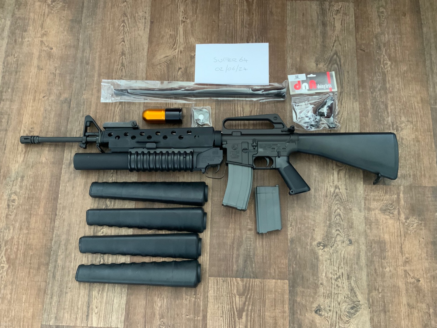 Accessories: G&P M203, 2 x leak free magazines, leak free 40mm grenade, original handguard and DNA handguard, DNA steel outer barrel, DNA steel M16A1 front sight post and DNA steel handguard cap.
