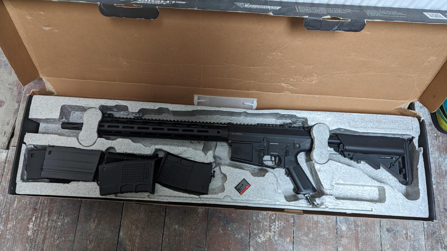 Base Gun - G&G Knights Armament SR25 E2 APC M-LOK G2H £420 ( https://www.davescustomairsoft.co.uk/sr25-e2-apc-m-lok-rifle-replica?search=sr25&sort=p.price&order=DESC )