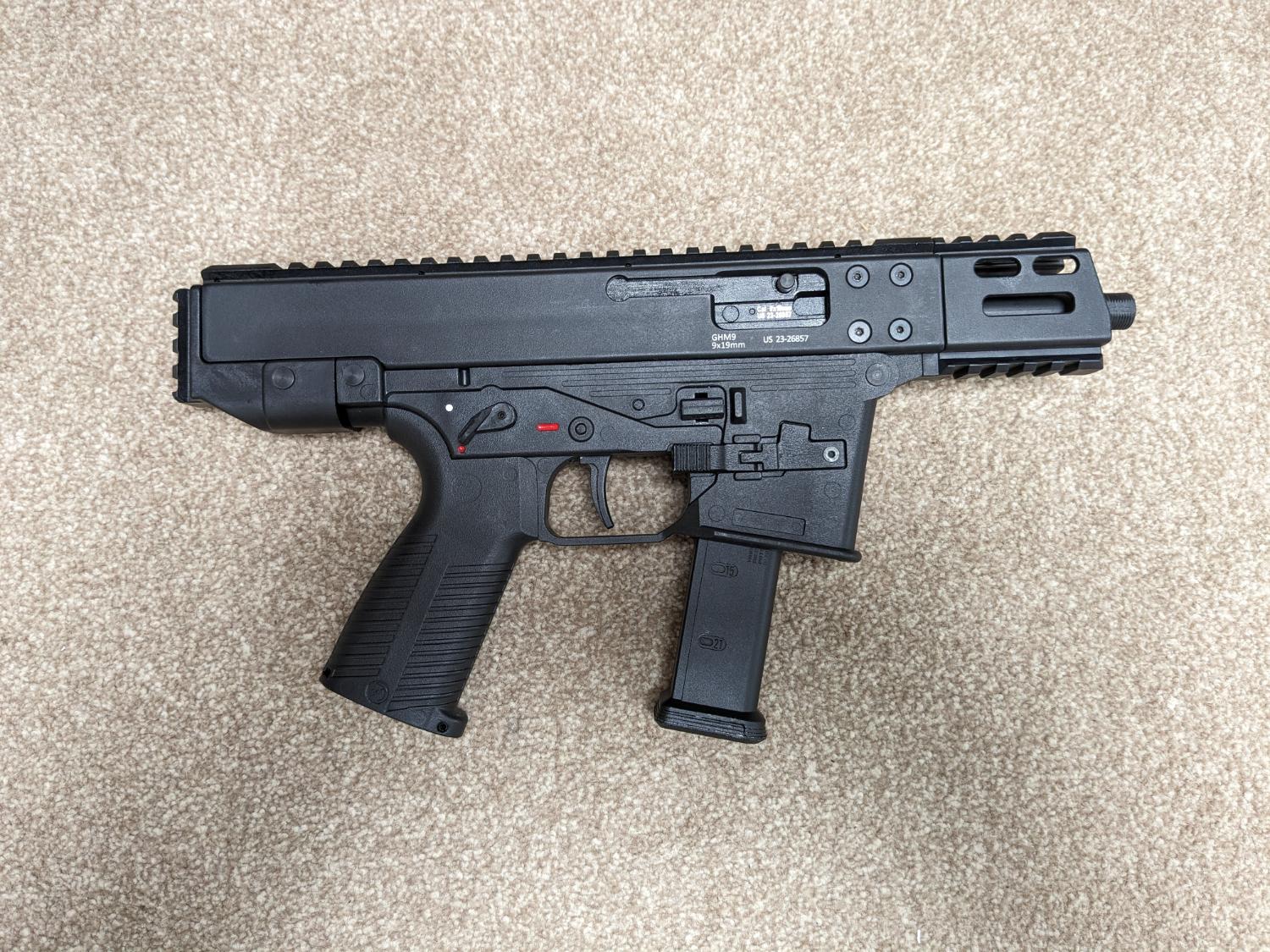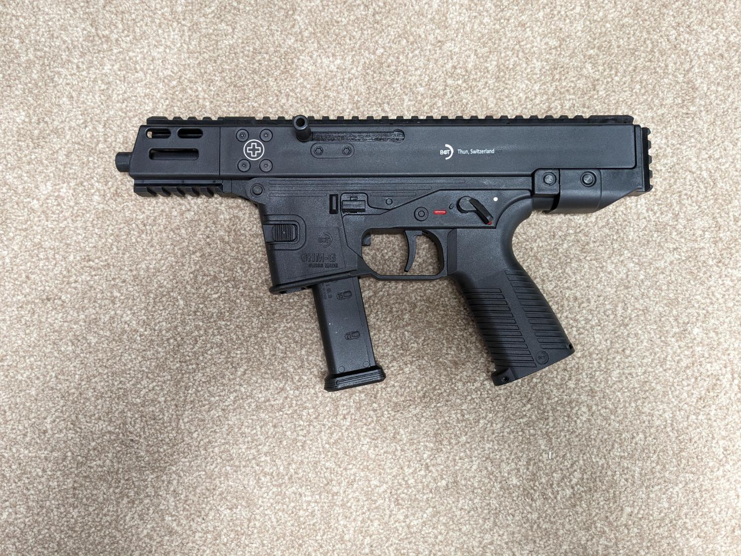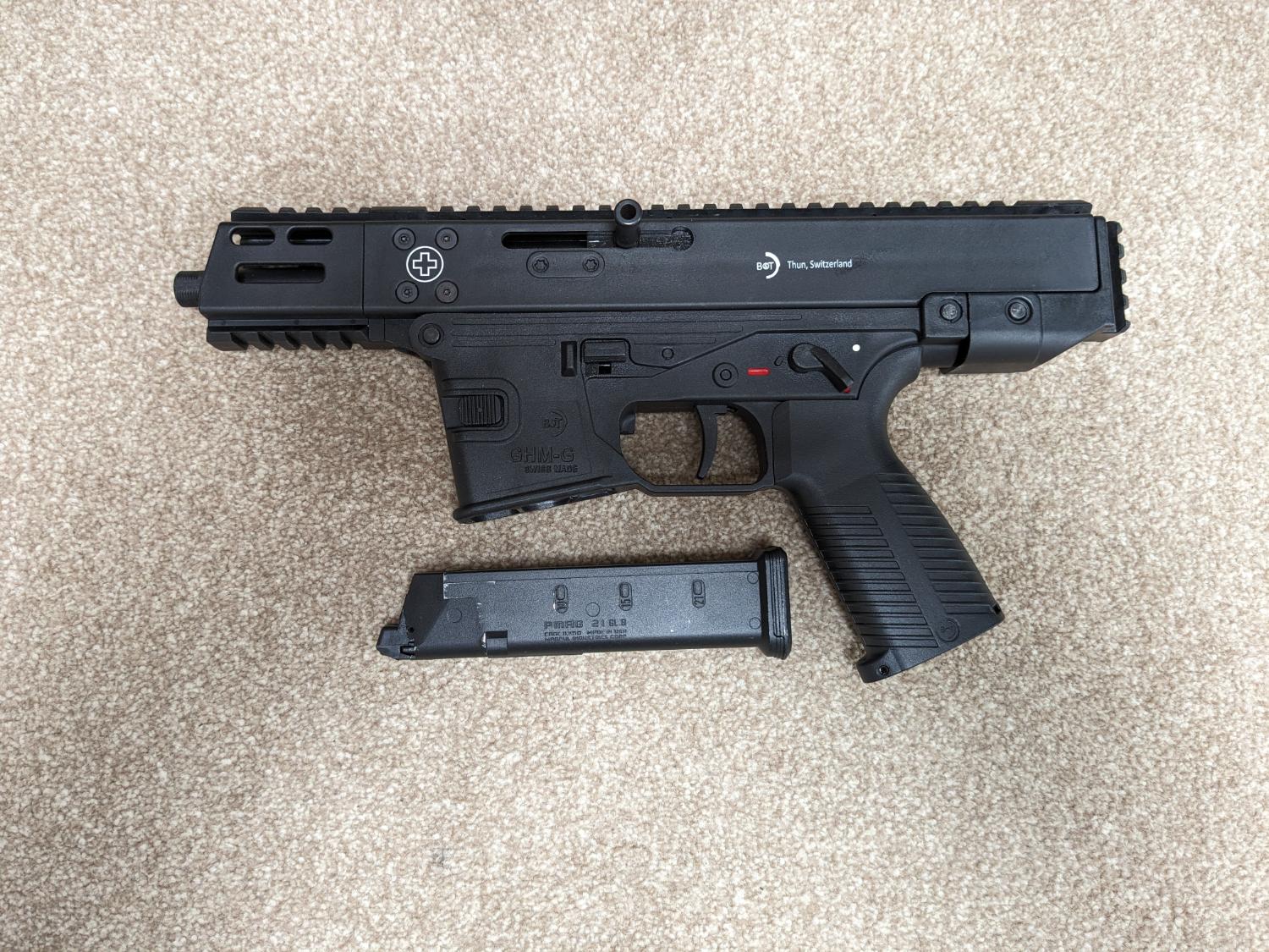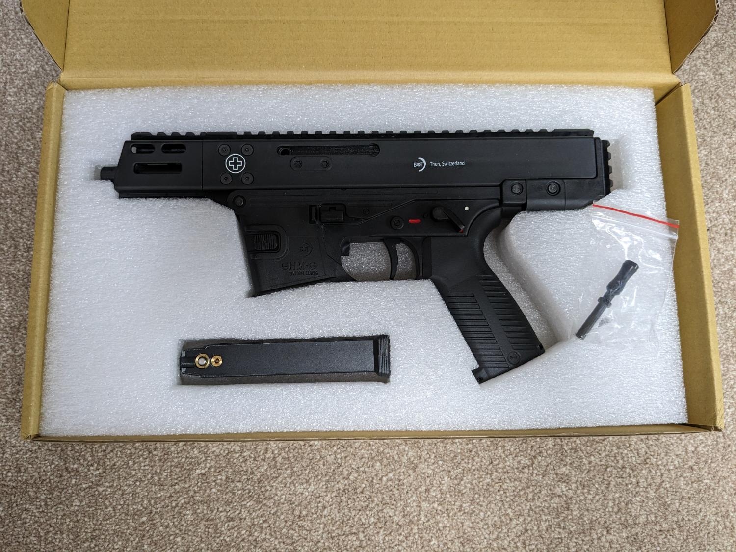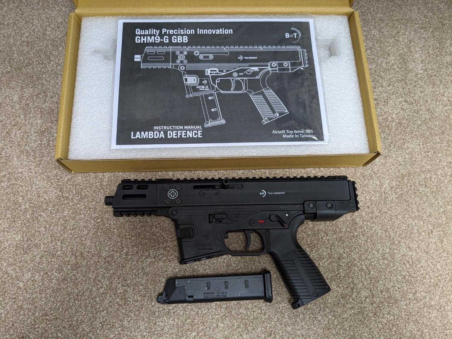 Lambda Defence ghm-9 gbb with full b&t markings. Only used in one game so pretty much as new. Great smg with a nice realistic rate of fire. Jaeger precision's gun of the year 2023, check the video on YouTube. Comes boxed with charging handle, parts diagram and 1 leak free mag.