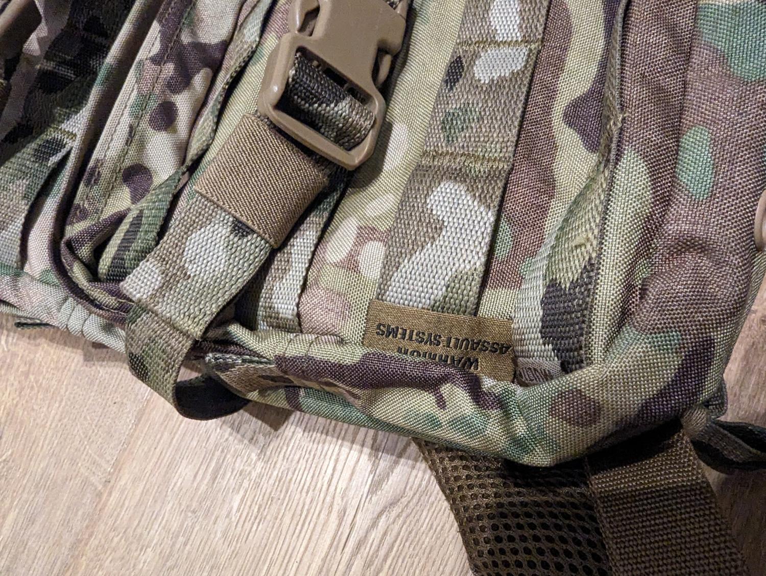 WAS Cargo Pack Bag in Multicam, the straps detach and you can thread this on to the back of a plate carrier, I used this to hold the bottle and reg for my MTW and worked perfect.